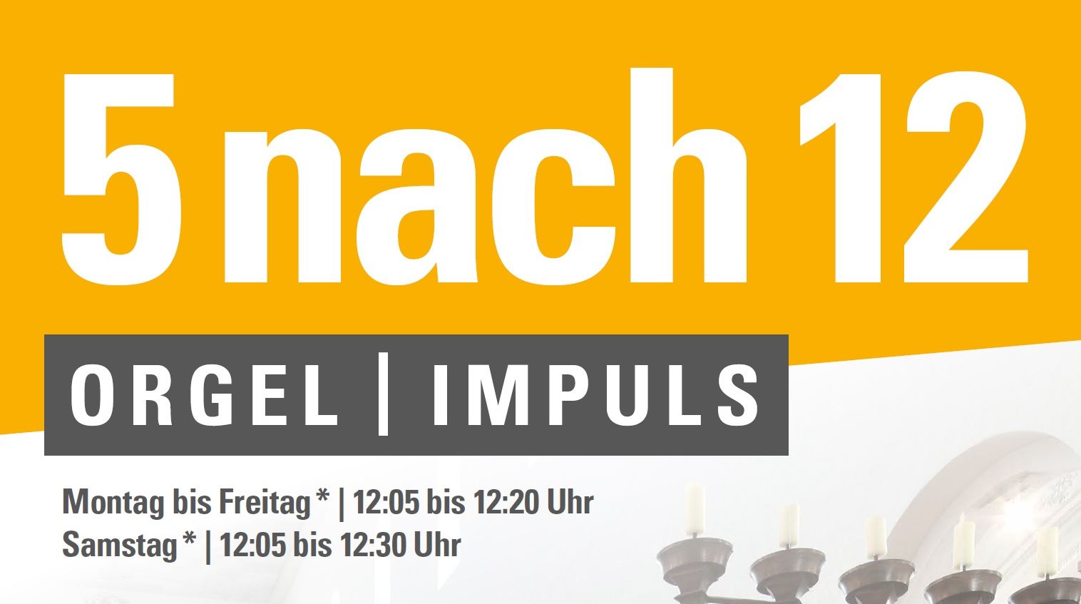 Von Dienstag nach Ostern 7. April bis Ende Oktober erklingt von Montag bis Samstag um 12:05 Uhr die große Domorgel und verschiedene Sprecherinnen und Sprecher regen mit einem kurzen Impuls zum Innehalten und Nachdenken an.