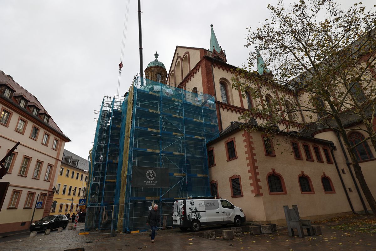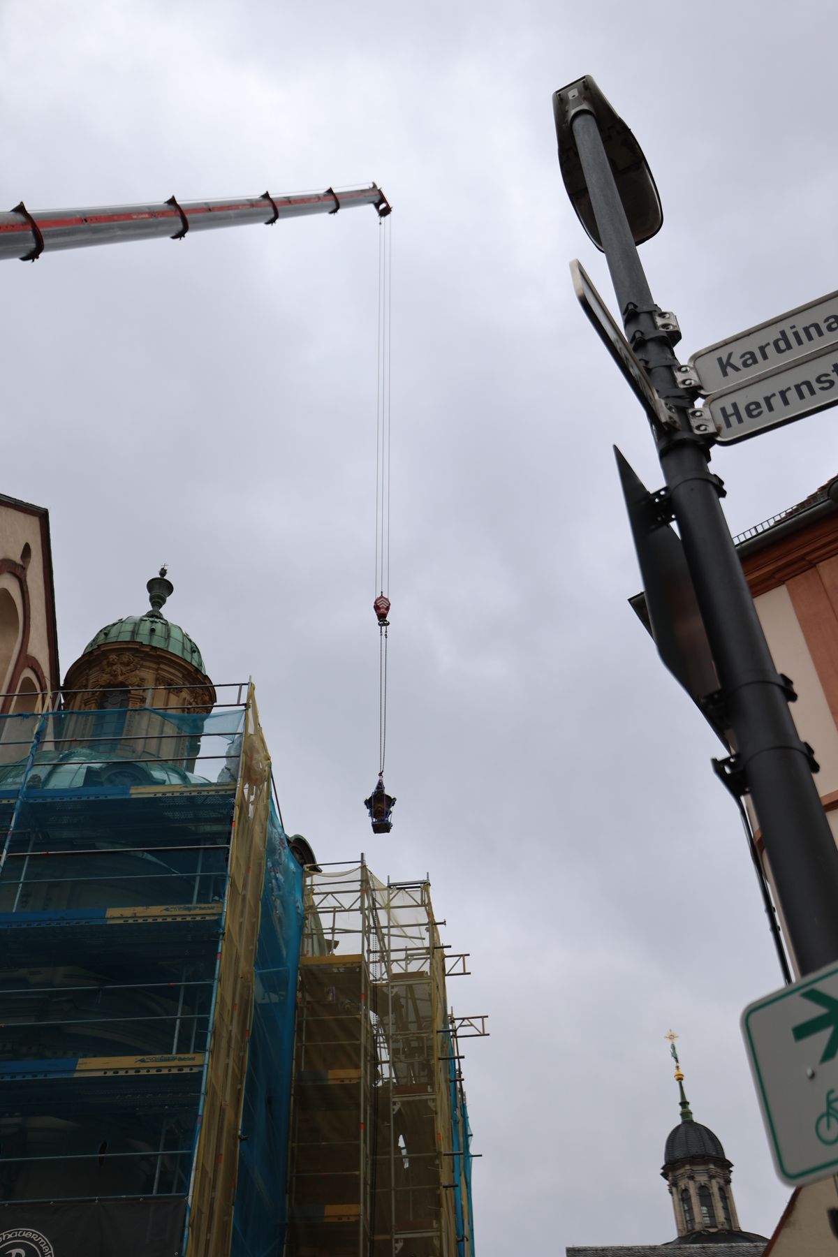 Würzburg (POW) Mit einem Schwerlastkran sind am Mittwoch, 20. November, die zehn je etwa 1,60 Meter hohen und rund 200 Kilogramm schweren sogenannten Vasen vom Dach der Schönbornkapelle des Würzburger Kiliansdoms abgenommen worden. „Ich freue mich, dass die Arbeiten jetzt endlich losgehen“, sagte Dompropst Weihbischof Paul Reder.
