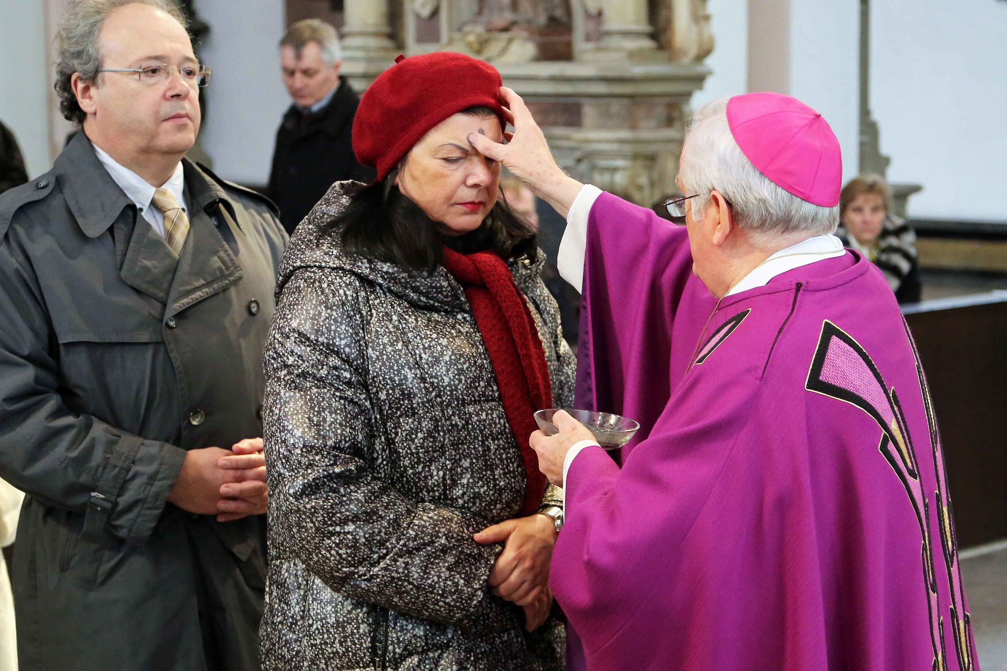 Würzburg (POW) Beim traditionellen Aschermittwoch der Künstler hat Bischof Dr. Friedhelm Hofmann das künstlerische Schaffen mit einer Spurensuche nach Gott verglichen. Erstmals hing vor dem Chorbogenkreuz das neue Fastentuch, das die Kölner Textilkünstlerin Martha Kreutzer-Temming für den Würzburger Kiliansdom geschaffen hat. Er hoffe, dass mit diesem Fastentuch eine alte Tradition weitergeführt werde, „die uns durch äußere Verhüllung zu einer inneren Begegnung mit dem Verborgenen führt“, sagte der Bischof. An der Messfeier am Mittwochvormittag, 1. März, nahmen rund 450 Künstler und Kunstschaffende aus Unterfranken teil. Bischof Hofmann, Dompropst Weihbischof Ulrich Boom, Generalvikar Dr. Dominik Meiering (Erzbistum Köln), Domvikar Dr. Burkhard Rosenzweig, Domvikar Vizeoffizial Thomas Drexler und Diakon Thomas Pfeifer legten den Künstlern das Aschenkreuz auf. Im Anschluss sprach Meiering im Burkardushaus über das Thema „Verhüllen und Offenbaren. Von verhüllenden Bildern und offenbarenden Vorhängen“.