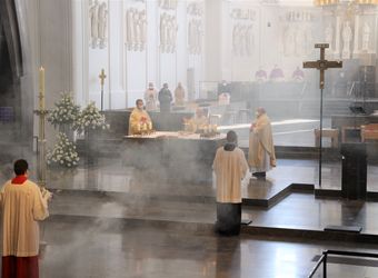 Bei der anschließenden Eucharistiefeier im Kiliansdom führte Dompropst Weihbischof Boom den neuen Domkapitular an seinen Platz im Chorgestühl. In seiner Predigt erinnerte der Weihbischof daran, dass bei der Ausbreitung des Glaubens an den Auferstandenen laut Apostelgeschichte die Jünger Jesu erstmals in Antiochia als Christen bezeichnet worden seien. „Der Name sagt, um was es geht. An ihrem Handeln und in ihrem Lebensstil ist zu erkennen, für wen sie stehen – bis in unsere Tage: In Würzburg, Baunach, überall auf der Welt nennt man die Leute immer noch Christen.“ Dabei sei die Nachfolge Jesu immer ein Nachgehen, Nachlaufen, ja Nachhinken. „Unser Vermögen ist begrenzt, was ich vermag, hat menschliche Grenzen und Unzulänglichkeiten. Aber an uns, die wir Jesus folgen, besonders aber bei denen, die in besonderer Verantwortung stehen, soll der Gute Hirte erkennbar sein“, sagte der Weihbischof. Papst Franziskus sage, gute Hirtinnen und Hirten sollten dem Menschen vorangehen und ihnen die Angst vor dem Ungewissen und dem Morgen nehmen. Sie sollten mitten unter den Menschen sein und den Gestank der Welt nicht fürchten. Zudem seien sie gefordert, den Menschen nachzugehen und dafür zu sorgen, dass keiner verlorengehe, und zugleich darauf zu vertrauen, dass die Menschen ein Gespür haben für guten Weidegrund. Es gelte, hoffnungsvoll und zuversichtlich den Weg zu gehen, „weil der Gute Hirte uns vorangeht, unter uns ist und uns nachgeht“.