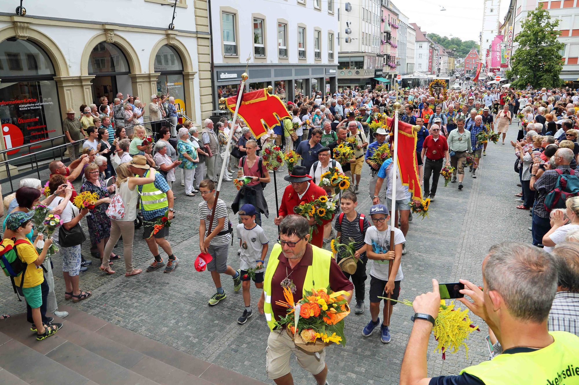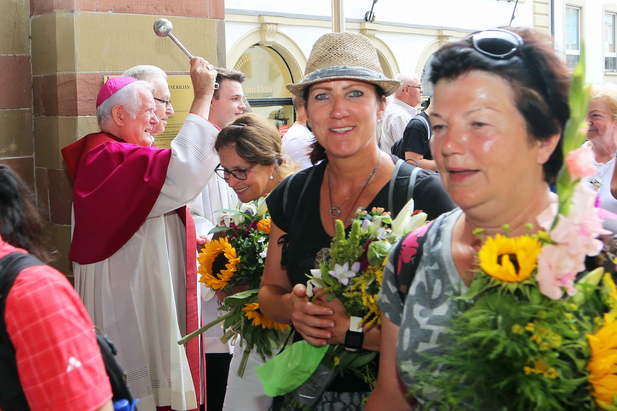 „Sie gehören zum progressiven Teil der Kirche“, begrüßte Bischof Dr. Friedhelm Hofmann die Pilger, vor allem die vielen Kinder und Jugendlichen. Sie hätten sich auf den Weg gemacht und ihre Bitten und Sorgen am Heiligen Berg der Franken abgeladen. „Nun werden Sie mit Blumen beschenkt, weil die Menschen Ihnen dankbar sind.“ Es sei manchmal nicht einfach, auf Gott zu vertrauen, fuhr der Bischof fort. „Viele Menschen sind in großer Not und Lebensgefahr und das bedrückt uns. Aber wir sind nicht allein auf uns zurückgeworfen“, betonte er. Franziskaner-Minorit Pater Maximilian M. Bauer, Präses der Bruderschaft zum Heiligen Kreuz Würzburg, dankte allen Pilgern und allen, die an der Vorbereitung und Durchführung der Wallfahrt beteiligt waren, allen voran dem neuen Wallfahrtsleiter Michael Seufert. „Danke, dass Du Ja gesagt hast zu diesem Dienst. Du hast ihn auf unserem Weg bestens ausgeübt.“ Zum Abschluss erteilten Bischof Hofmann, Weihbischof em. Helmut Bauer, Pater Maximilian Bauer sowie weitere Priester den Gläubigen den Segen. Die Kreuzbergwallfahrer waren am Sonntag, 20. August, am Würzburger Neumünster gestartet und legten innerhalb von fünf Tagen insgesamt rund 173 Kilometer zurück. Die Wallfahrt stand unter dem Motto „Den Weg mit ganzem Herzen gehen!“.