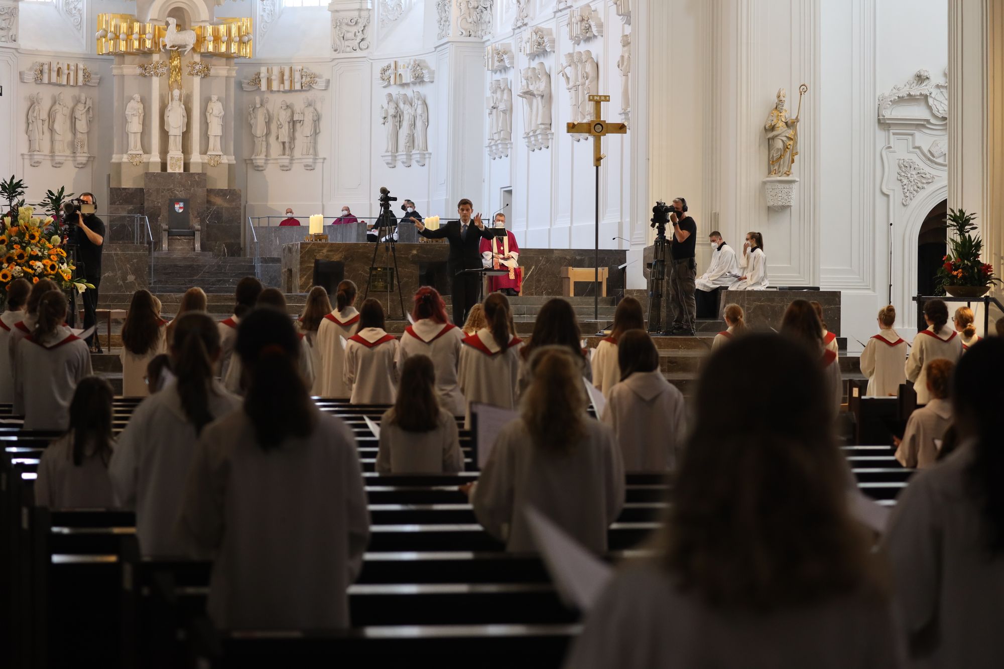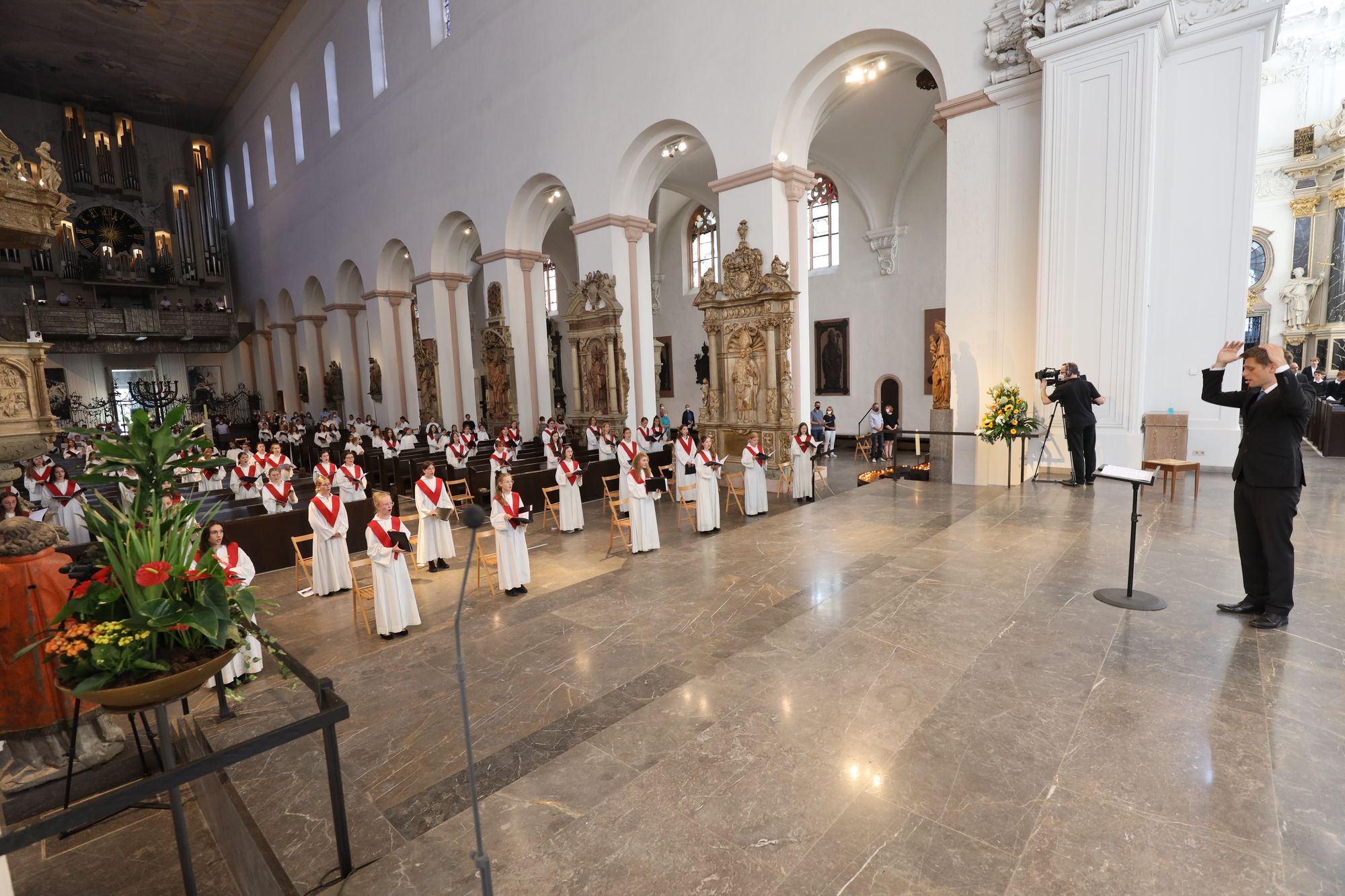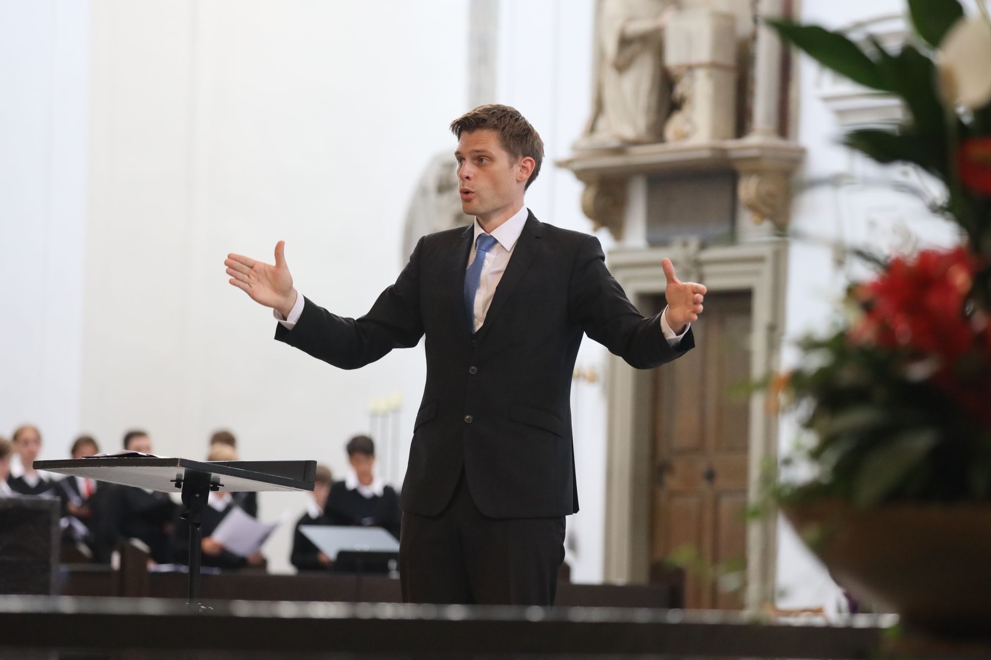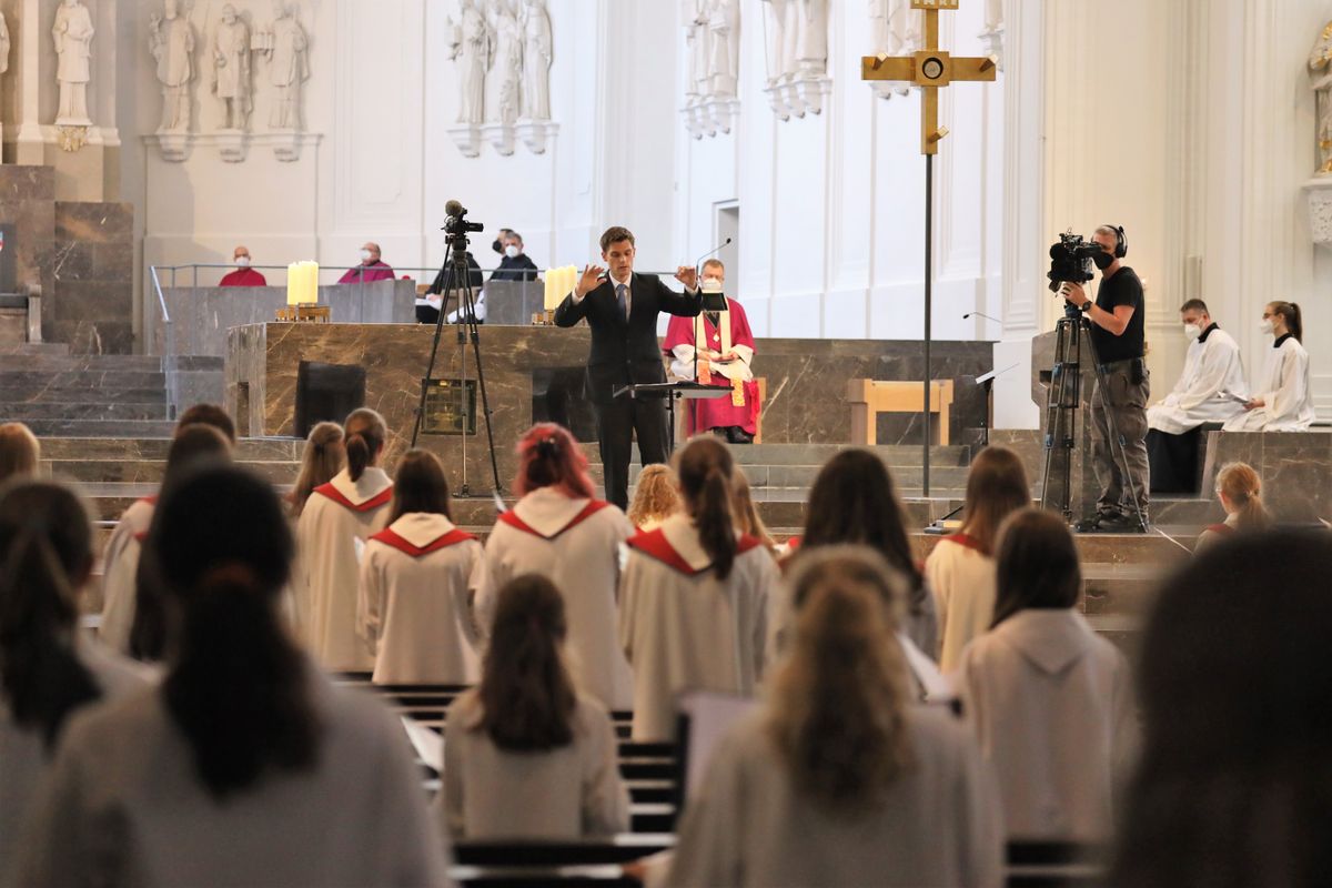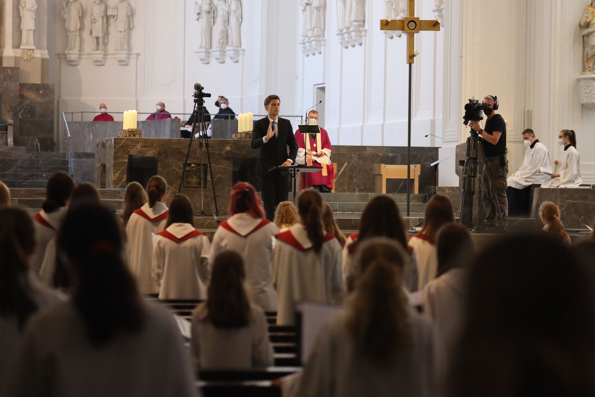 Würzburg (POW) Minutenlangen donnernden Applaus für den scheidenden Domkantor Alexander Rüth (35) hat es bei dessen Verabschiedung am Freitagabend, 23. Juli, bei einem Evensong im Würzburger Kiliansdom gegeben. Die eine oder andere Träne, die am Ende bei den Sängerinnen und Sängern von Domchor, Mädchenkantorei und Domsingknaben floss, zeigte, wie viel Wertschätzung Rüth sich in den vergangenen zehn Jahren in Würzburg erarbeitet hat. Zum 1. September 2021 wechselt er als Münsterchordirektor nach Konstanz am Bodensee. Dem Gottesdienst, der live im Internet übertragen wurde, stand Domdekan Generalvikar Dr. Jürgen Vorndran als Offiziant vor.