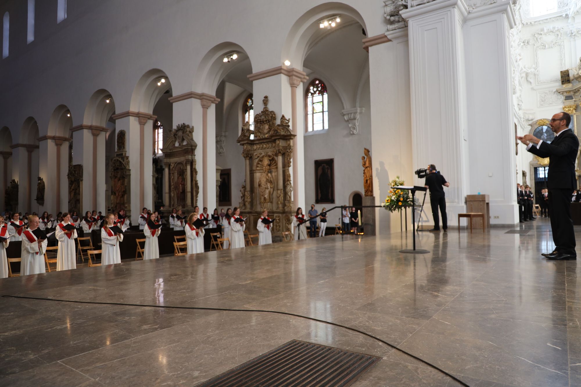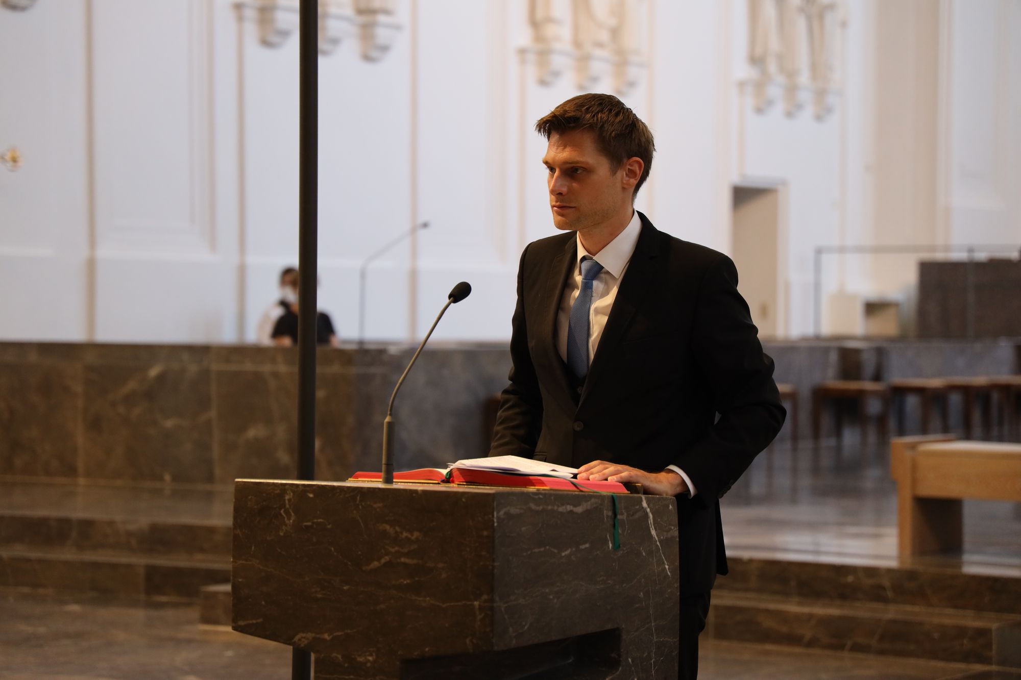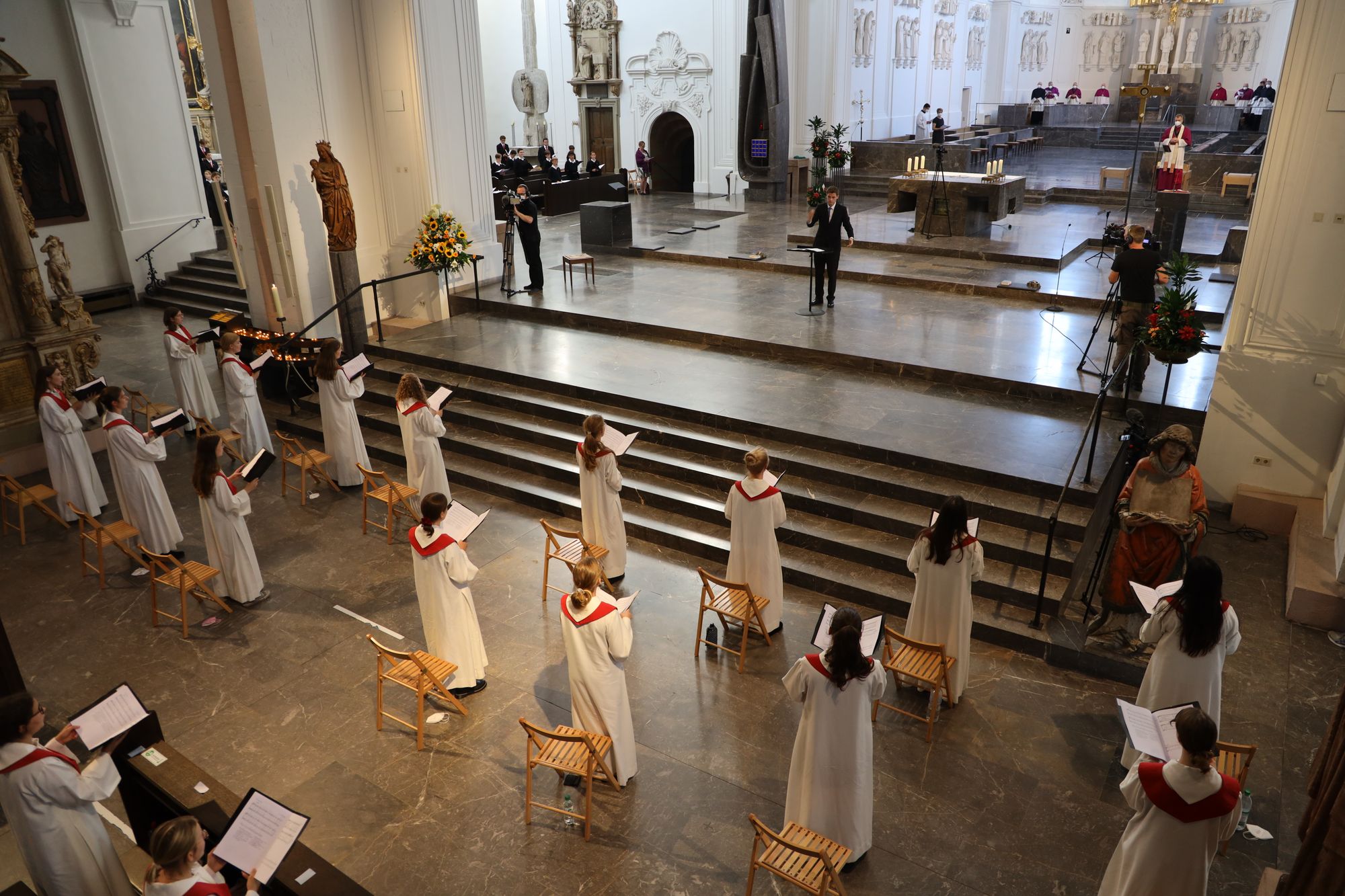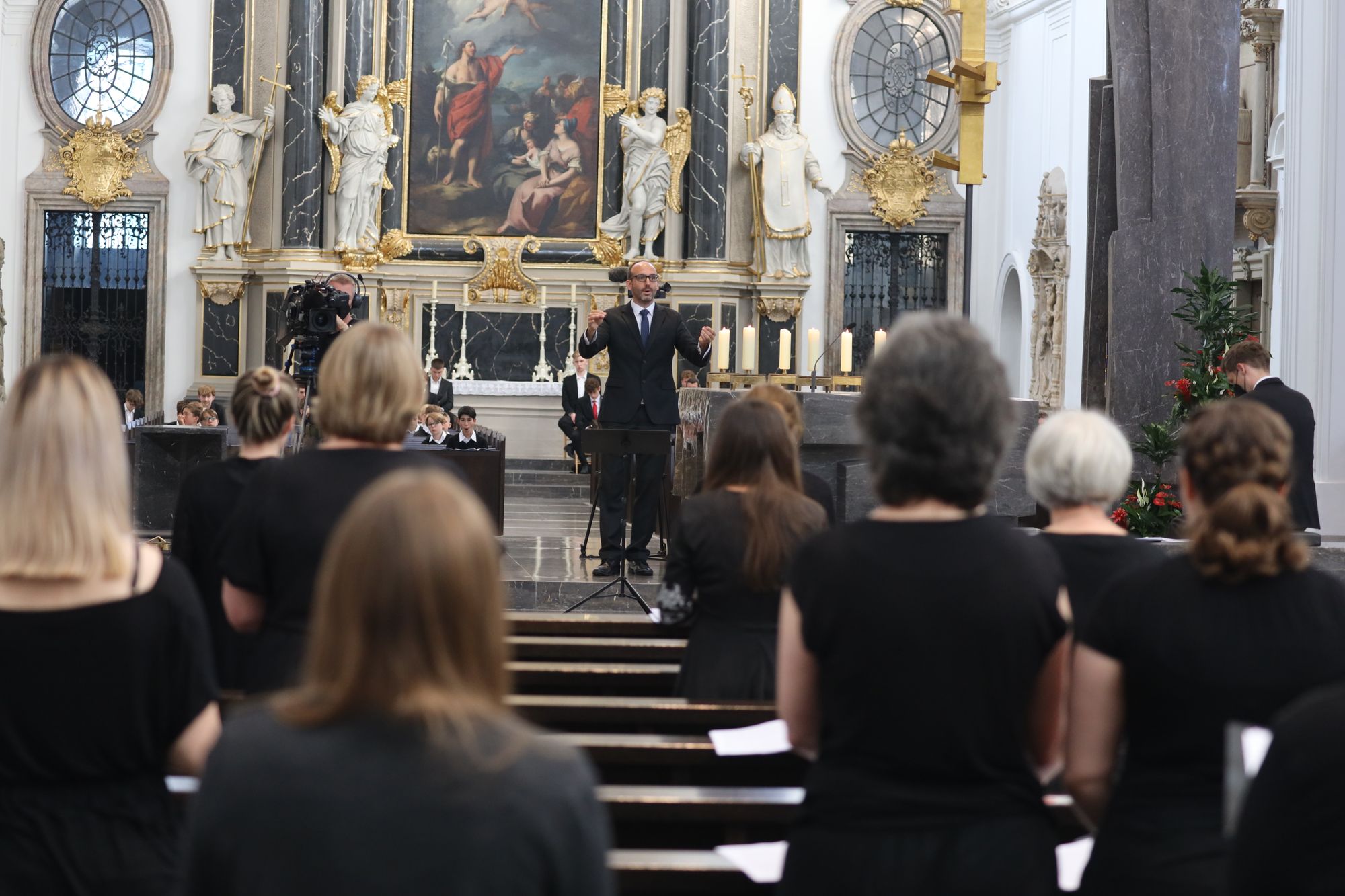 Würzburg (POW) Minutenlangen donnernden Applaus für den scheidenden Domkantor Alexander Rüth (35) hat es bei dessen Verabschiedung am Freitagabend, 23. Juli, bei einem Evensong im Würzburger Kiliansdom gegeben. Die eine oder andere Träne, die am Ende bei den Sängerinnen und Sängern von Domchor, Mädchenkantorei und Domsingknaben floss, zeigte, wie viel Wertschätzung Rüth sich in den vergangenen zehn Jahren in Würzburg erarbeitet hat. Zum 1. September 2021 wechselt er als Münsterchordirektor nach Konstanz am Bodensee. Dem Gottesdienst, der live im Internet übertragen wurde, stand Domdekan Generalvikar Dr. Jürgen Vorndran als Offiziant vor.