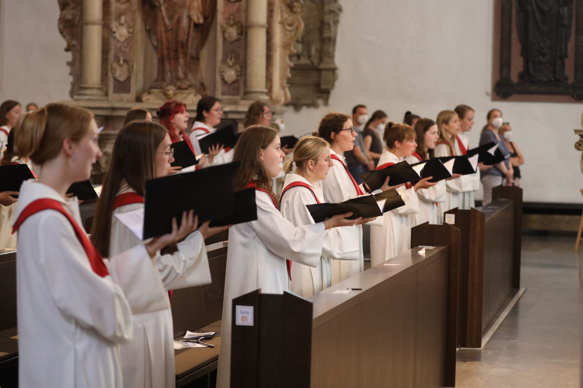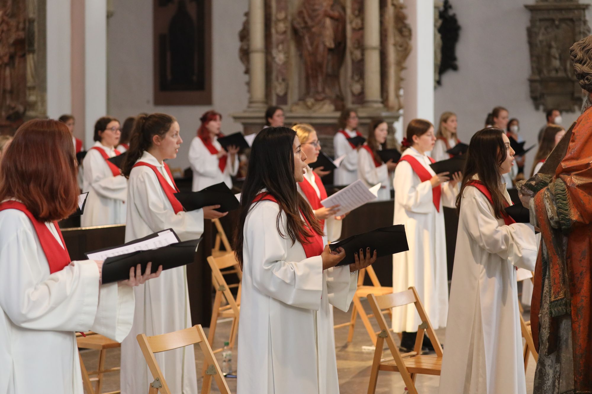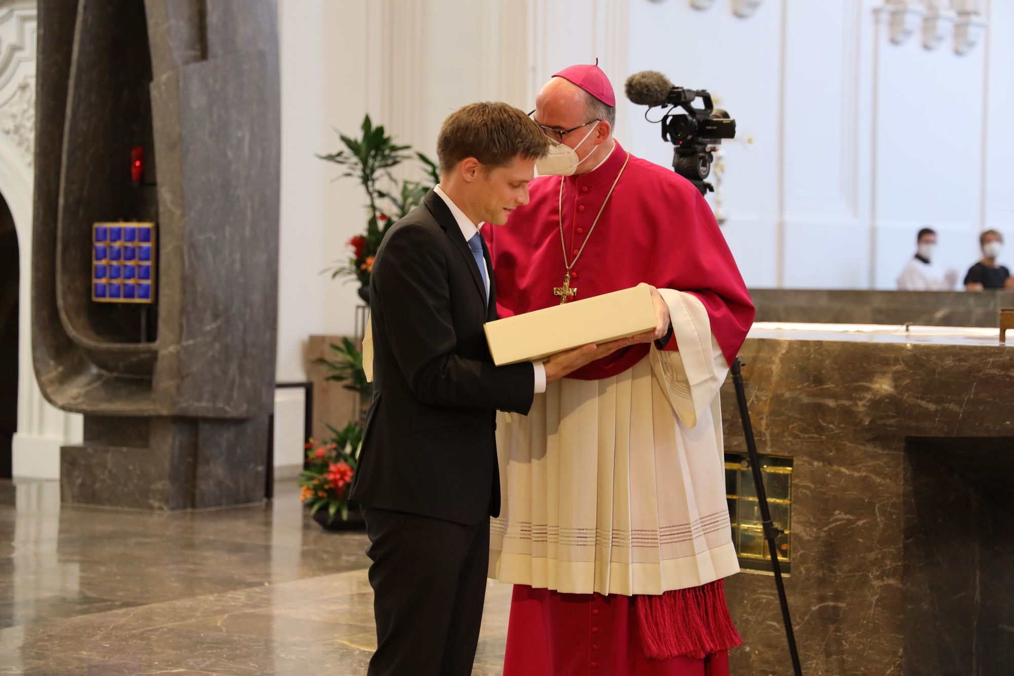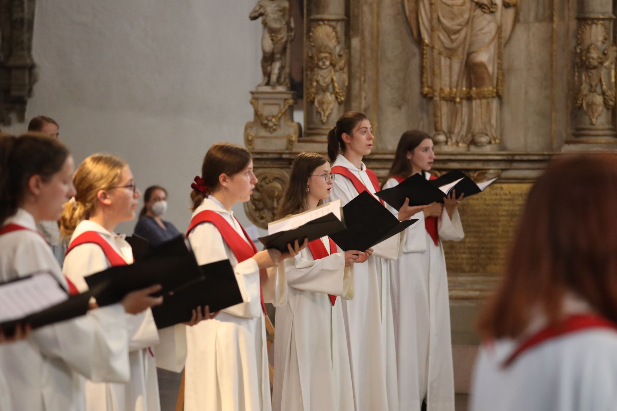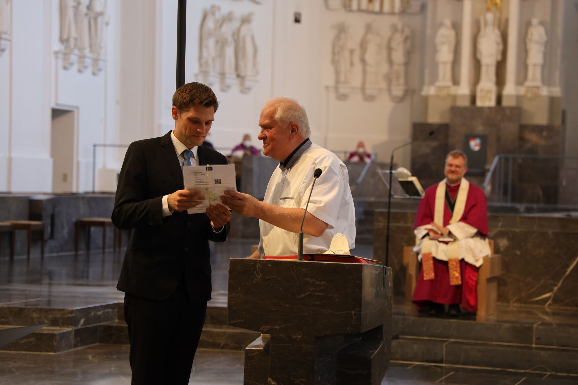 Würzburg (POW) Minutenlangen donnernden Applaus für den scheidenden Domkantor Alexander Rüth (35) hat es bei dessen Verabschiedung am Freitagabend, 23. Juli, bei einem Evensong im Würzburger Kiliansdom gegeben. Die eine oder andere Träne, die am Ende bei den Sängerinnen und Sängern von Domchor, Mädchenkantorei und Domsingknaben floss, zeigte, wie viel Wertschätzung Rüth sich in den vergangenen zehn Jahren in Würzburg erarbeitet hat. Zum 1. September 2021 wechselt er als Münsterchordirektor nach Konstanz am Bodensee. Dem Gottesdienst, der live im Internet übertragen wurde, stand Domdekan Generalvikar Dr. Jürgen Vorndran als Offiziant vor.