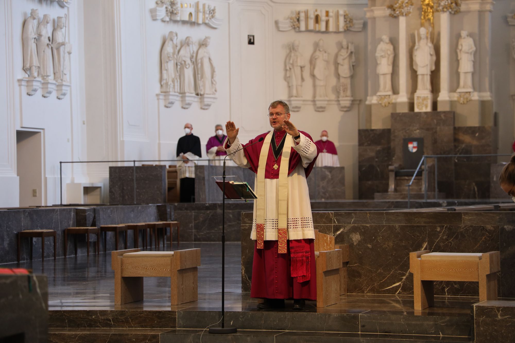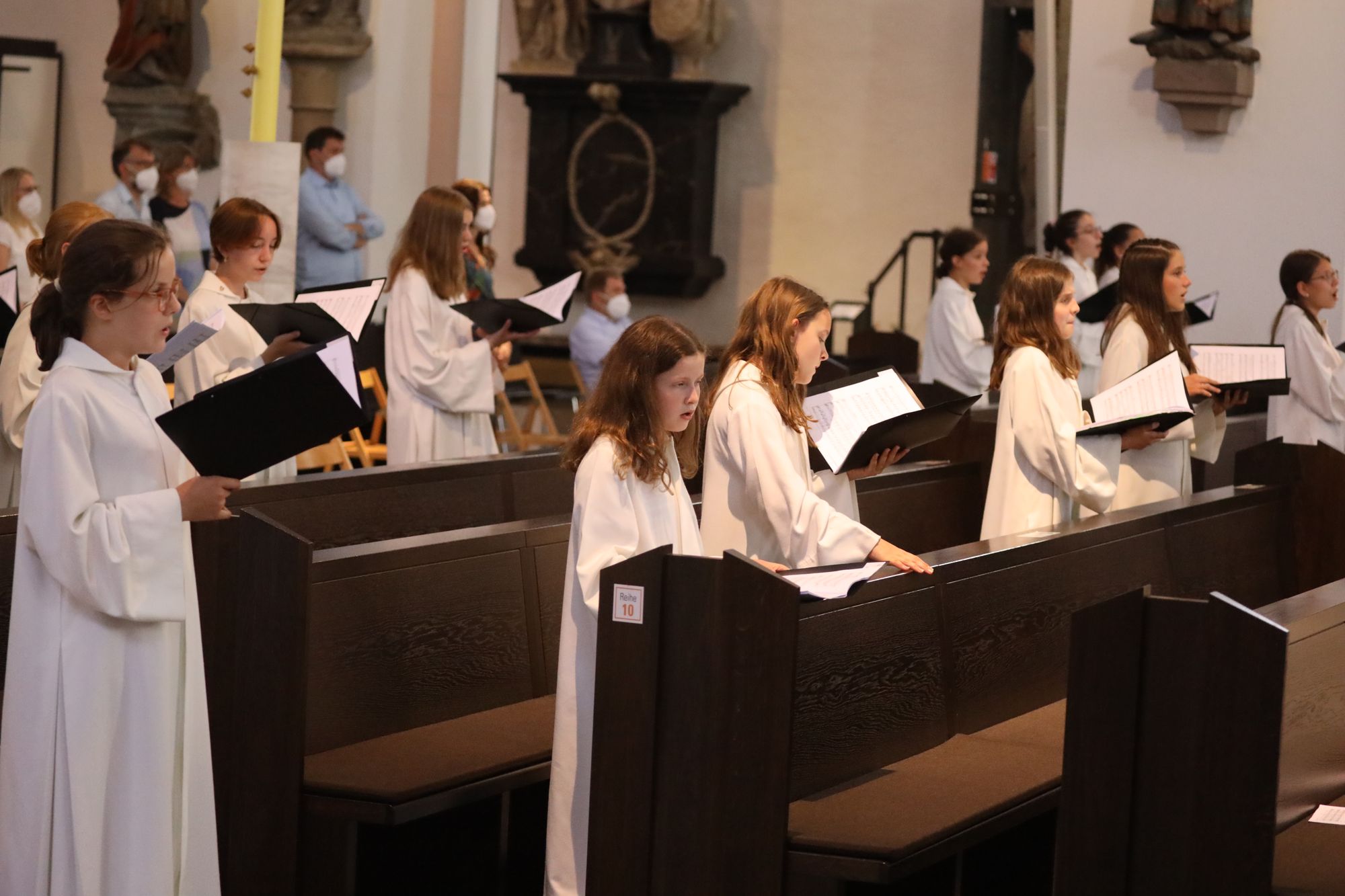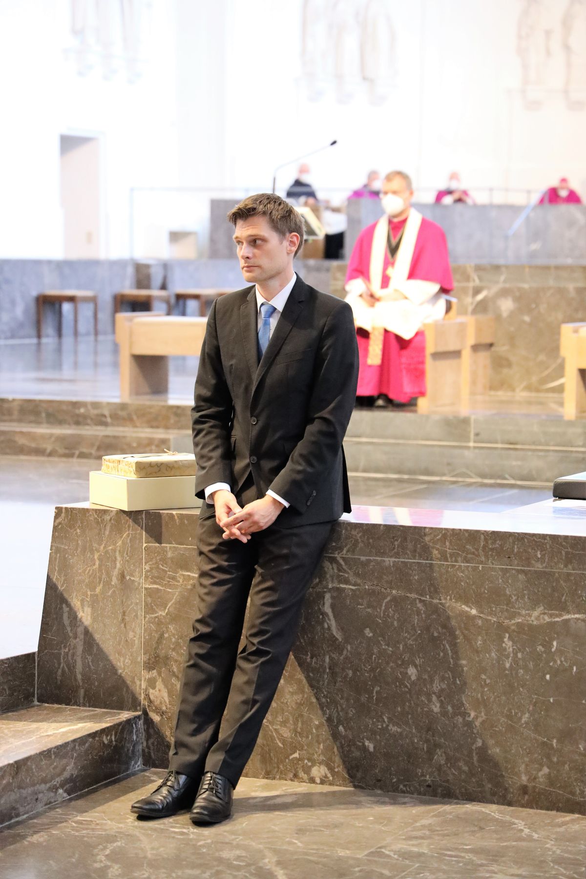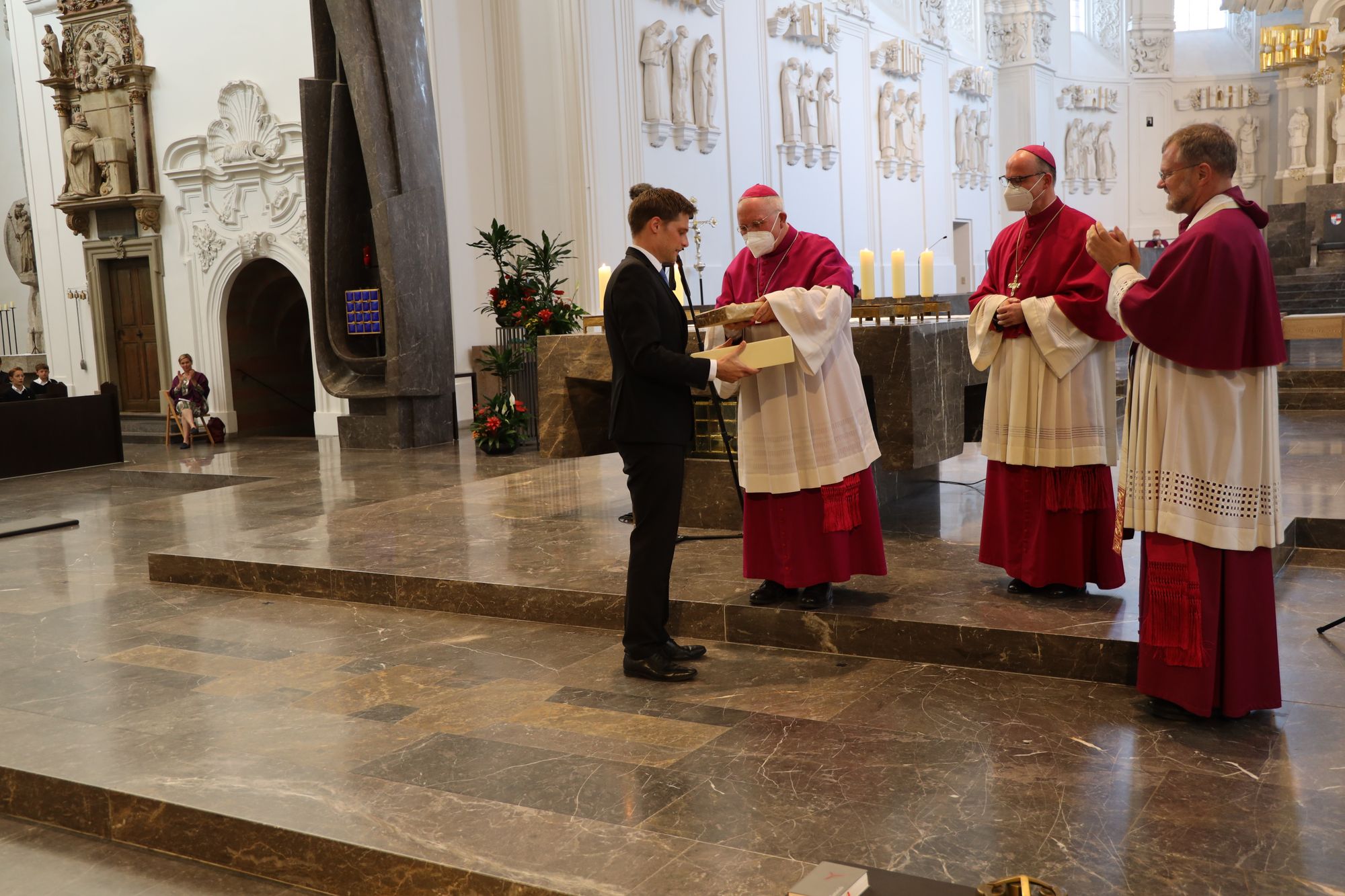 Würzburg (POW) Minutenlangen donnernden Applaus für den scheidenden Domkantor Alexander Rüth (35) hat es bei dessen Verabschiedung am Freitagabend, 23. Juli, bei einem Evensong im Würzburger Kiliansdom gegeben. Die eine oder andere Träne, die am Ende bei den Sängerinnen und Sängern von Domchor, Mädchenkantorei und Domsingknaben floss, zeigte, wie viel Wertschätzung Rüth sich in den vergangenen zehn Jahren in Würzburg erarbeitet hat. Zum 1. September 2021 wechselt er als Münsterchordirektor nach Konstanz am Bodensee. Dem Gottesdienst, der live im Internet übertragen wurde, stand Domdekan Generalvikar Dr. Jürgen Vorndran als Offiziant vor.