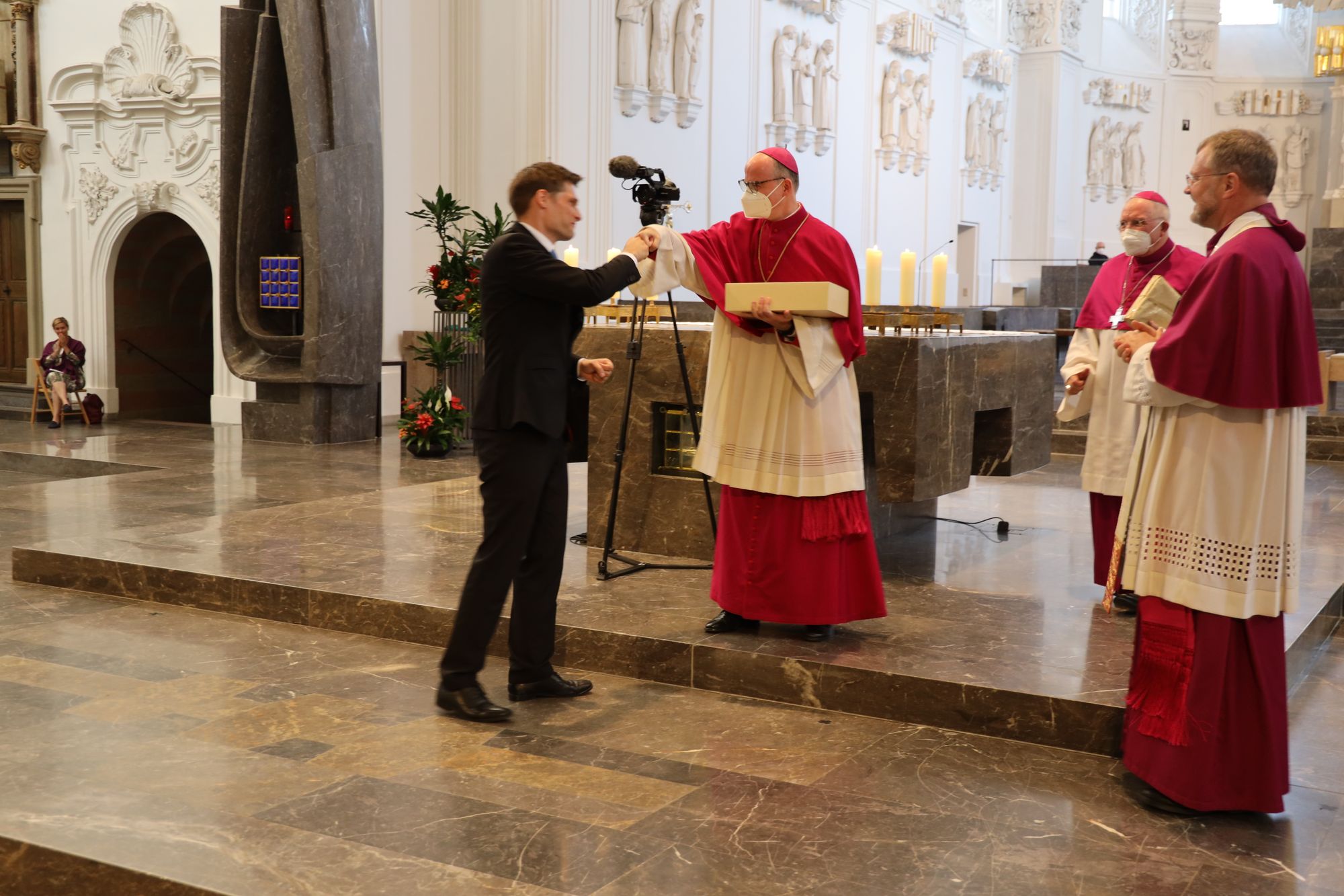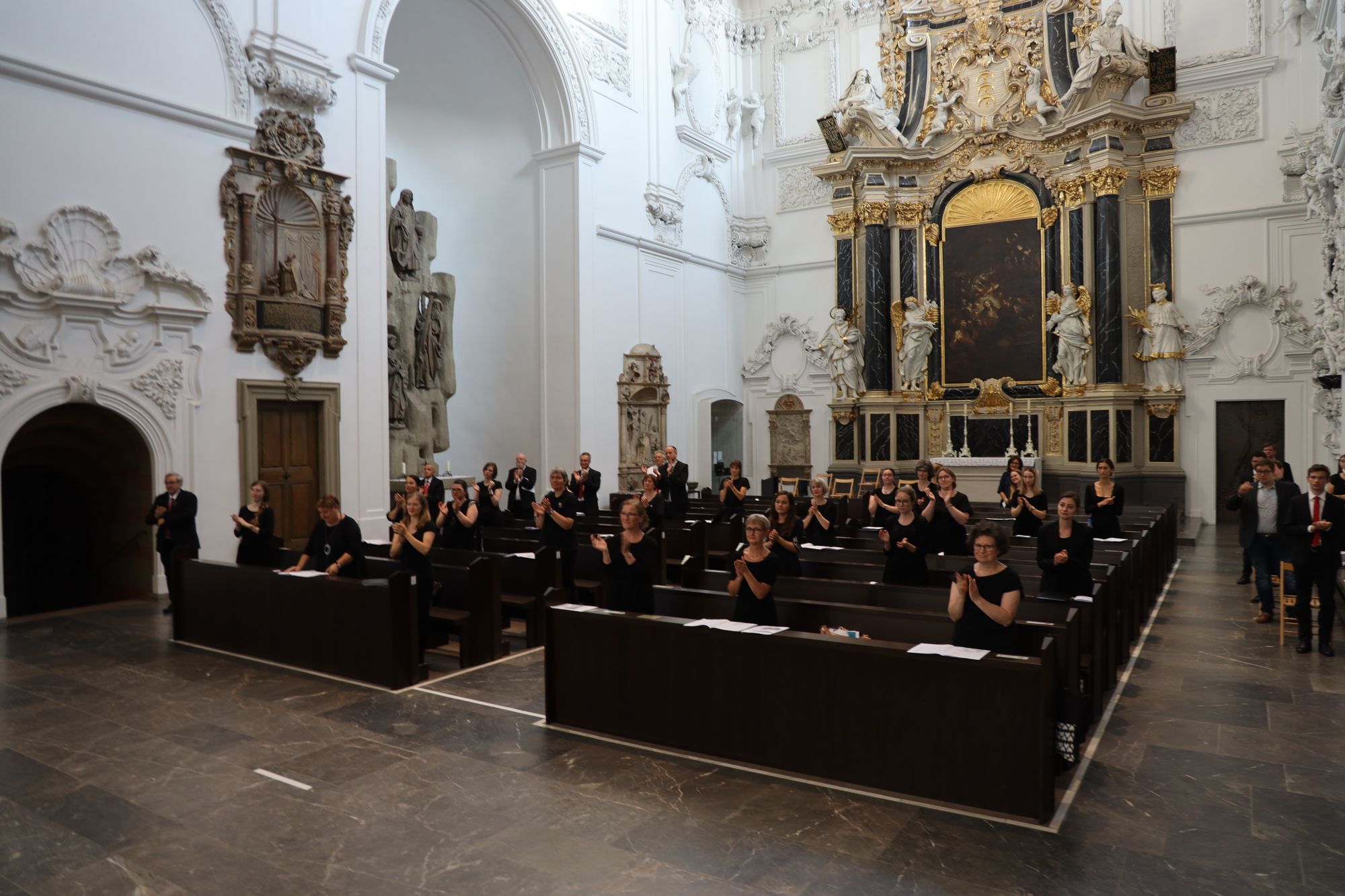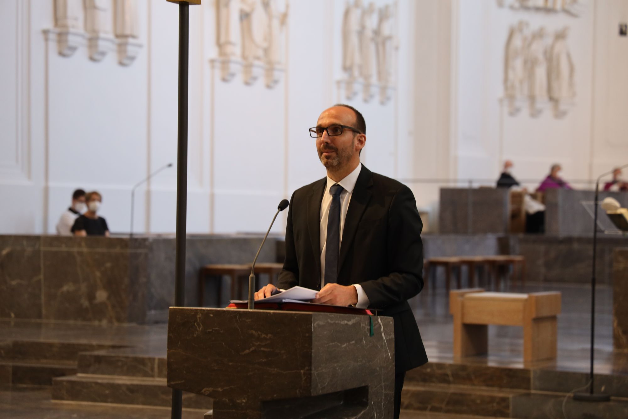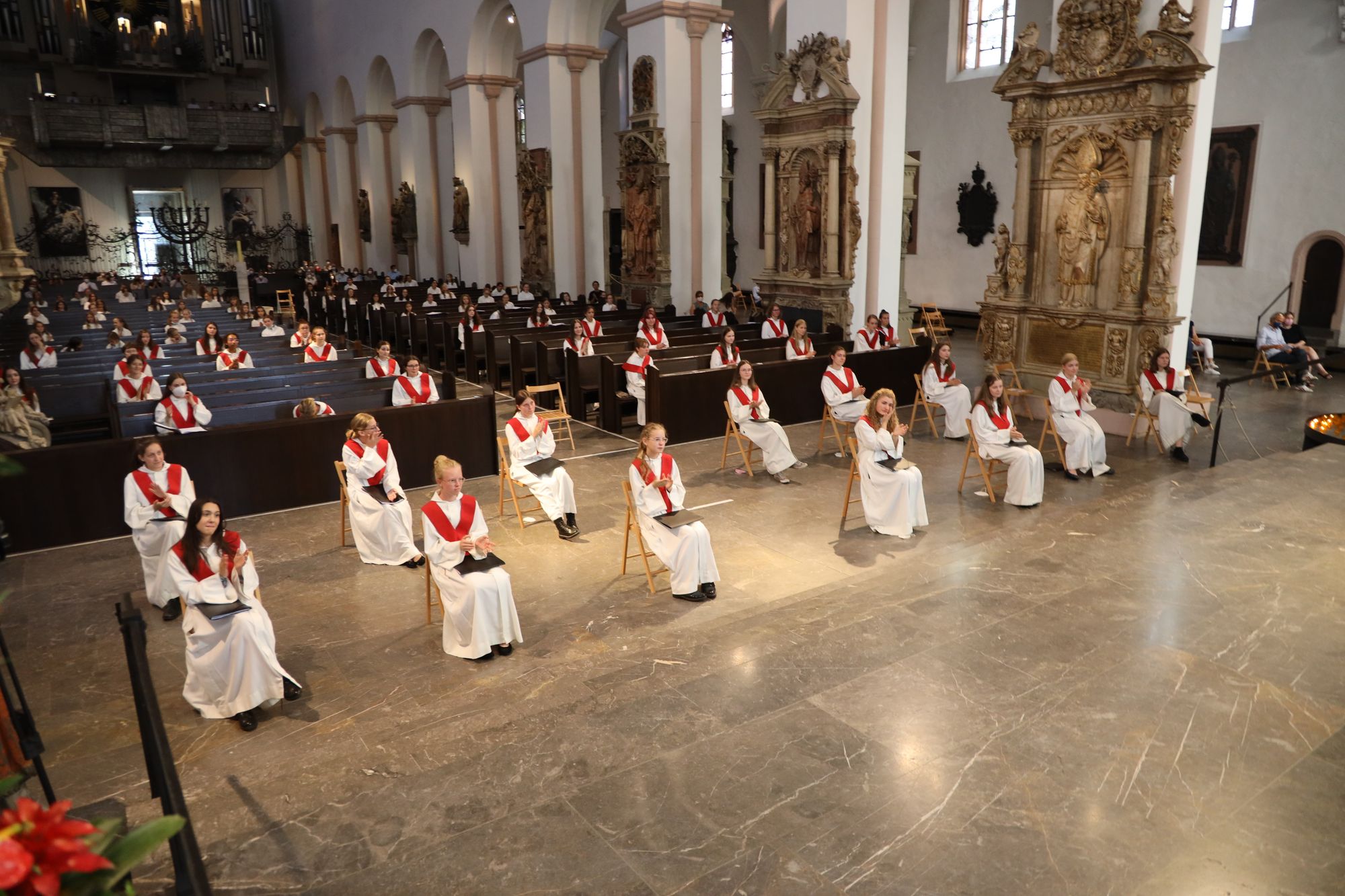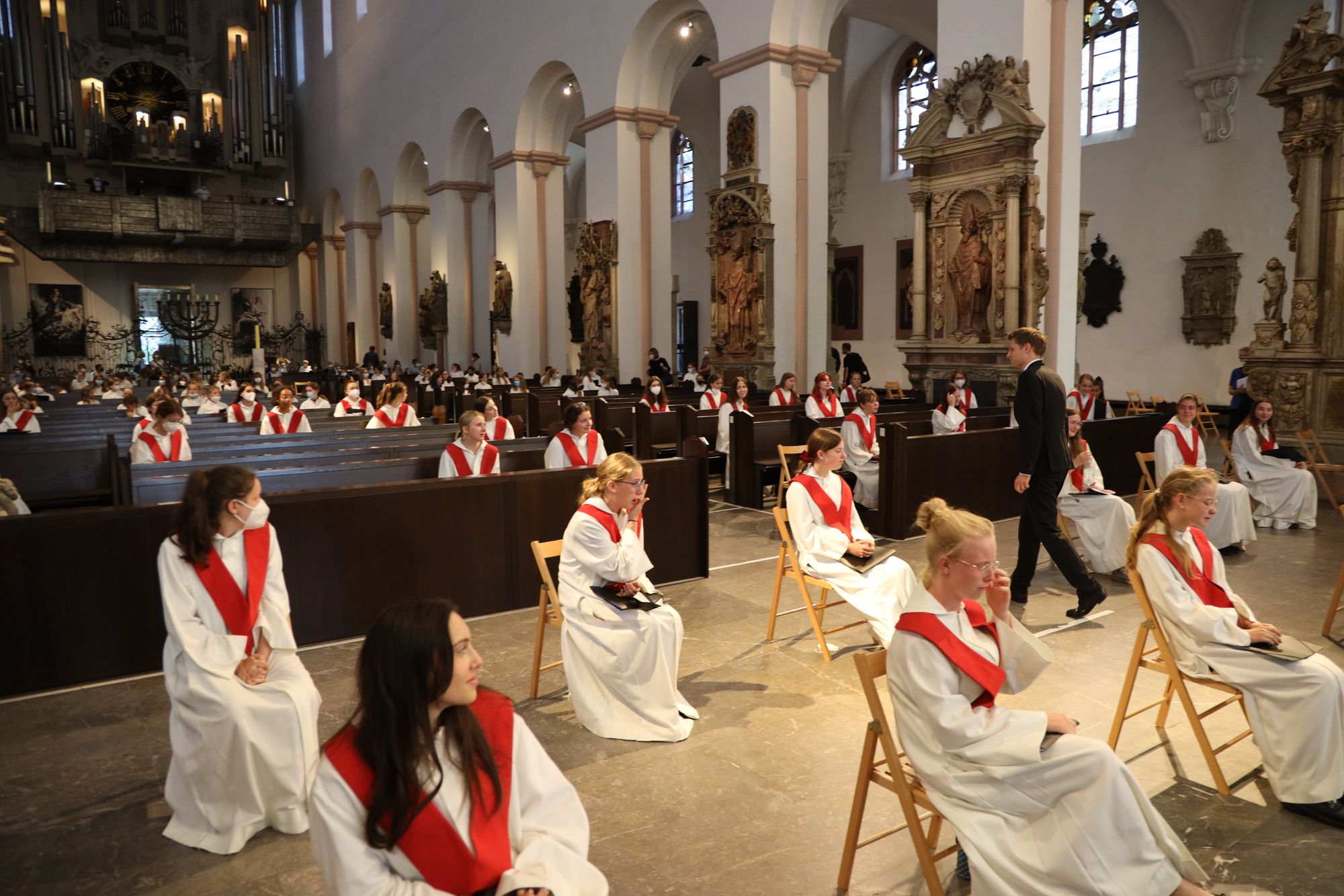 Würzburg (POW) Minutenlangen donnernden Applaus für den scheidenden Domkantor Alexander Rüth (35) hat es bei dessen Verabschiedung am Freitagabend, 23. Juli, bei einem Evensong im Würzburger Kiliansdom gegeben. Die eine oder andere Träne, die am Ende bei den Sängerinnen und Sängern von Domchor, Mädchenkantorei und Domsingknaben floss, zeigte, wie viel Wertschätzung Rüth sich in den vergangenen zehn Jahren in Würzburg erarbeitet hat. Zum 1. September 2021 wechselt er als Münsterchordirektor nach Konstanz am Bodensee. Dem Gottesdienst, der live im Internet übertragen wurde, stand Domdekan Generalvikar Dr. Jürgen Vorndran als Offiziant vor.
