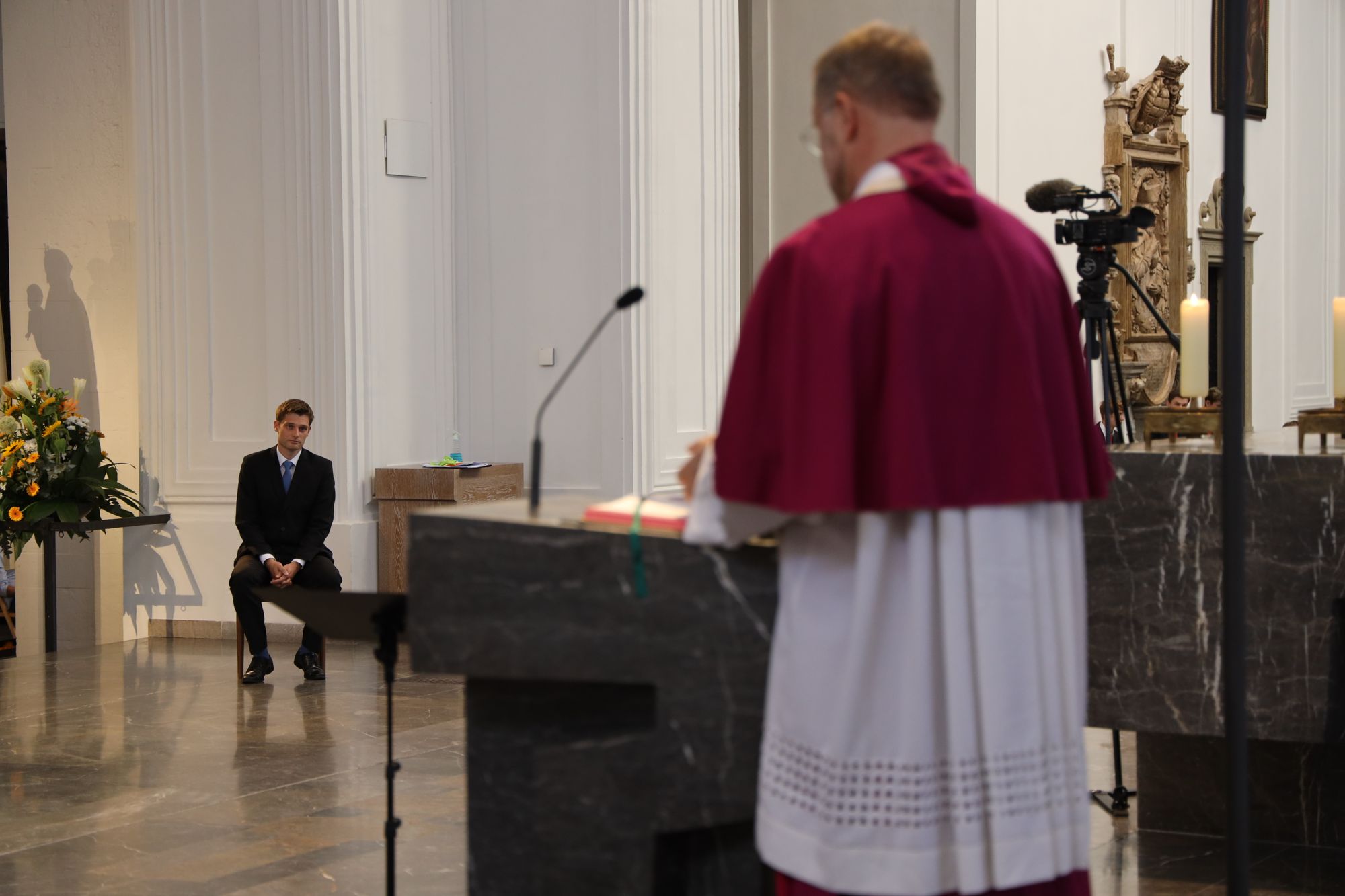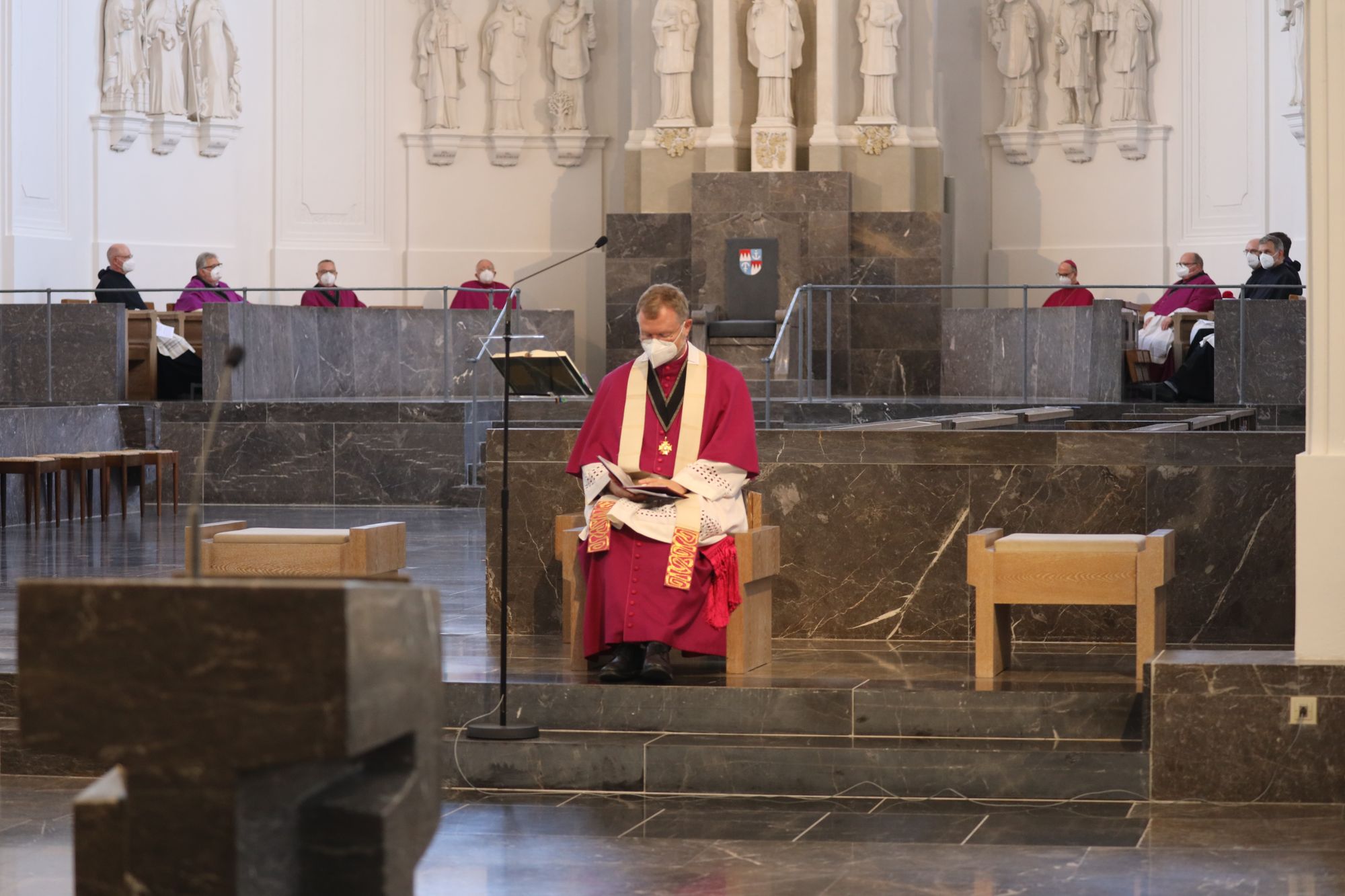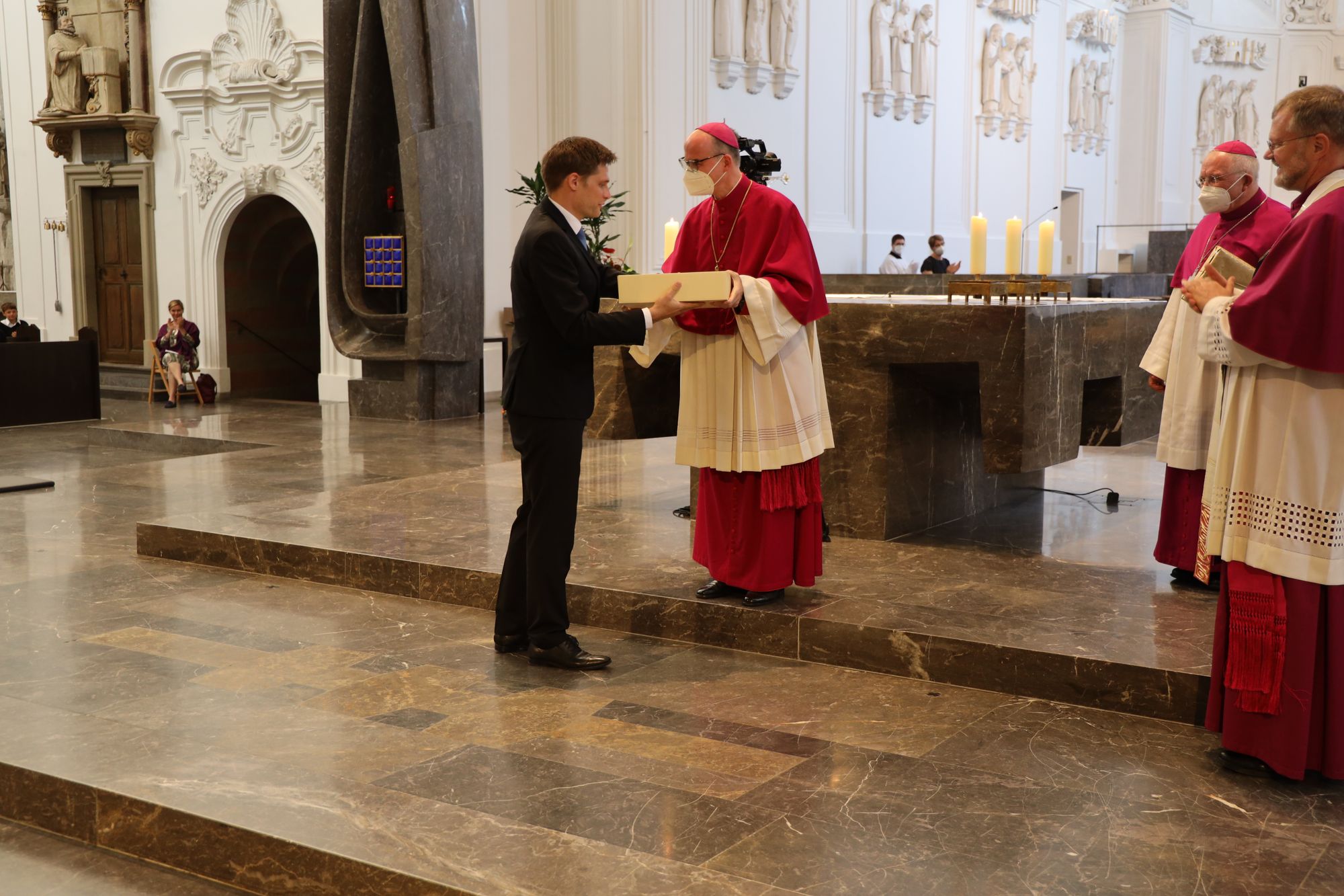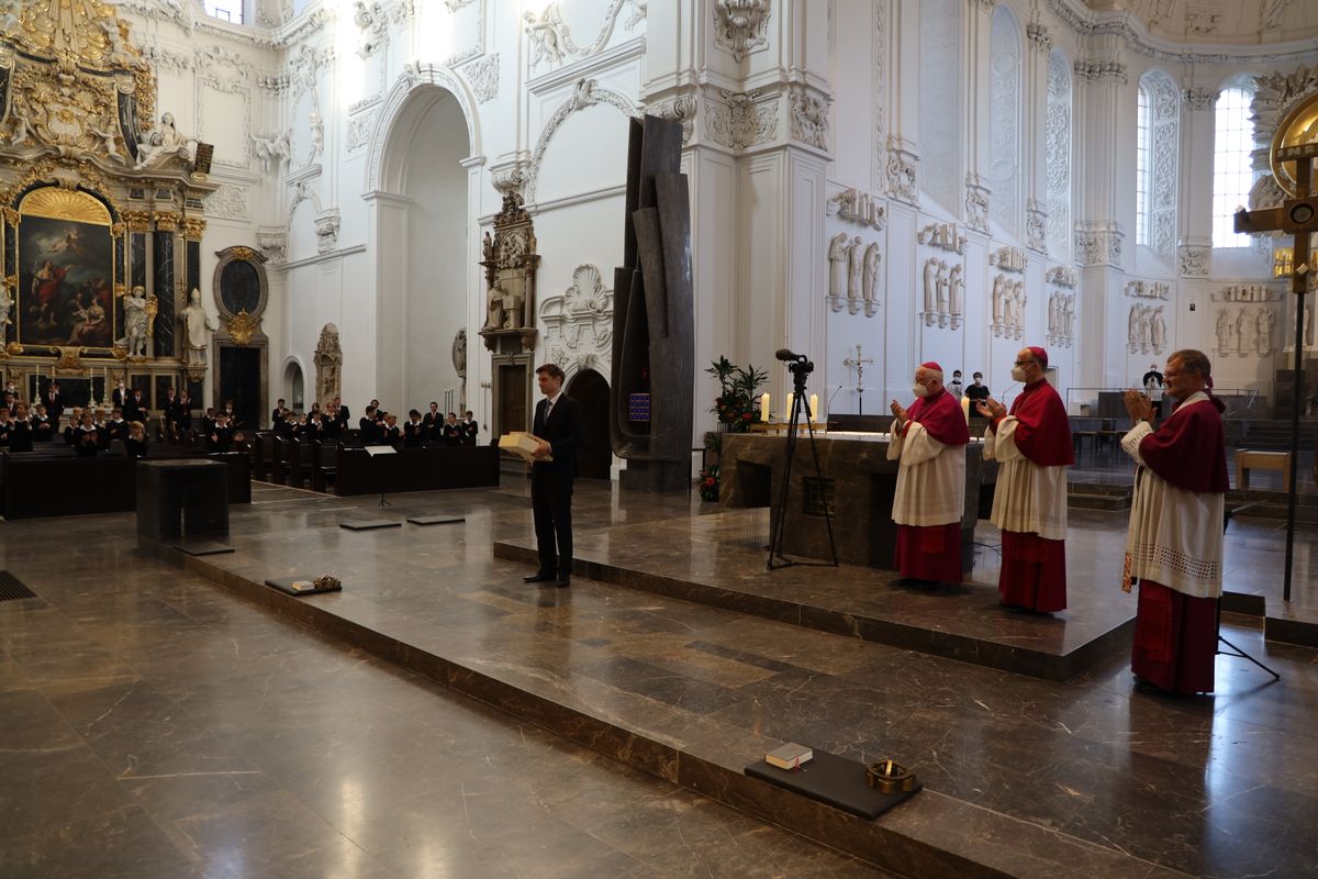 Würzburg (POW) Minutenlangen donnernden Applaus für den scheidenden Domkantor Alexander Rüth (35) hat es bei dessen Verabschiedung am Freitagabend, 23. Juli, bei einem Evensong im Würzburger Kiliansdom gegeben. Die eine oder andere Träne, die am Ende bei den Sängerinnen und Sängern von Domchor, Mädchenkantorei und Domsingknaben floss, zeigte, wie viel Wertschätzung Rüth sich in den vergangenen zehn Jahren in Würzburg erarbeitet hat. Zum 1. September 2021 wechselt er als Münsterchordirektor nach Konstanz am Bodensee. Dem Gottesdienst, der live im Internet übertragen wurde, stand Domdekan Generalvikar Dr. Jürgen Vorndran als Offiziant vor.