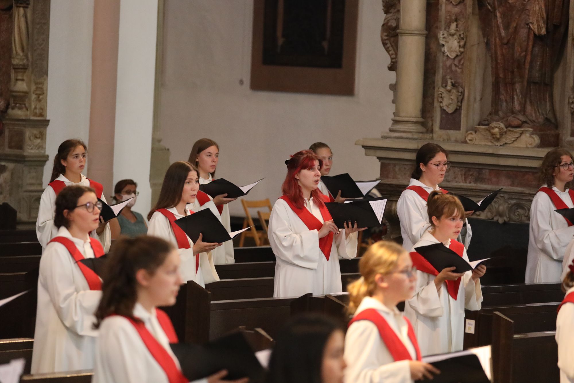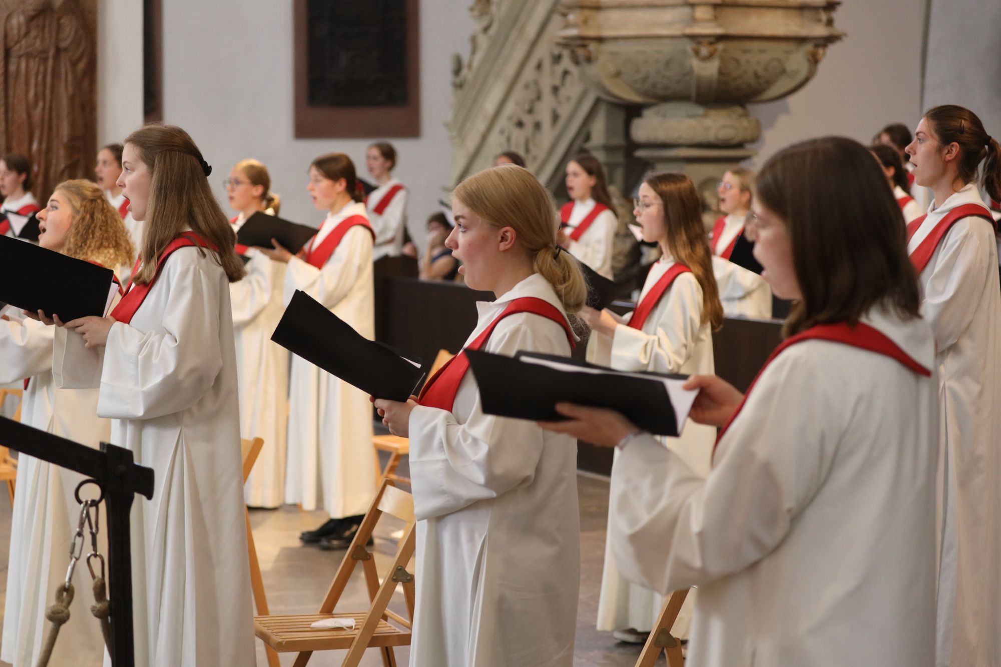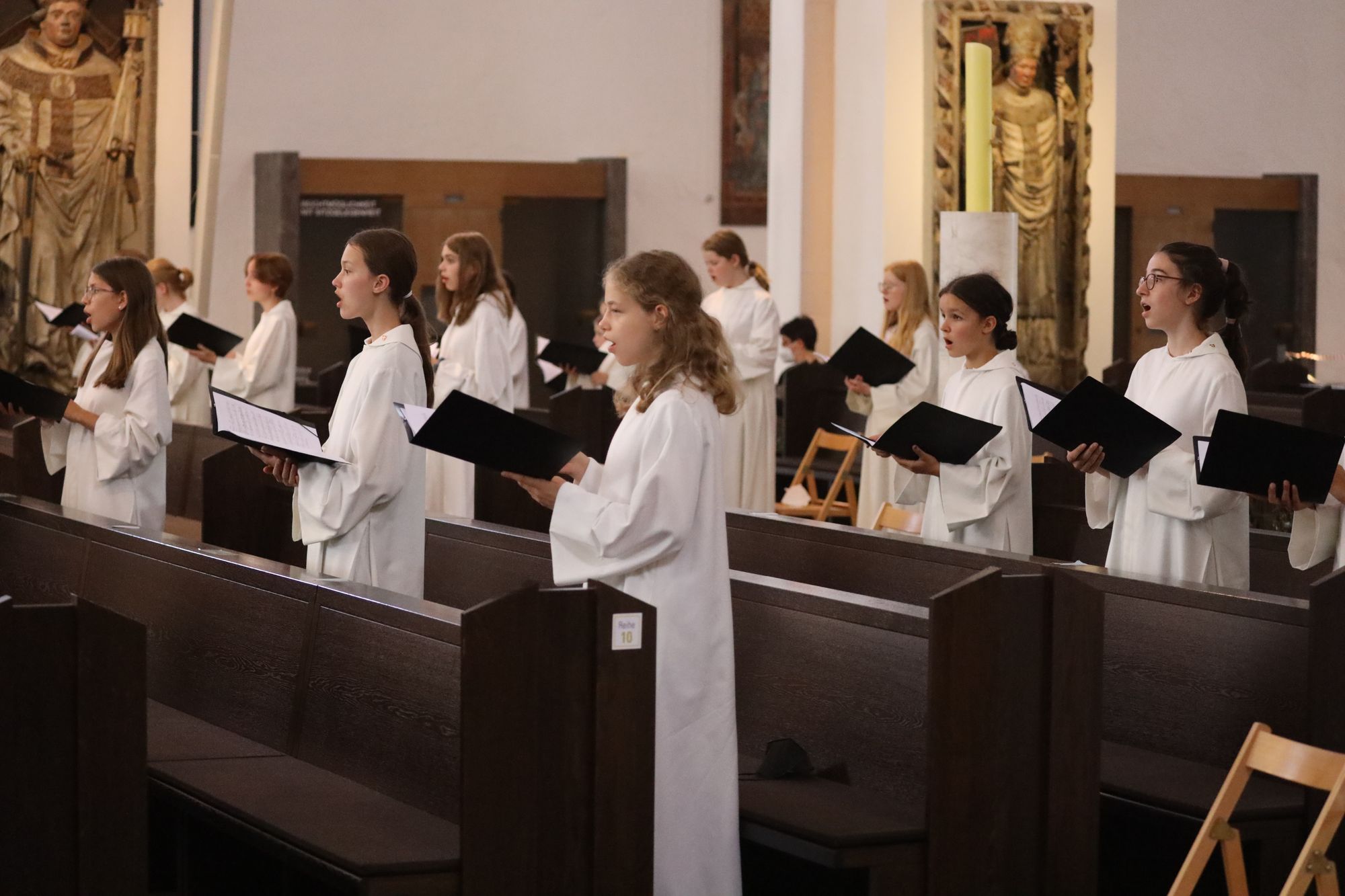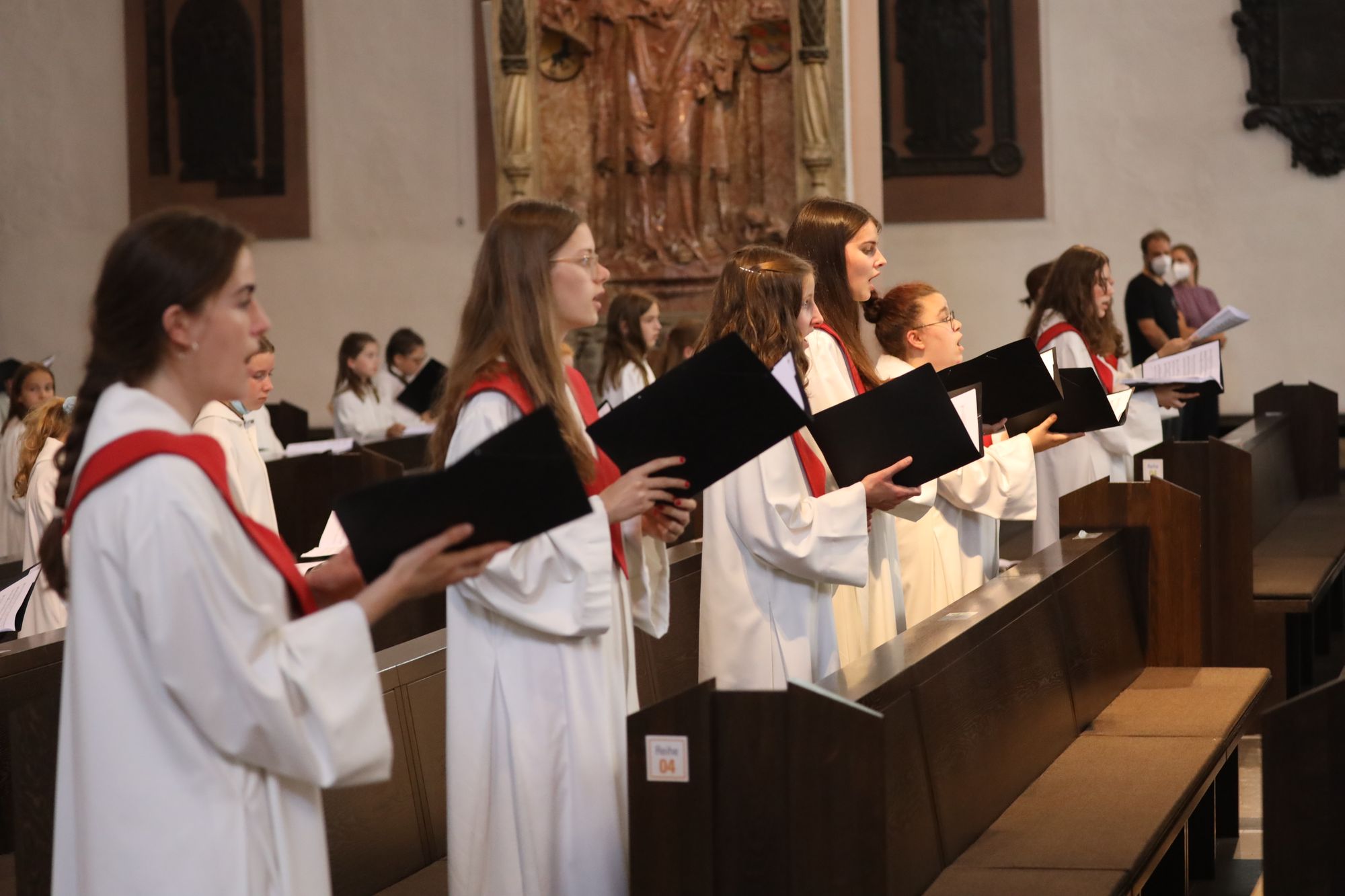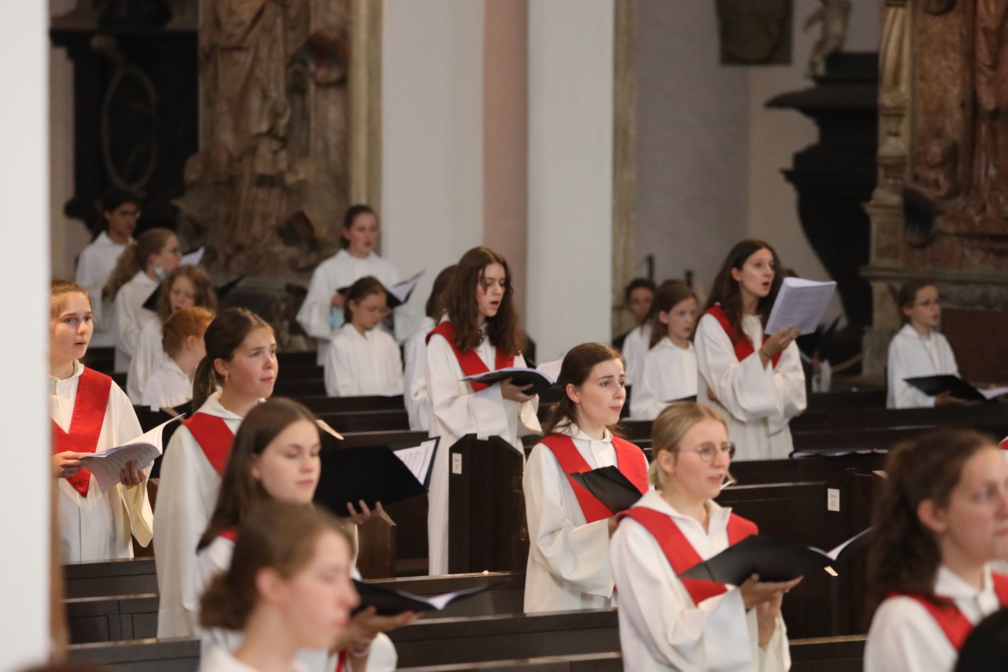 Rüth war von den Rückmeldungen sichtlich ergriffen. „Die Intensität des Moments zeigt mir, wie reich die zehn Jahre in Würzburg waren.“ Er dankte Bischof Jung und dem Domkapitel für das in ihn gesetzte Vertrauen und die Freiräume. Domkapellmeister Schmid habe ihn stets freundschaftlich unterstützt, Domorganist Professor Stefan Schmidt sei eine wichtige Konstante in seiner Würzburger Zeit gewesen. Allen, die mit ihrem Gesang oder im Hintergrund für die Dommusik aktiv sind, zollte Rüth seinen Dank und bat sie, diesen Einsatz weiter zu pflegen. An alle Entscheidungsträger des Bistums appellierte er, die Jugendarbeit der Dommusik allgemein als großen Schatz und insbesondere auch die Mädchenkantorei, für die er selbst besonders verantwortlich war, weiter zu fördern. „Ich werde immer Euer größter Fan bleiben“, sagte er zu den jugendlichen Sängerinnen.
