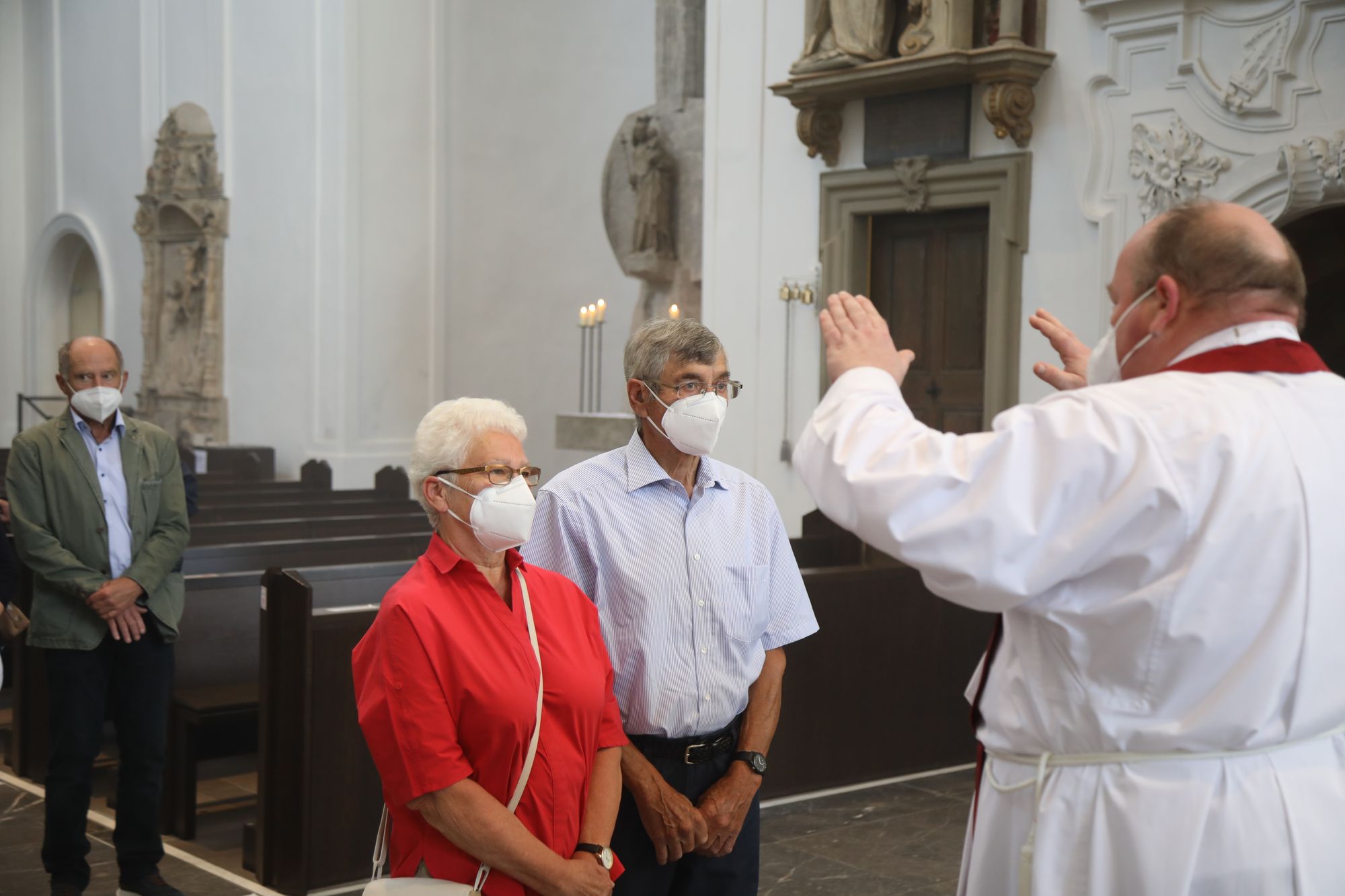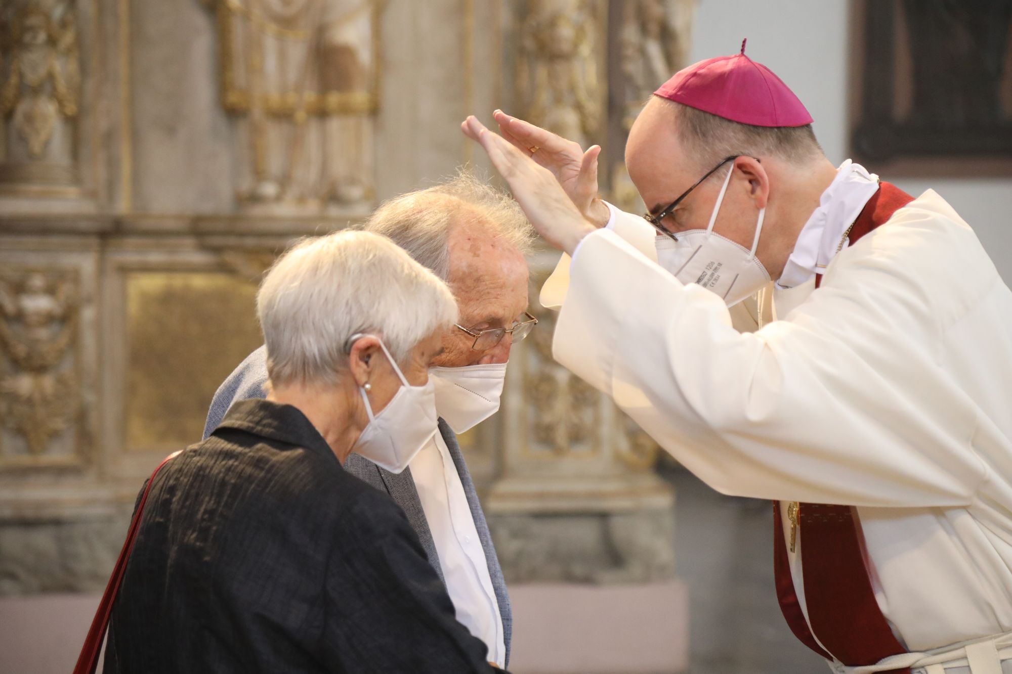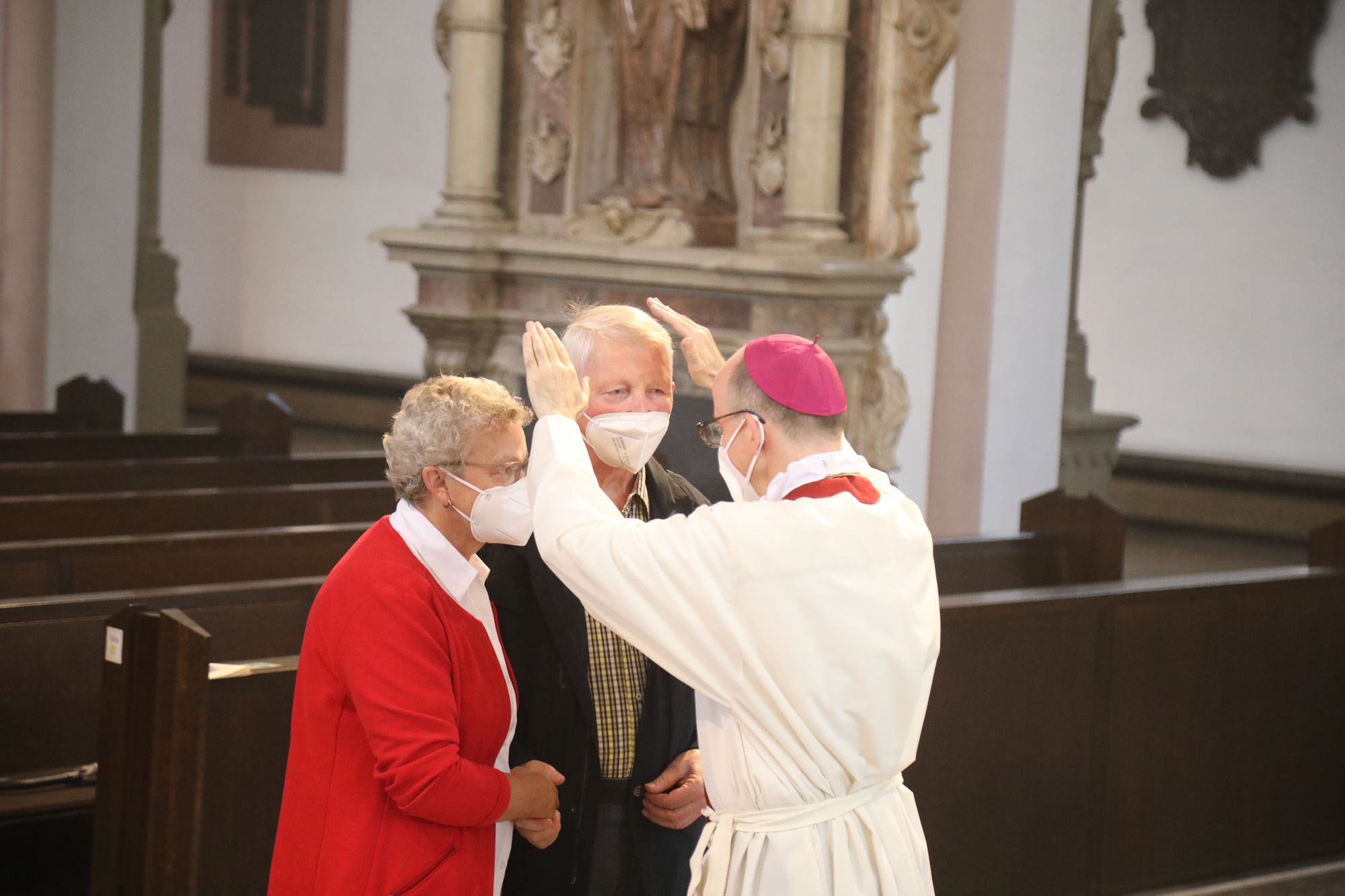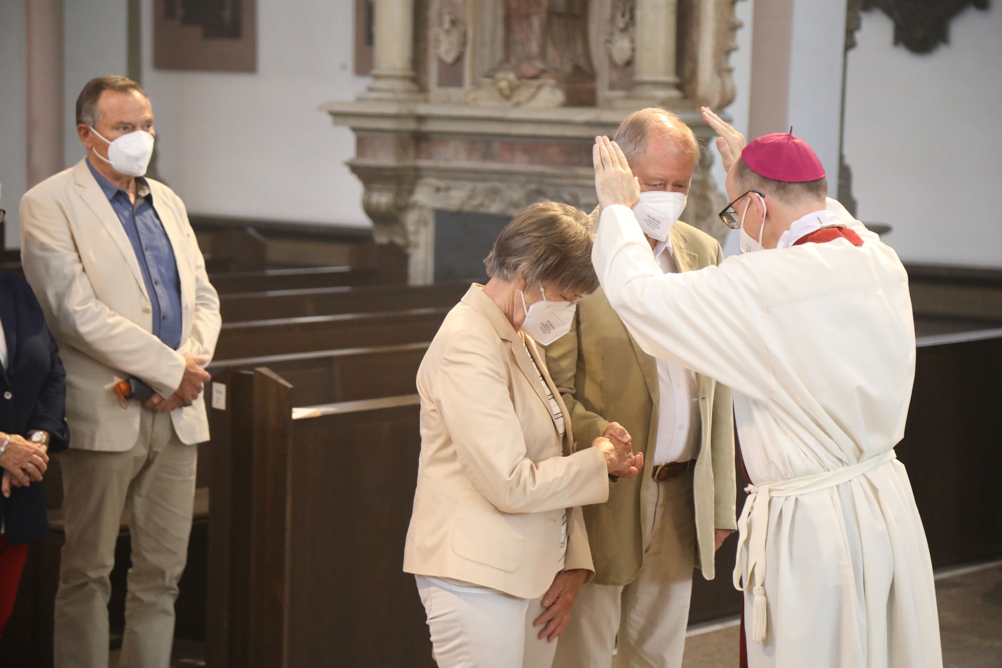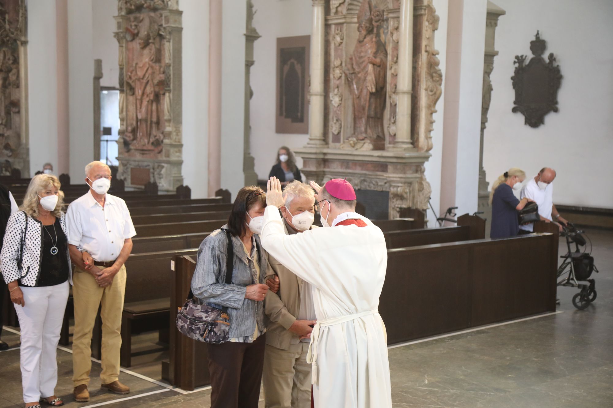 In der Predigt schuf Bischof Jung die Verbindung zwischen dem Evangelium zum Hochfest Peter und Paul und der Beziehung der Ehejubilare. Im Evangelium stelle Jesus die Vertrauensfrage: „Für wen haltet ihr mich?“ Es sei eine heikle Frage, jemanden direkt zu fragen: „Wer bin ich für dich?“ Eine oder einer von vielen oder doch etwas Besonderes? Das sei eine Frage, die sich alle Paare einmal gestellt hätten. Nach dem Gottesdienst ließen sich die Ehepartner von Bischof Jung und weiteren Priestern und Diakonen segnen. Die übliche Begegnung auf dem Kiliansplatz im Anschluss an den Gottesdienst musste aufgrund der Coronapandemie entfallen. Der Dankgottesdienst für Ehejubilare war der zehnte von insgesamt 18, die vor der diesjährigen Kiliani-Wallfahrtswoche unter den aktuellen Corona-Schutzmaßnahmen stattfinden.