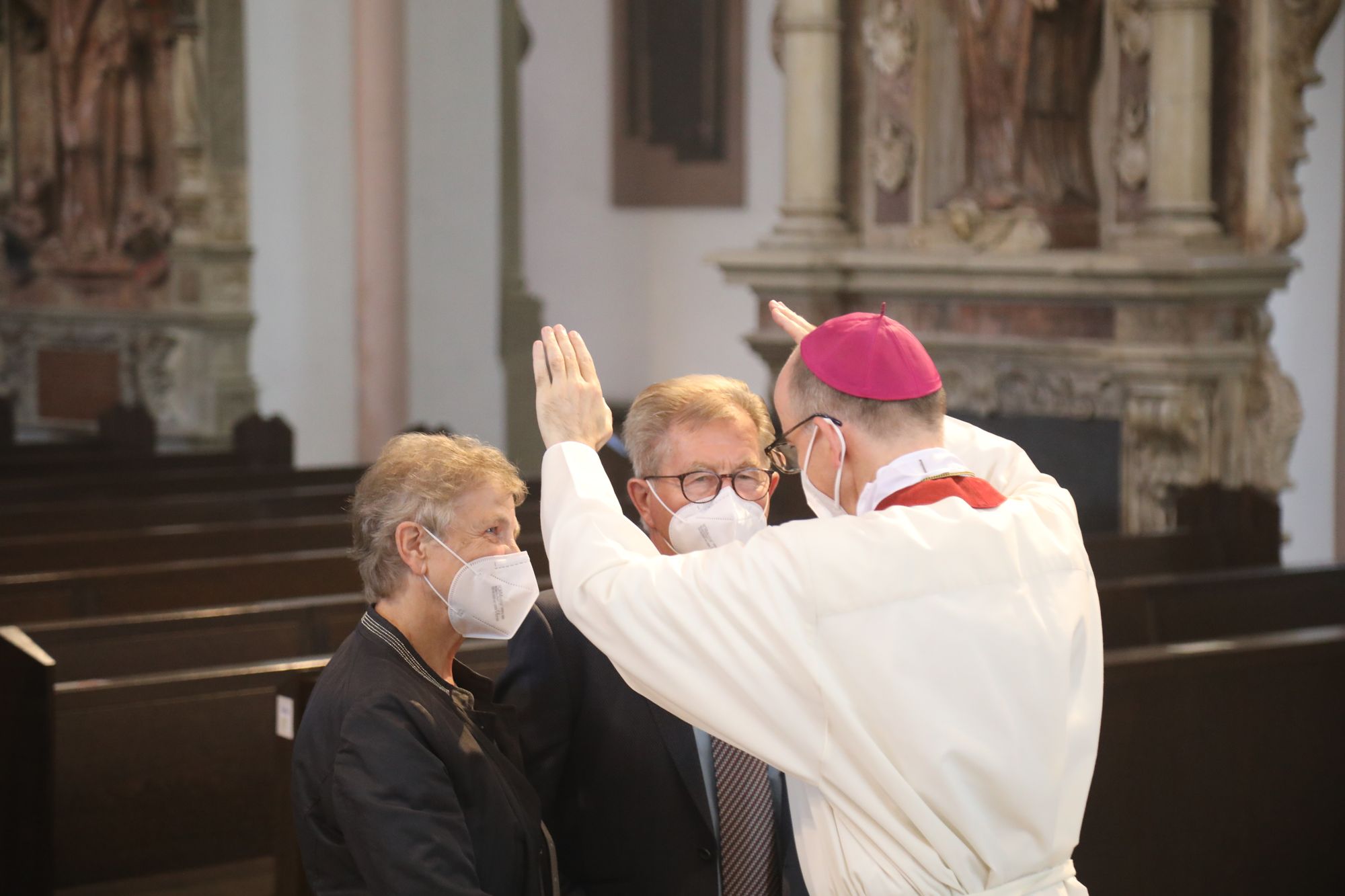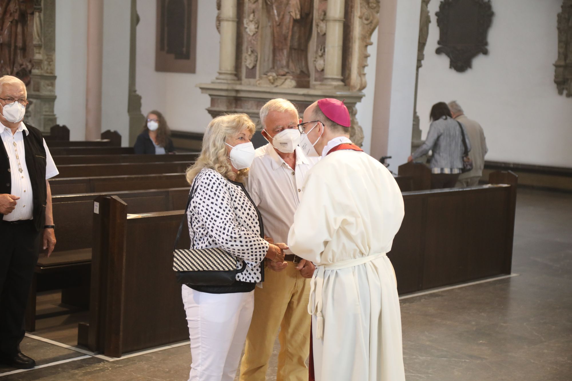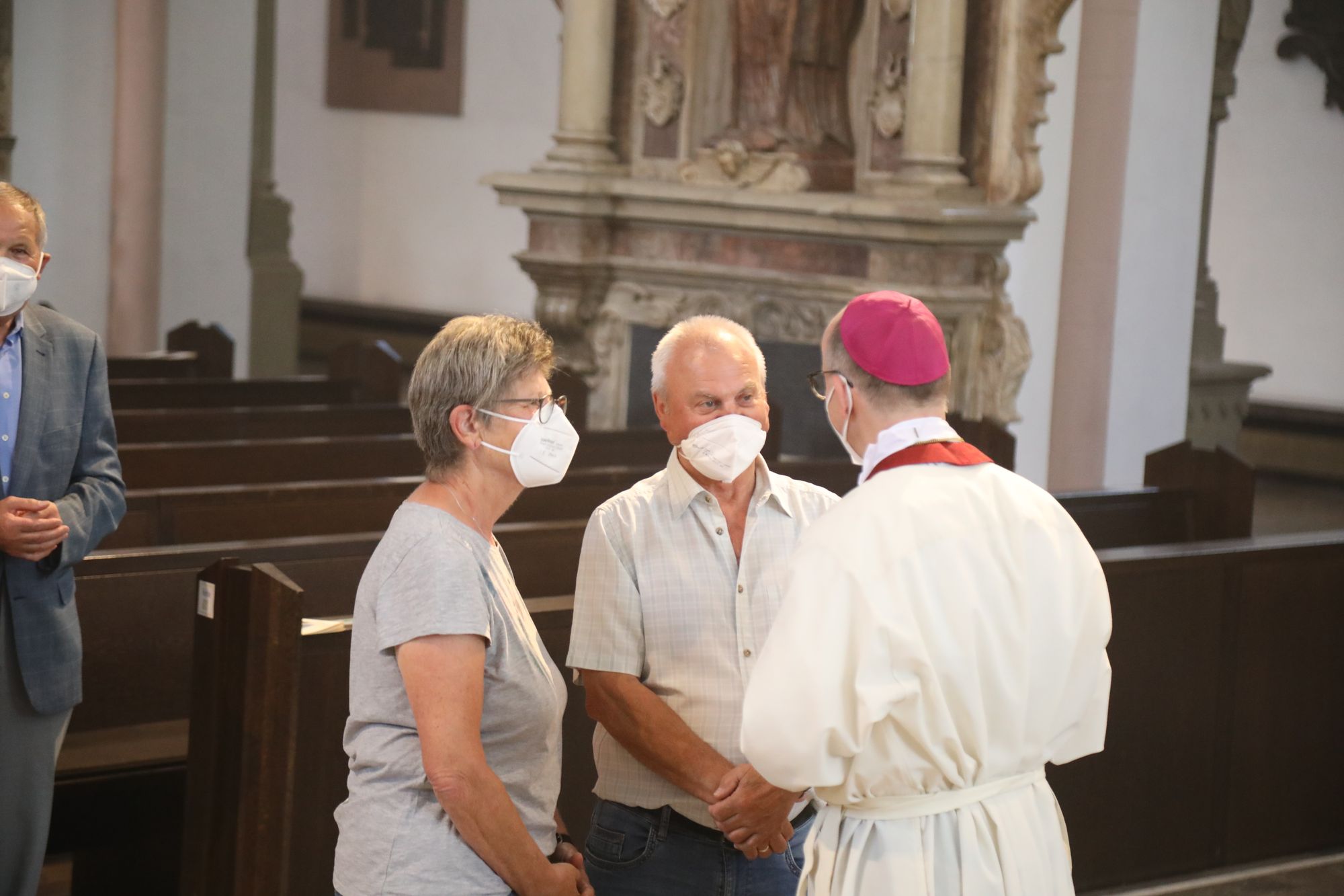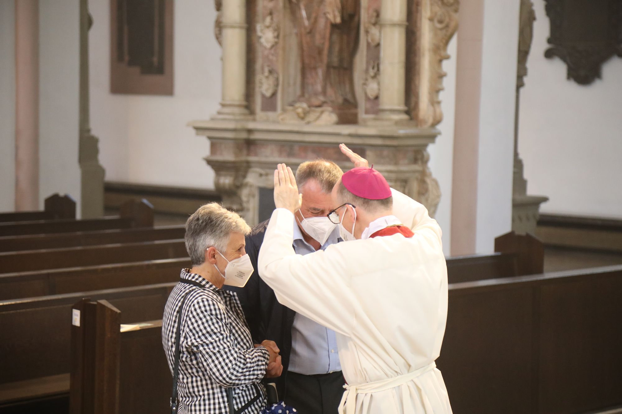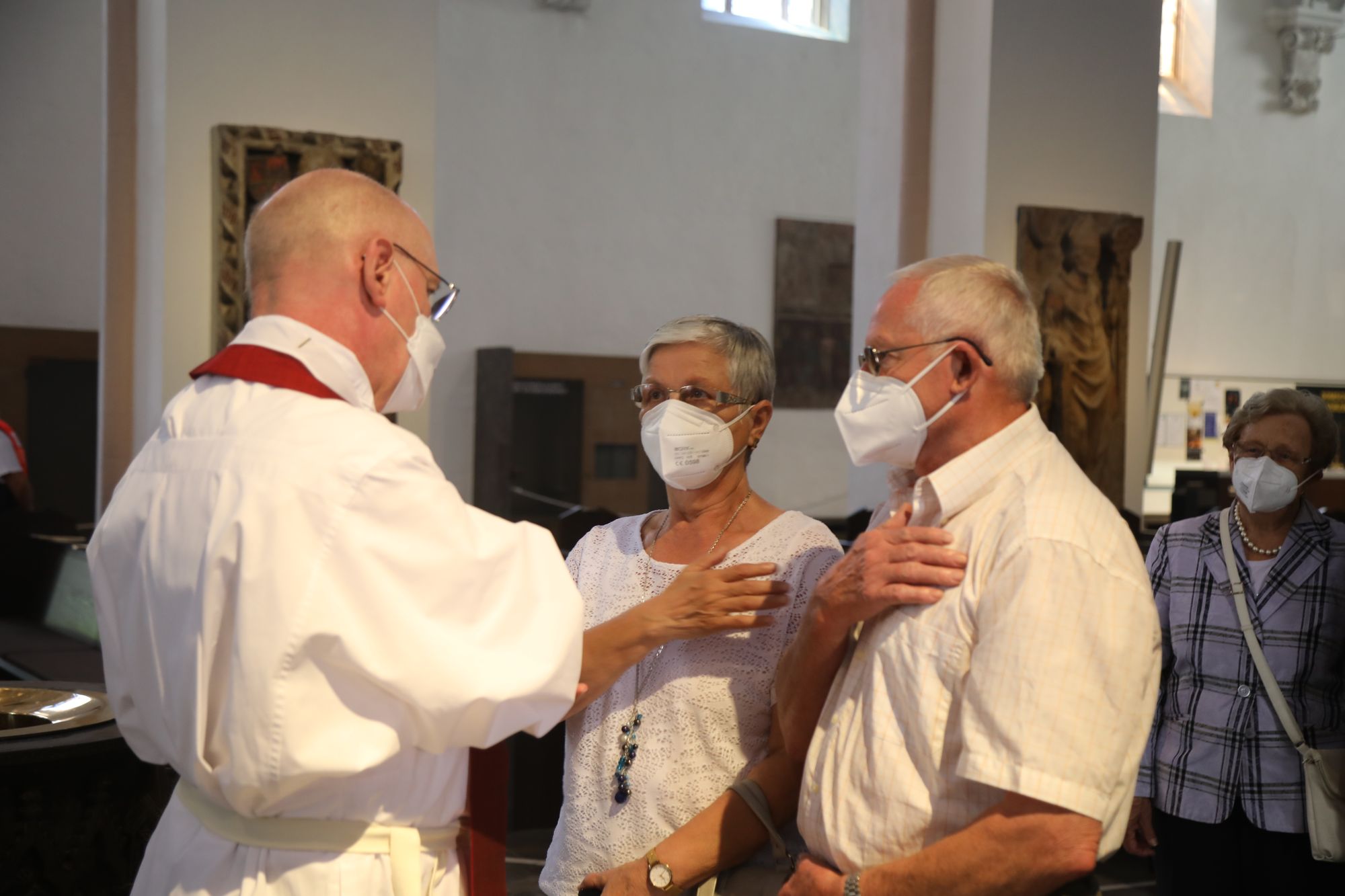 In der Predigt schuf Bischof Jung die Verbindung zwischen dem Evangelium zum Hochfest Peter und Paul und der Beziehung der Ehejubilare. Im Evangelium stelle Jesus die Vertrauensfrage: „Für wen haltet ihr mich?“ Es sei eine heikle Frage, jemanden direkt zu fragen: „Wer bin ich für dich?“ Eine oder einer von vielen oder doch etwas Besonderes? Das sei eine Frage, die sich alle Paare einmal gestellt hätten. Nach dem Gottesdienst ließen sich die Ehepartner von Bischof Jung und weiteren Priestern und Diakonen segnen. Die übliche Begegnung auf dem Kiliansplatz im Anschluss an den Gottesdienst musste aufgrund der Coronapandemie entfallen. Der Dankgottesdienst für Ehejubilare war der zehnte von insgesamt 18, die vor der diesjährigen Kiliani-Wallfahrtswoche unter den aktuellen Corona-Schutzmaßnahmen stattfinden.