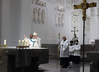 Würzburg (POW) Bei einem Pontifikalgottesdienst im Würzburger Kiliansdom hat Bischof Dr. Franz Jung am Freitagabend, 25. März, dem Fest der Verkündigung des Herrn, die Menschheit und insbesondere die Ukraine und Russland dem Unbefleckten Herzen Mariens geweiht. Zeitgleich vollzogen Papst Franziskus und Bischöfe weltweit diesen Weiheakt. Etwa 300 Personen feierten den Gottesdienst unter den aktuellen Coronaschutzvorschriften im Kiliansdom mit, die Feier wurde zudem live im Internet übertragen.