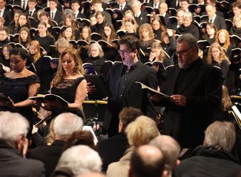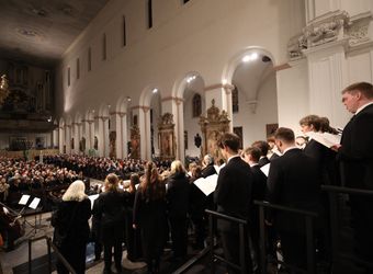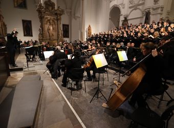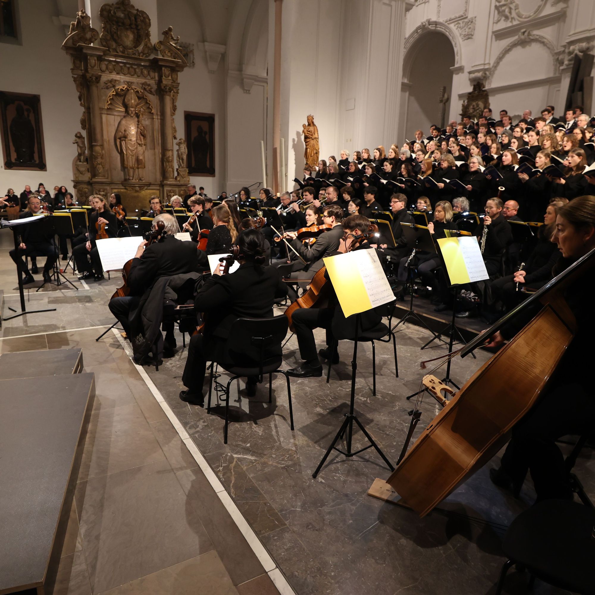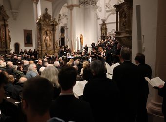 Dem Glockenläuten und dem Gedenken ging ein Konzert im Kiliansdom voraus. Mit dem Friedensoratorium „A Child Of Our Time“ von Michael Tippett gedachte die Dommusik Würzburg der Zerstörung Würzburgs vor 80 Jahren. Unter der Leitung von Domkapellmeister Alexander Rüth sangen rund 130 Sängerinnen und Sänger der Jungen Domkantorei und des Würzburger Domchors zusammen mit der Camerata Würzburg. Solisten waren Elizabeth Llewellyn (Sopran), Julia Rutigliano (Alt), Joshua Whitener (Tenor) und Uwe Schenker-Primus (Bass).