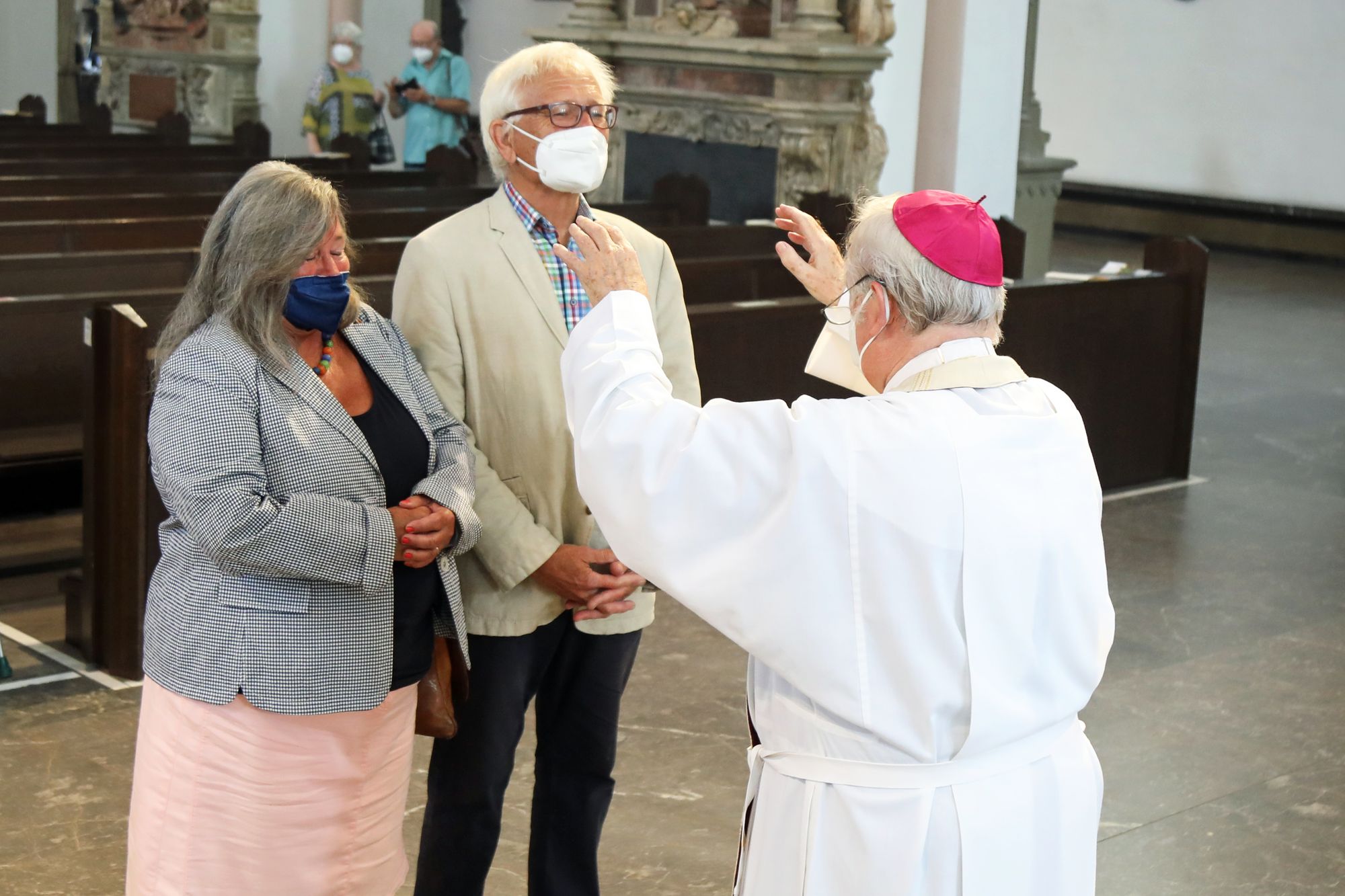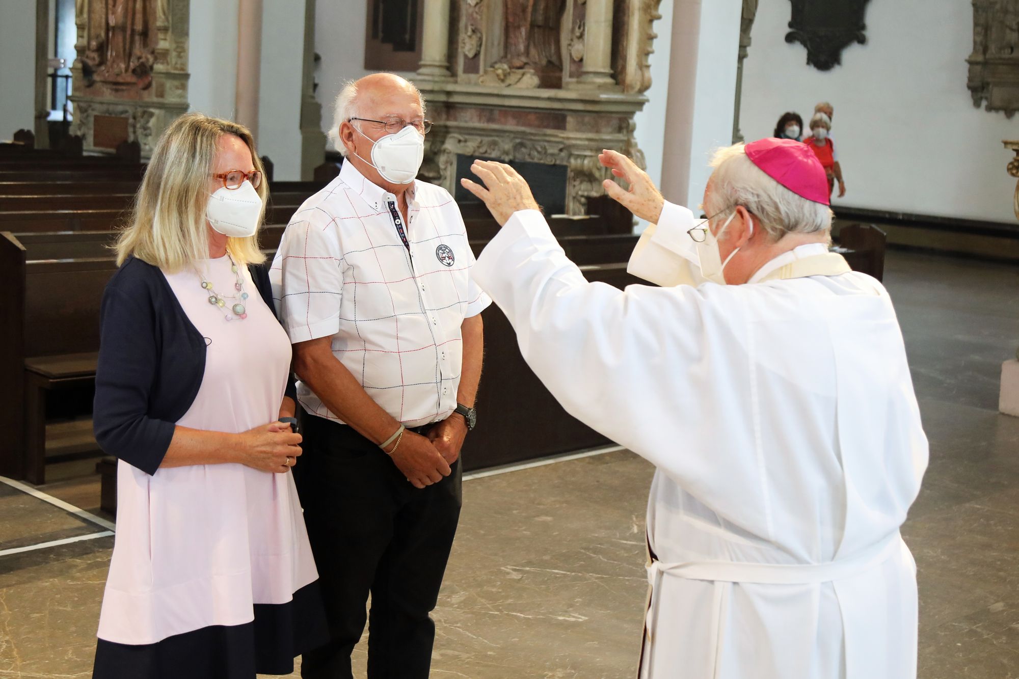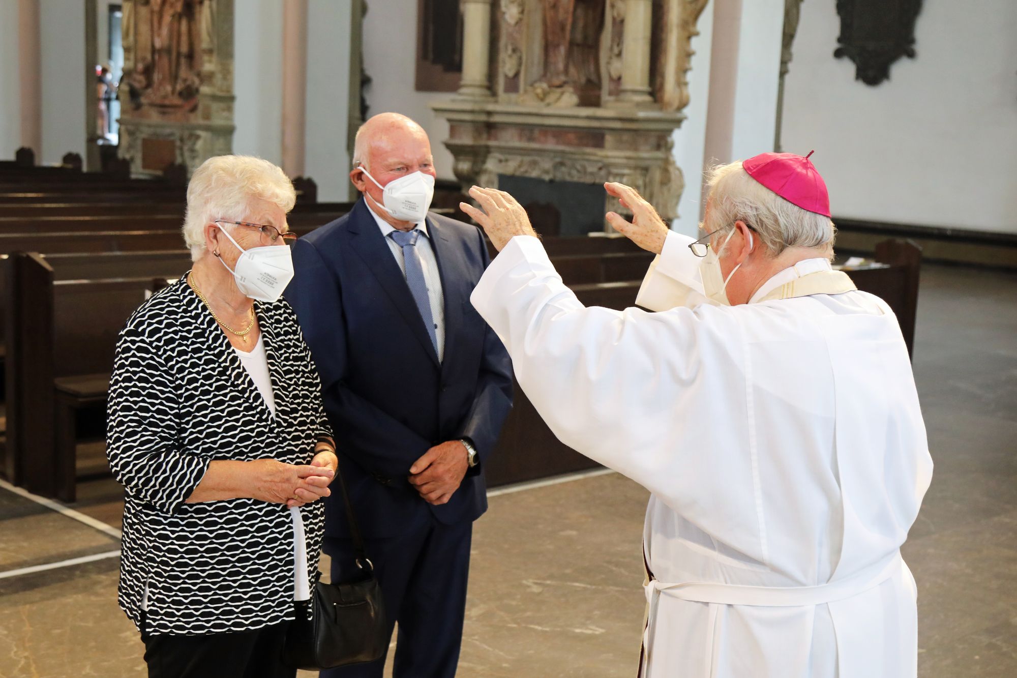 (POW) Mit rund 110 Ehepaaren aus dem ganzen Bistum hat Bischof em. Dr. Friedhelm Hofmann am Mittwochvormittag, 23. Juni, einen Pontifikalgottesdienst für Ehejubilare gefeiert, die in den Jahren 2020 und 2021 auf 50, 60 oder 65 gemeinsame Jahre zurückblicken. „Ich danke Ihnen allen für Ihr Zeugnis“, sagte Bischof Hofmann zu den Gläubigen, die den Gottesdienst im Würzburger Kiliansdom unter den aktuellen Corona-Beschränkungen feierten. „Sie zeigen deutlich, dass die Ehe kein Auslaufmodell unserer Gesellschaft, sondern im Gegenteil Grundlage eines prosperierenden Gemeinwohls ist. Ehe hat Zukunft!“ Im vergangenen Jahr mussten die Gottesdienste für die Ehejubilare aufgrund der Coronapandemie entfallen. Deshalb werden in diesem Jahr insgesamt 18 Gottesdienste für Ehejubilare gefeiert, die in den Jahren 2020 und 2021 ihr silbernes beziehungsweise goldenes, diamantenes oder eisernes Ehejubiläum begehen. Trotz der Coronakrise seien die Menschen in der Kirche beheimatet und erführen Gottes Liebe, erklärte Bischof Hofmann.