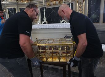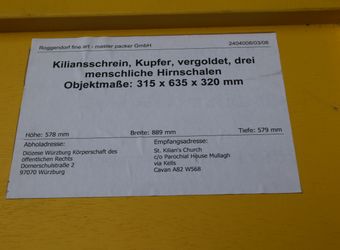 Würzburg (POW) Die Häupter der Frankenapostel sind schon vorausgereist: Am Donnerstag, 26. September, sind bei einer liturgischen Feier die Reliquien aus dem Altar des Kiliansdoms genommen und im Anschluss für den Transport via Lkw in Richtung Irland verladen worden. Insgesamt über 100 Gläubige aus dem Bistum sind von Mittwoch, 2., bis Sonntag, 6. Oktober, mit Bischof Dr. Franz Jung und Generalvikar Dr. Jürgen Vorndran auf Pilgerreise in der irischen Heimat Kilians, Kolonats und Totnans. Der Kiliansschrein wurde für die Irlandreise in einer speziellen Klimakiste verpackt und wird von einer Fach-Kunstspedition auf die grüne Insel gebracht. Vor Ort übernehmen die irischen Gastgeber die Reliquien und betreuen sie während der gesamten Reise. Wie während der Kiliani-Wallfahrtswoche bleibt der Altar des Doms an dieser Stelle leer. Es sind jedoch weitere Reliquien dort fest eingelassen.