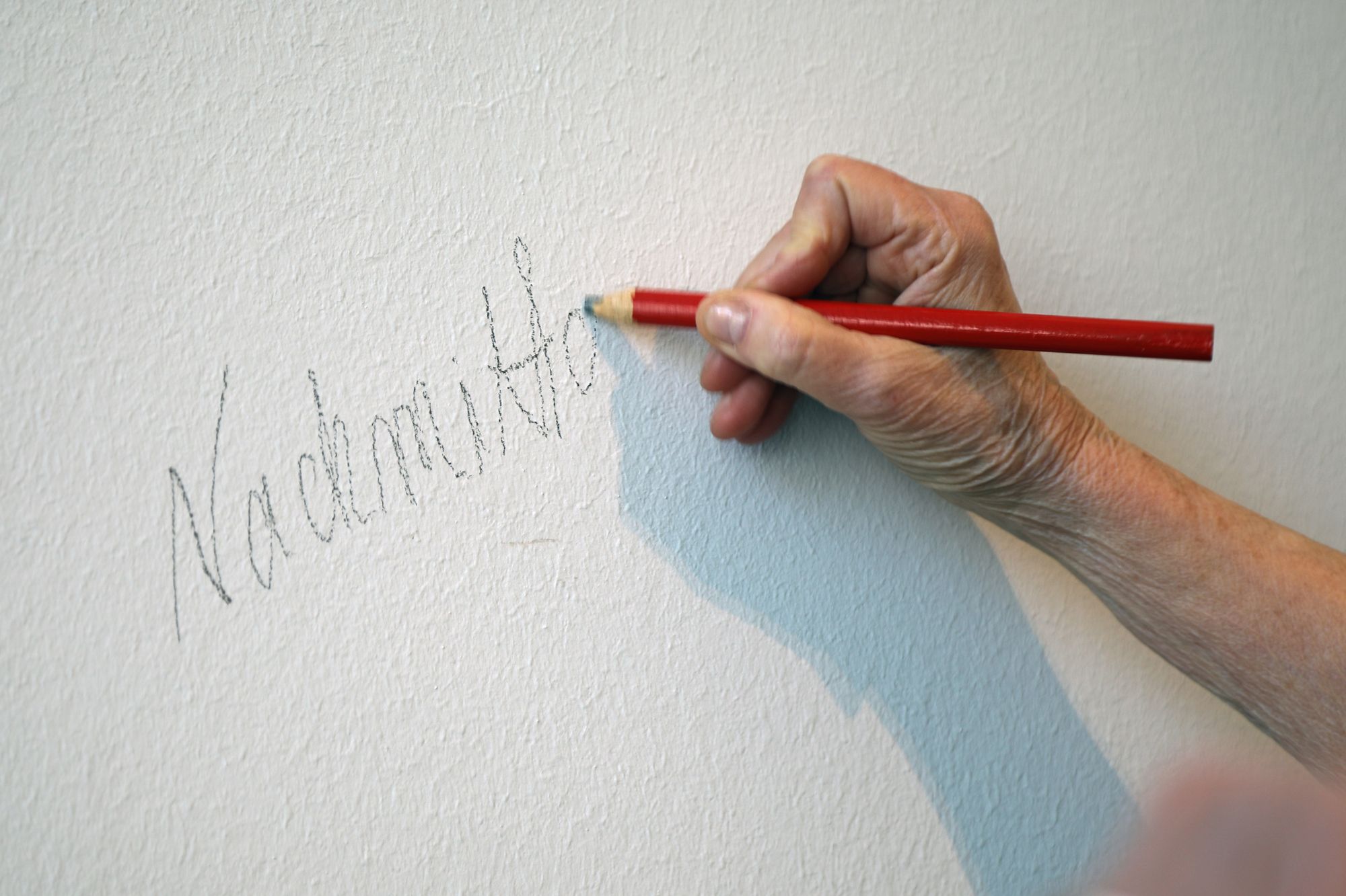 Würzburg (POW) Ute Rakob setzt den Bleistift an und schreibt in klarer, schnörkelloser Schrift das Wort „Nachmittag“ direkt auf die weiße Wand. Durch die großen Fenster scheint die Sonne auf vier Bilder, die wie ein farbiges Fries nebeneinander im Museum am Dom (MAD) in Würzburg hängen und exakt das gleiche Motiv zeigen: bunte Fragmente und Scherben auf schwarzem Grund. Darüber die Worte Morgen, Mittag, Nachmittag und Abend. „Der einzige Unterschied ist der Lichteinfall“, erklärt die Künstlerin und deutet mit der Hand das Wandern der Sonnenstrahlen an. In der Ausstellung „Ute Rakob. Spuren der Zeit“, die bis 14. September 2025 zu sehen ist, gehen ihre Bilder ein Zwiegespräch mit den Werken der Dauerausstellung ein. Für Dr. Jürgen Emmert, Leiter der Abteilung Kunst, ist die Ausstellung ein doppelter Glücksfall, denn Rakob hat 37 ihrer Arbeiten der Stiftung Kunstsammlung der Diözese Würzburg geschenkt. „Das ist für uns eine große Freude und ein Meilenstein.“
