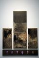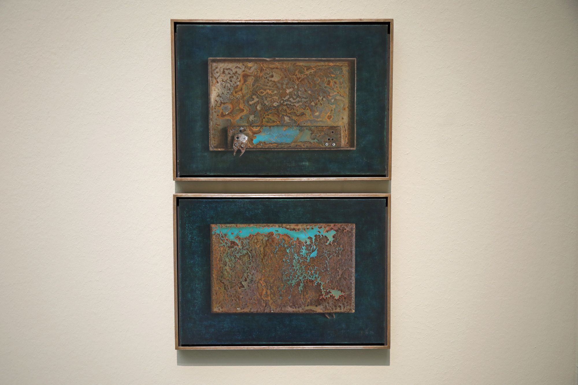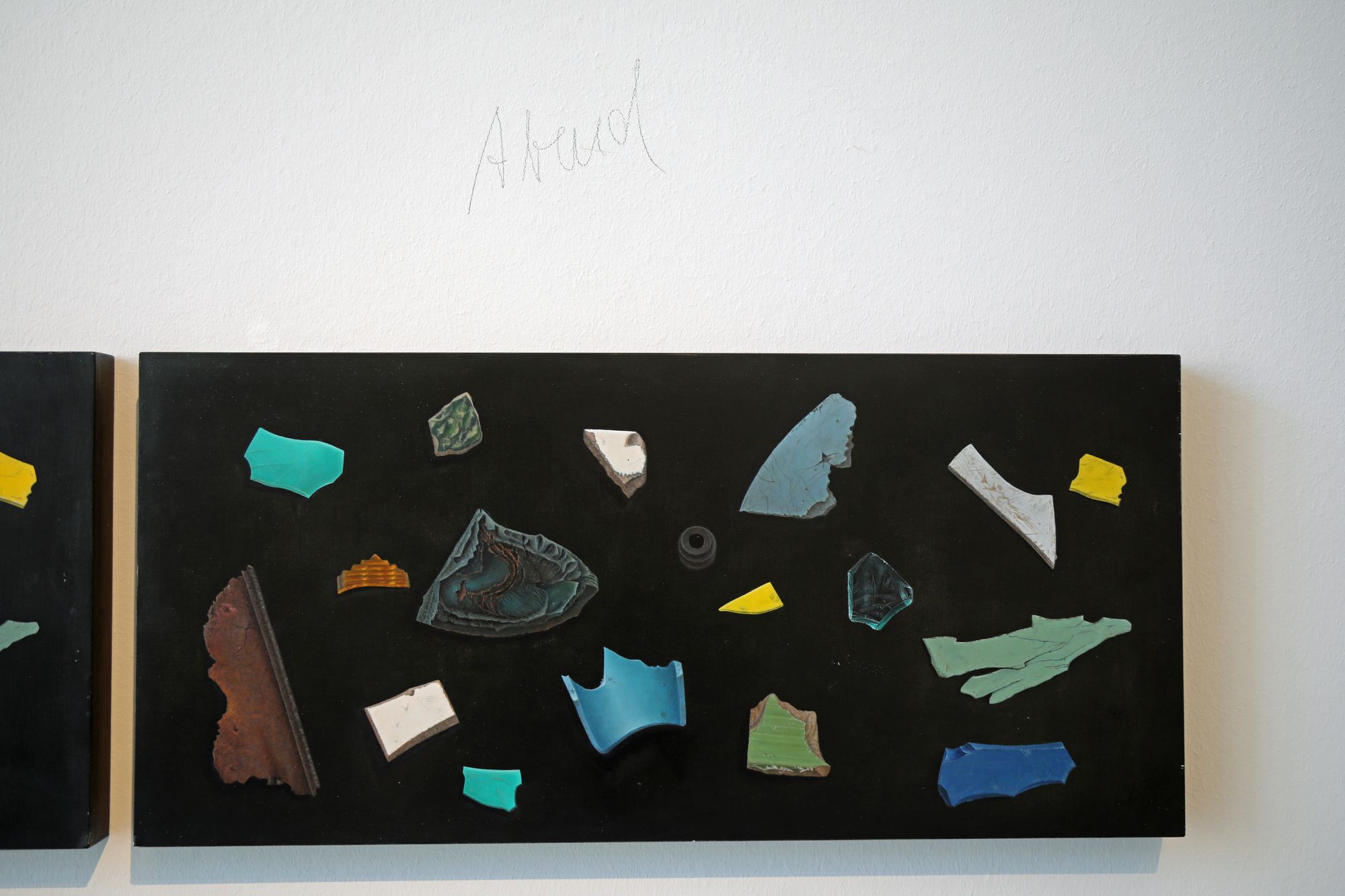 In zufälligen Fundstücken, in Abfall, der am Wegesrand liegt, entdecke Rakob Verletzlichkeit und Zerfall, Bedrohung und Zerstörung von Schöpfung, aber auch Magie und Schönheit, ist im Folder zur Ausstellung zu lesen. Aus einer verrosteten und verbeulten Tafel beispielsweise, „auf einem Spaziergang gefunden“, wurde das „Zwei Seiten-Thema“, das an eine fantastische Landkarte erinnert. Rakob gelinge es mit ihrer Ästhetik, den Betrachter in eine neue Wirklichkeit zu heben und tiefere Bedeutungen damit zu verbinden, sagt Koller.