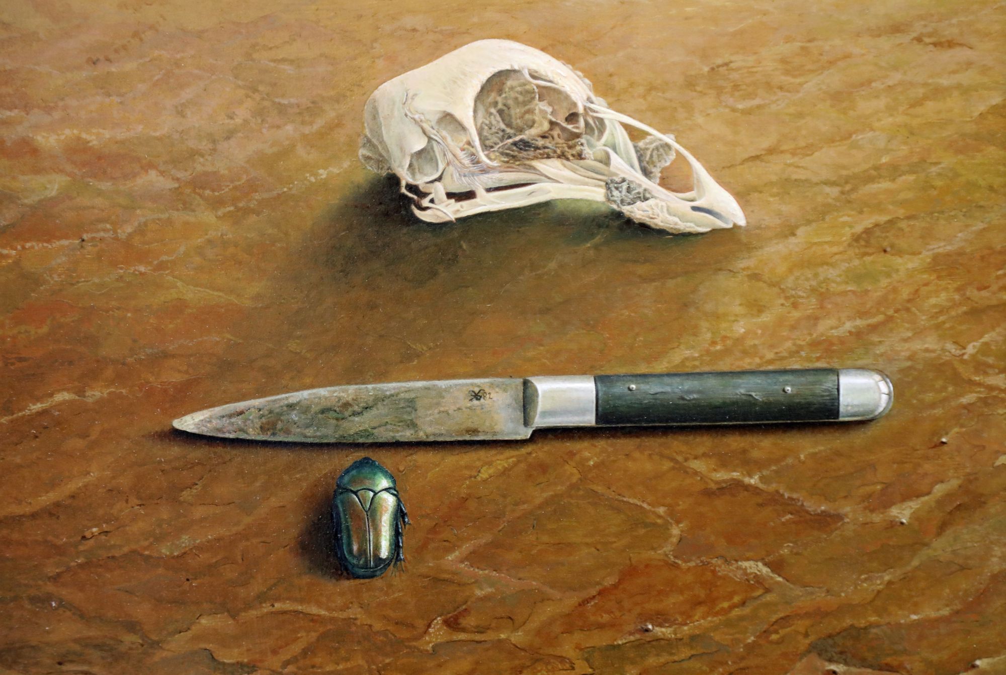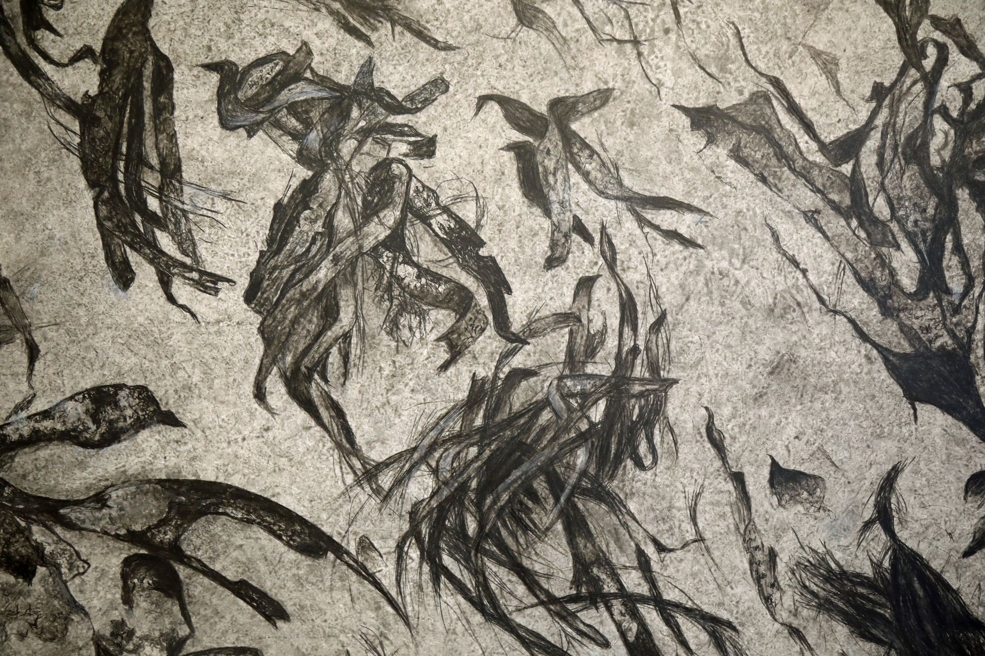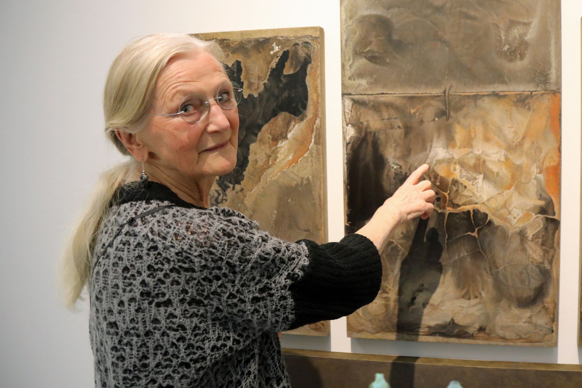 Ein Erlebnis ist es, mit Rakob auf Spurensuche in ihren eigenen Bildern zu gehen, etwa im „Tieraltar“. In dem Haus, in dem sie in Italien lebe, gebe es einen Kamin mit feuerfesten Platten, erzählt sie. „Sie müssen seit 100 Jahren darin gewesen sein.“ In dem Kamin seien auch Tiere gebraten worden. Sie habe acht Monate damit verbracht, die Platten abzumalen. „Es sind Tierabbildungen darin“, sagt sie und deutet auf die Umrisse eines Vogels inmitten der bräunlich-schwärzlichen Feuerspuren. Auch eine Katze ist zu entdecken – und im Nachhinein fällt auf einmal noch ein schwarzer Hundekopf auf. Man könne beim Betrachten von Rakobs Werken „die Gedanken steigen und der Fantasie freien Lauf lassen“, sagt Koller. Unter dem „Tieraltar“ wandern in einem Video die Schädel von Tieren in einer makabren Prozession von links nach rechts. Die Vorbilder dafür stammen aus dem Naturhistorischen Museum in Wien, neben Italien der zweite Lebensmittelpunkt der Künstlerin.