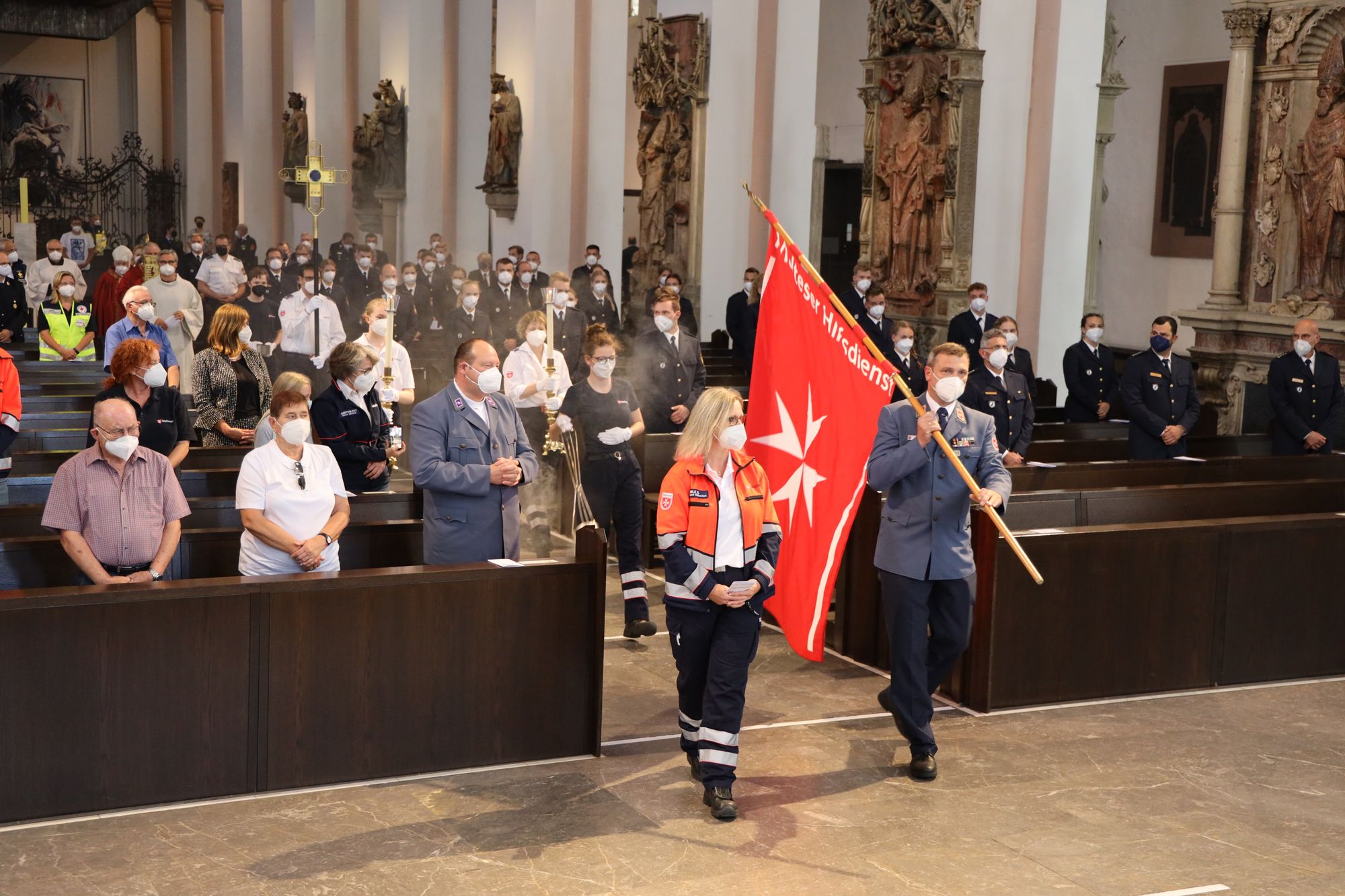 Würzburg (POW) „Jeder Einsatz ist anders und eine Herausforderung für Leib und Seele.“ Das hat Weihbischof Ulrich Boom am Mittwochabend, 7. Juli, bei der Kiliani-Wort-Gottes-Feier für Einsatzkräfte und Notfallseelsorge betont. Den Gottesdienst unter Einhaltung der Corona-Schutzvorschriften feierten rund 120 Personen im Würzburger Kiliansdom mit. Wie notwendig und schwierig der Dienst der Kräfte von beispielsweise Polizei, Feuerwehr, Technischem Hilfswerk, Rettungsdiensten und Notfallseelsorge sei, habe vor gut zwei Wochen die Gewalttat am Würzburger Barbarossaplatz deutlich gemacht. „Durch Ihren Einsatz konnte, gewiss auch durch die Beteiligung vieler Bürgerinnen und Bürger unserer Stadt, Schlimmeres verhindert, den Verletzten geholfen und Betroffenen Trost und Hilfe gegeben werden.“ Dafür sprach ihnen der Weihbischof seinen Dank aus.