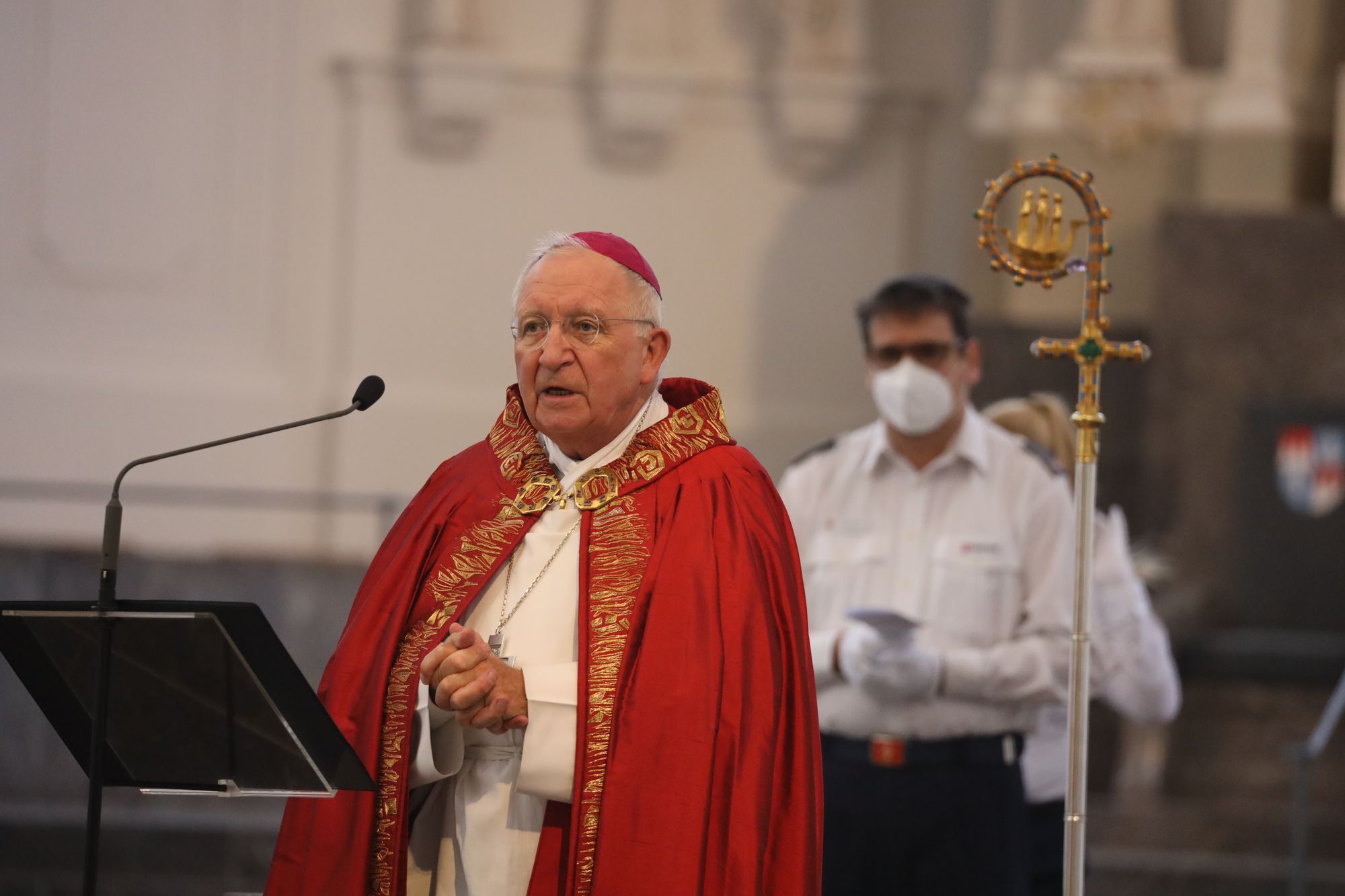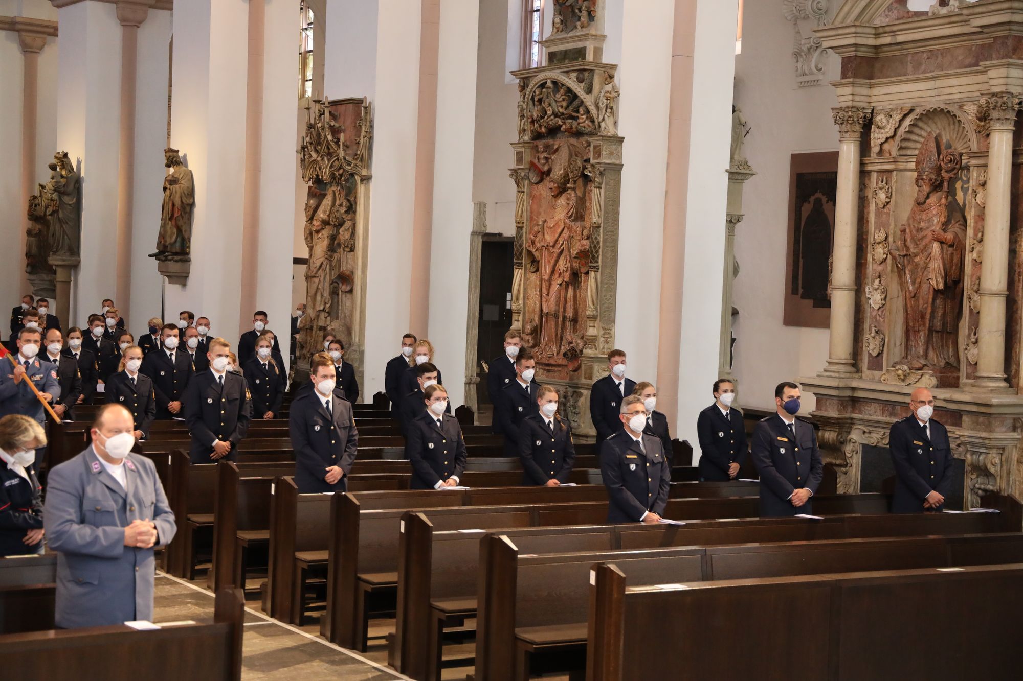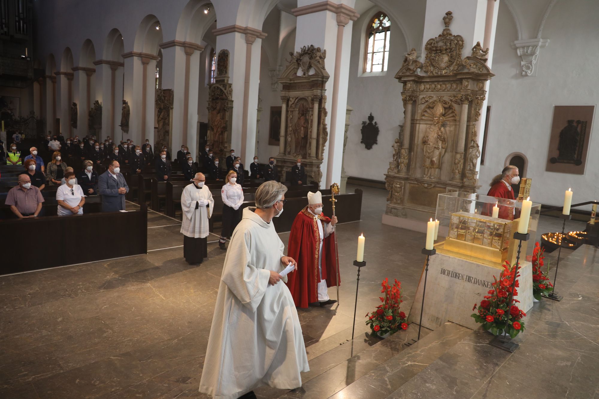 Die Frankenapostel seien keine Einzelkämpfer gewesen. „Wenn alle Kräfte zusammenwirken, können wir der Ohnmacht begegnen, die wir oft in uns erfahren, wenn uns Einsätze fordern.“ Ihren Kopf hätten die irischen Missionare für das Evangelium Christi hingehalten, das besage, dass Gott diese Welt bis in ihre Schrecken hinein liebt. „Für mich ist und bleibt das ein wahrhaft großer Zuspruch für unsere Welt.“ Die Frankenapostel haben nach den Worten des Weihbischofs ein unerschütterliches Vertrauen in sich selbst, in den Nächsten „und in den, den wir Gott nennen“ gehabt. Gottes Gesicht sei das Antlitz Jesu Christi. „In ihm hat Gott uns gezeigt, wie nahe er uns ist in unserem Leben und Sterben, in unseren Unsicherheiten und Ängsten. Das Vertrauen der Frankenapostel wünsche ich Ihnen auch bei Ihrem Dienst in und an unserer Gesellschaft.“ Pandemiebedingt konnte keine Begegnung nach dem Gottesdienst stattfinden.