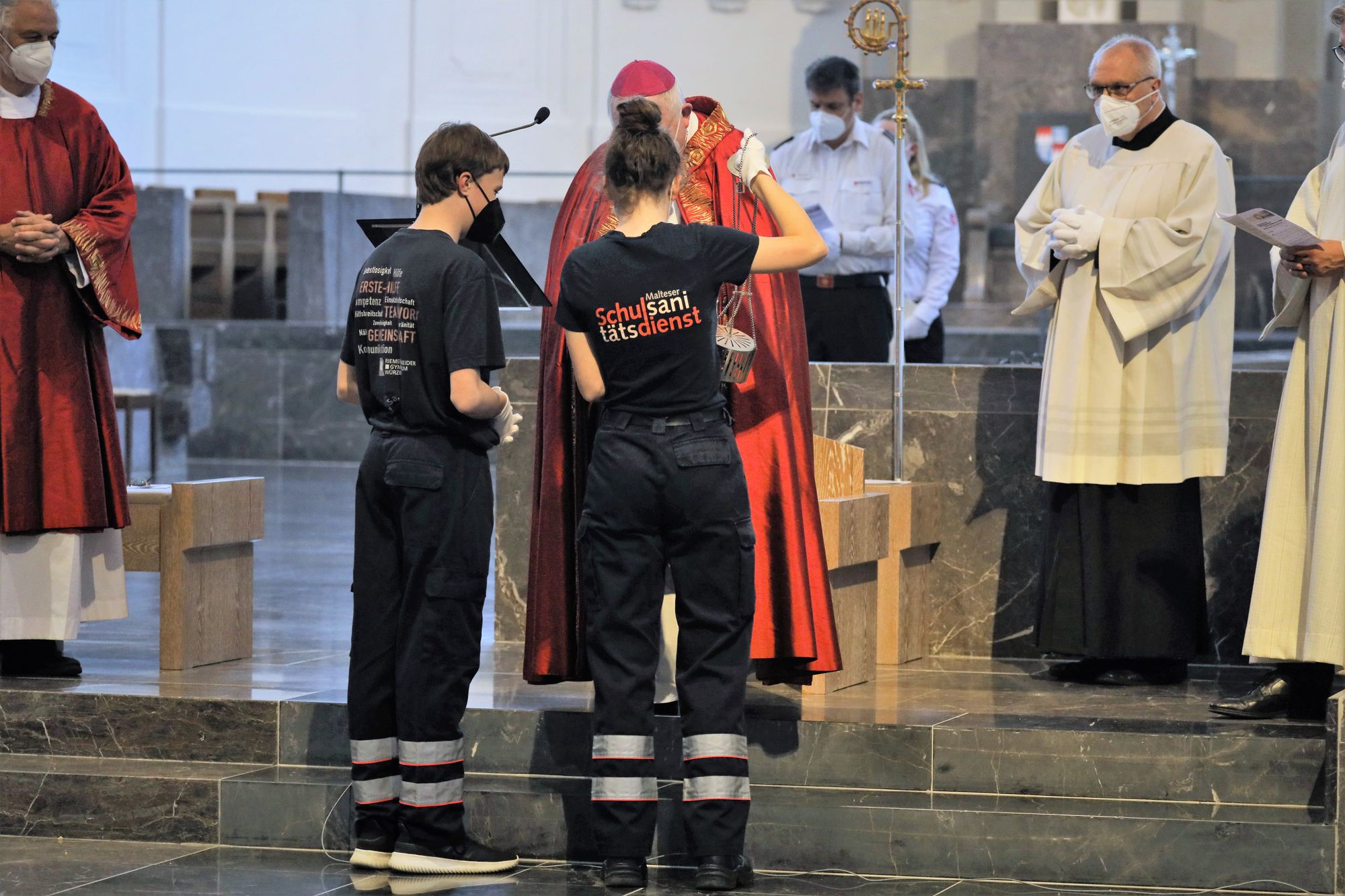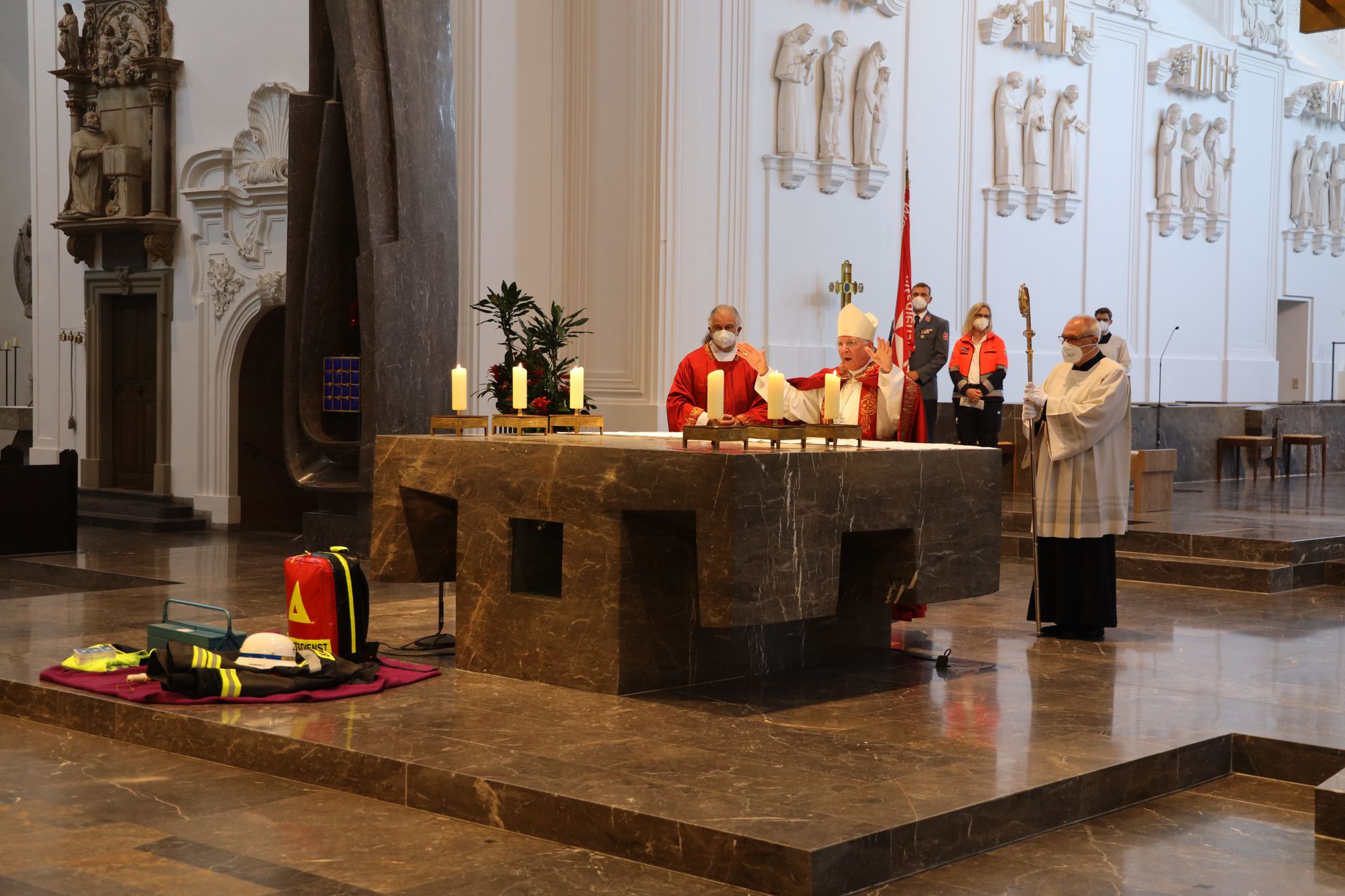 Alle Einsatzkräfte könnten sich gut in dem Wort aus dem Epheserbrief wiederfinden, wo es heißt: „Ein Spiel der Wellen, geschaukelt und getrieben vom Widerstreit der Lehrmeinungen, im Würfelspiel der Menschen, in Verschlagenheit, die in die Irre führt.“ Es werde auf dem Rücken der Ausführenden ausgetragen, welche die richtige Entscheidung bei einer Vielfalt von Meinungen und Möglichkeiten sei. „Die Frankenapostel Kilian, Kolonat und Totnan können mit ihrem Lebenseinsatz auch für Ihren Dienst in und an der Gesellschaft Vorbilder und Helfer sein“, sagte Weihbischof Boom.