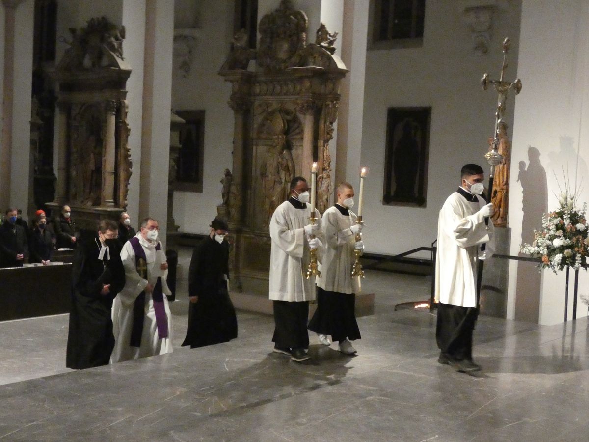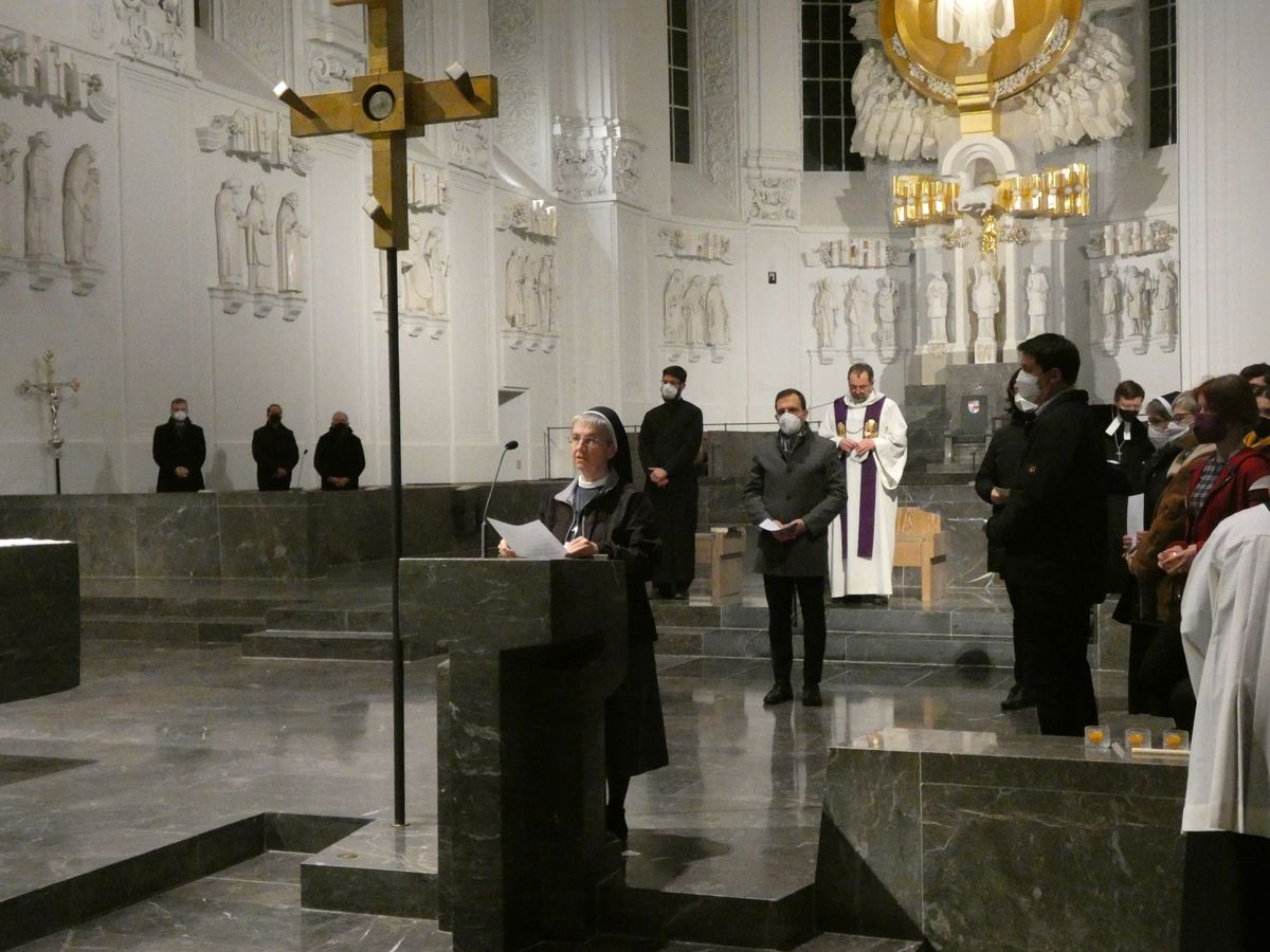 Würzburg (POW) Mehr als 230 Personen haben am Freitagabend, 25. Februar, an einem ökumenischen Friedensgebet im Würzburger Kiliansdom teilgenommen. Zeitgleich fanden im ganzen Bistum ähnliche konfessionsübergreifende Gebetswachen für Frieden in der Ukraine statt, bei denen für die Opfer der Gewalt und ein rasches Ende der Kriegshandlungen gebetet wurde.