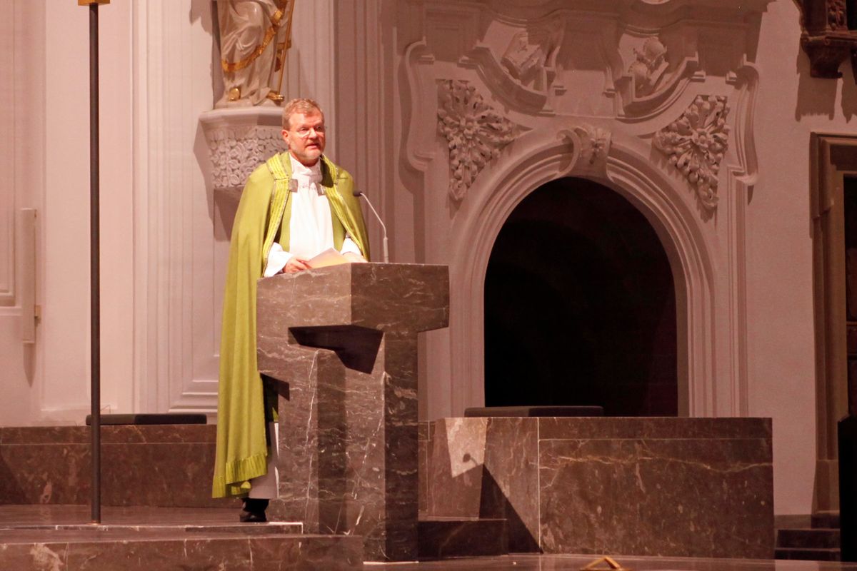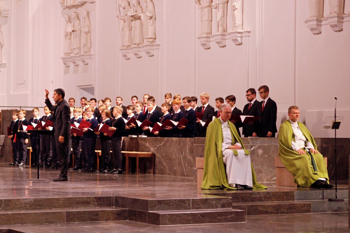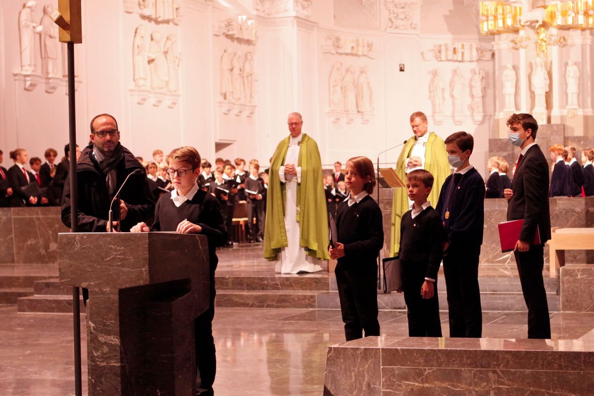Unter der Leitung von Sebastian Ferenz, Assistent des Domkapellmeisters Professor Christian Schmid und Leiter des Aufbauchors der Domsingknaben, sowie Harald Martini, Leiter der Essener Domsingknaben, erklangen Werke unter anderem von Felix Mendelssohn Bartholdy, David J. Evans, Giovanni Pierluigi da Palestrina und Francis Poulenc. Dem Gottesdienst stand Domdekan Generalvikar Dr. Jürgen Vorndran gemeinsam mit Dompropst Monsignore Thomas Zander (Bistum Essen) als Offiziant vor. Es sei „wunderschön, dass wir uns nach den langen Monaten der Coronapandemie begegnen dürfen“, begrüßte Domdekan Vorndran die nahezu 100 Sänger und die Gläubigen. Im Kiliansdom gebe es mit dem Tabernakelhaus einen besonderen Hinweis auf den brennenden Dornbusch, knüpfte der Domdekan an die Lesung von Mose und dem brennenden Dornbusch an. „So wie Gott zu Mose sprach aus dem Dornbusch, so ist Gott für uns in diesem Haus gegenwärtig im Tabernakel.“ An die Domsingknaben gewandt sagte er: „Euer gesungenes Gotteslob hilft mit, dass wir alle uns bewusst werden: Hier ist das Haus des Herrn! Ein Ort, an dem wir Gott besonders nahe sind.“ Domorganist Professor Stefan Schmidt begleitete die Feier an der Orgel.