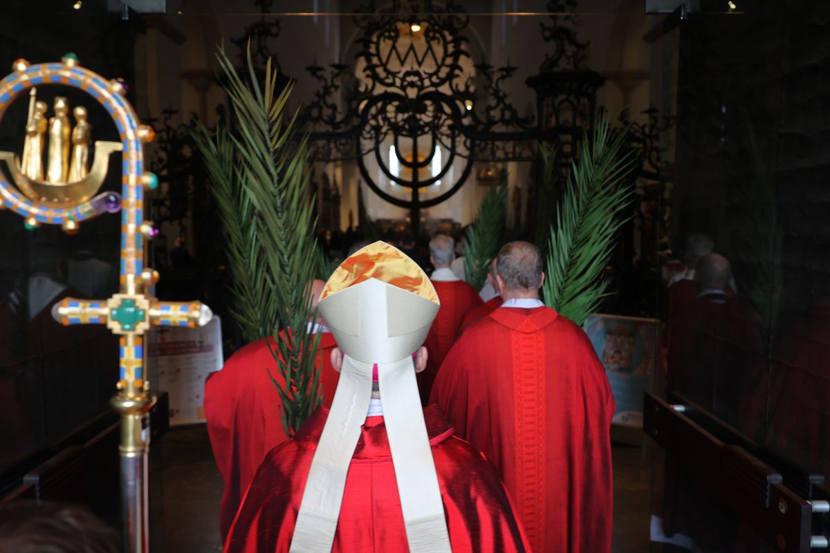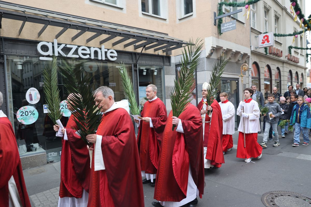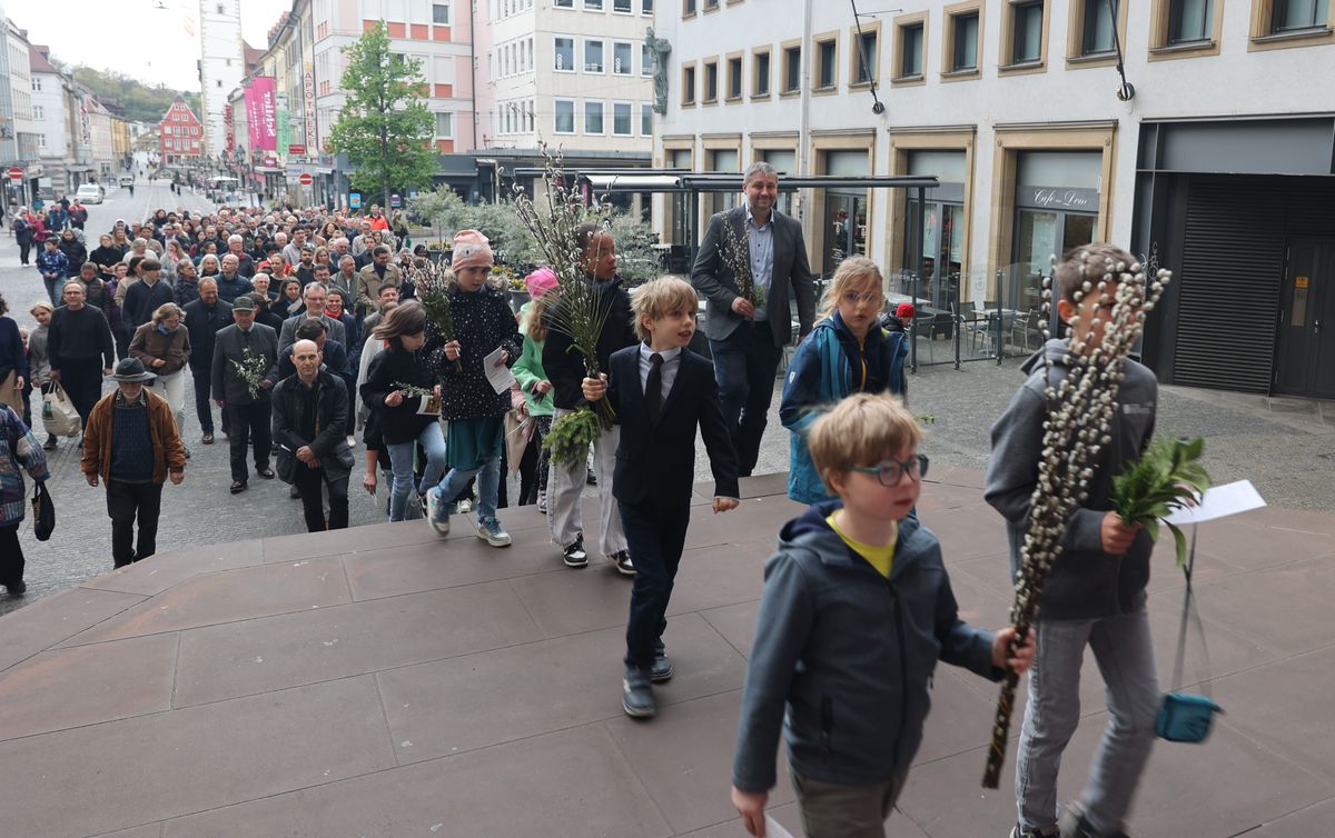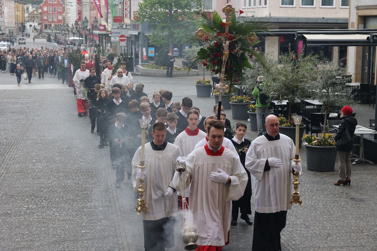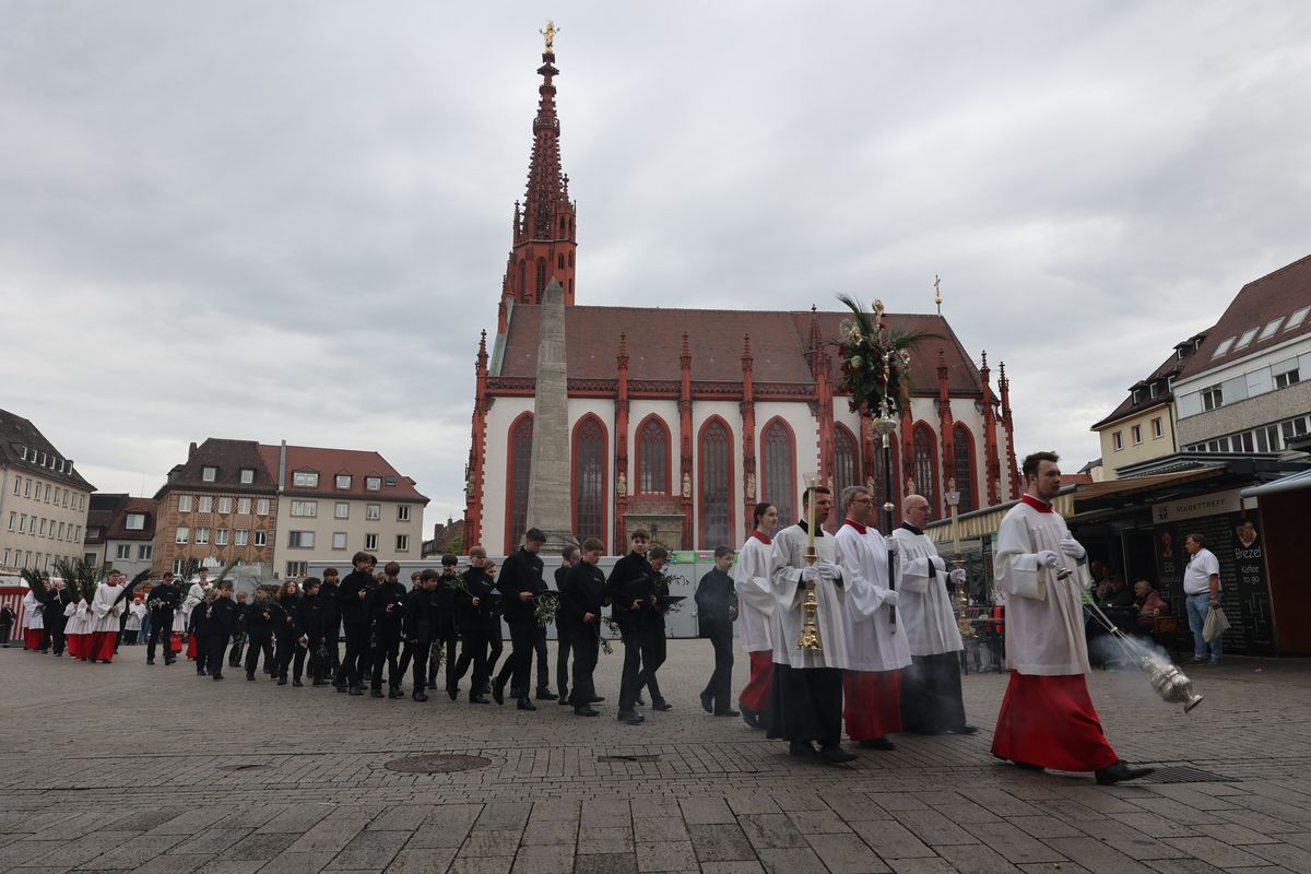 Nach der Palmweihe in der Marienkapelle zog der Bischof mit Mitgliedern des Domkapitels und zahlreichen Gläubigen zum Kiliansdom, wo er das Pontifikalamt zelebrierte. Im Gottesdienst wurde die Geschichte vom Leiden und Sterben Jesu nach Lukas verlesen. Der Aufbau- und Konzertchor der Domsingknaben und das Bläserensemble am Dom unter der Leitung von Domkantor Julian Beutmiller gestalteten die Feier mit der „Missa fidem cantemus“ von Christian M. Heiß, „Gesängen zum Palmsonntag“ von Franz Schubert, „Dir nur galten meine Tränen“ von Antonio Caldara. Domorganist Professor Stefan Schmidt spielte die Klais-Orgel. Es erklang unter anderem die „Toccata b-Moll“ von Louis Vierne.