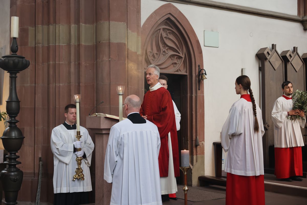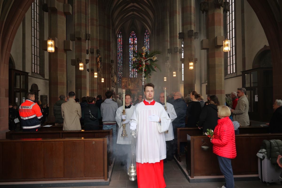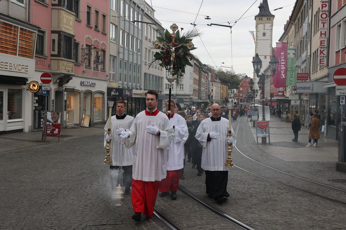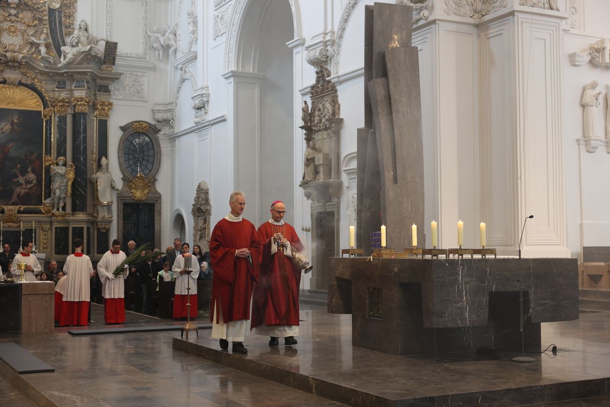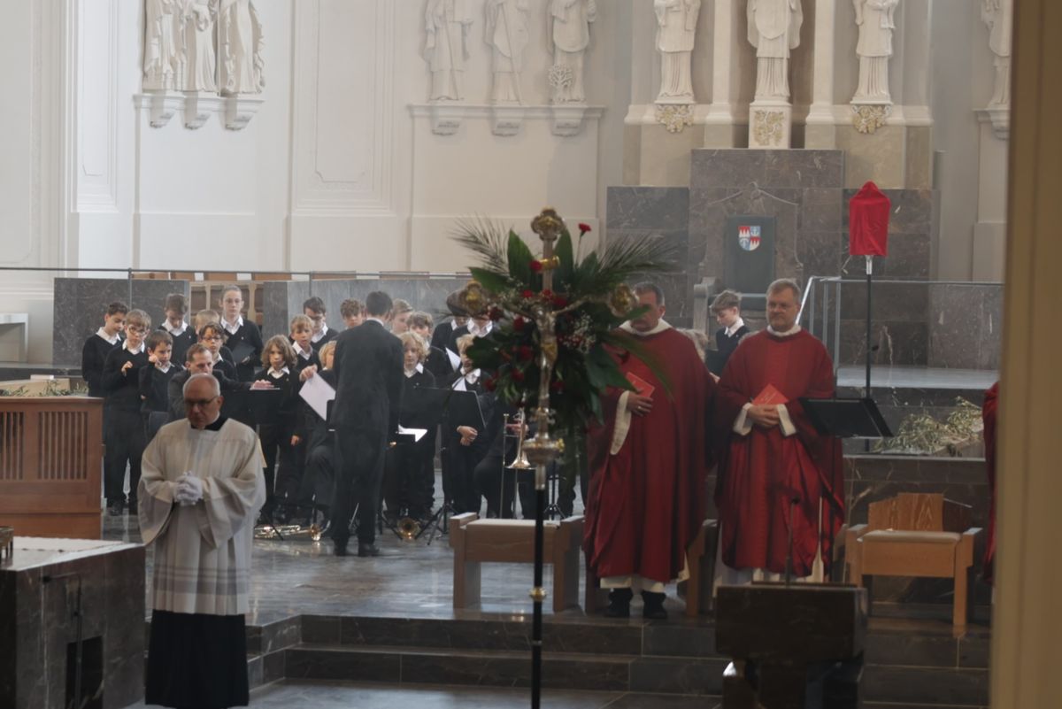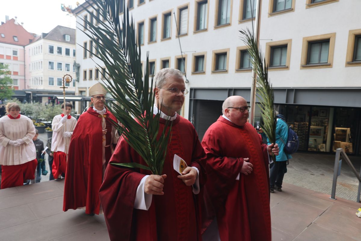 Nach der Palmweihe in der Marienkapelle zog der Bischof mit Mitgliedern des Domkapitels und zahlreichen Gläubigen zum Kiliansdom, wo er das Pontifikalamt zelebrierte. Im Gottesdienst wurde die Geschichte vom Leiden und Sterben Jesu nach Lukas verlesen. Der Aufbau- und Konzertchor der Domsingknaben und das Bläserensemble am Dom unter der Leitung von Domkantor Julian Beutmiller gestalteten die Feier mit der „Missa fidem cantemus“ von Christian M. Heiß, „Gesängen zum Palmsonntag“ von Franz Schubert, „Dir nur galten meine Tränen“ von Antonio Caldara. Domorganist Professor Stefan Schmidt spielte die Klais-Orgel. Es erklang unter anderem die „Toccata b-Moll“ von Louis Vierne.