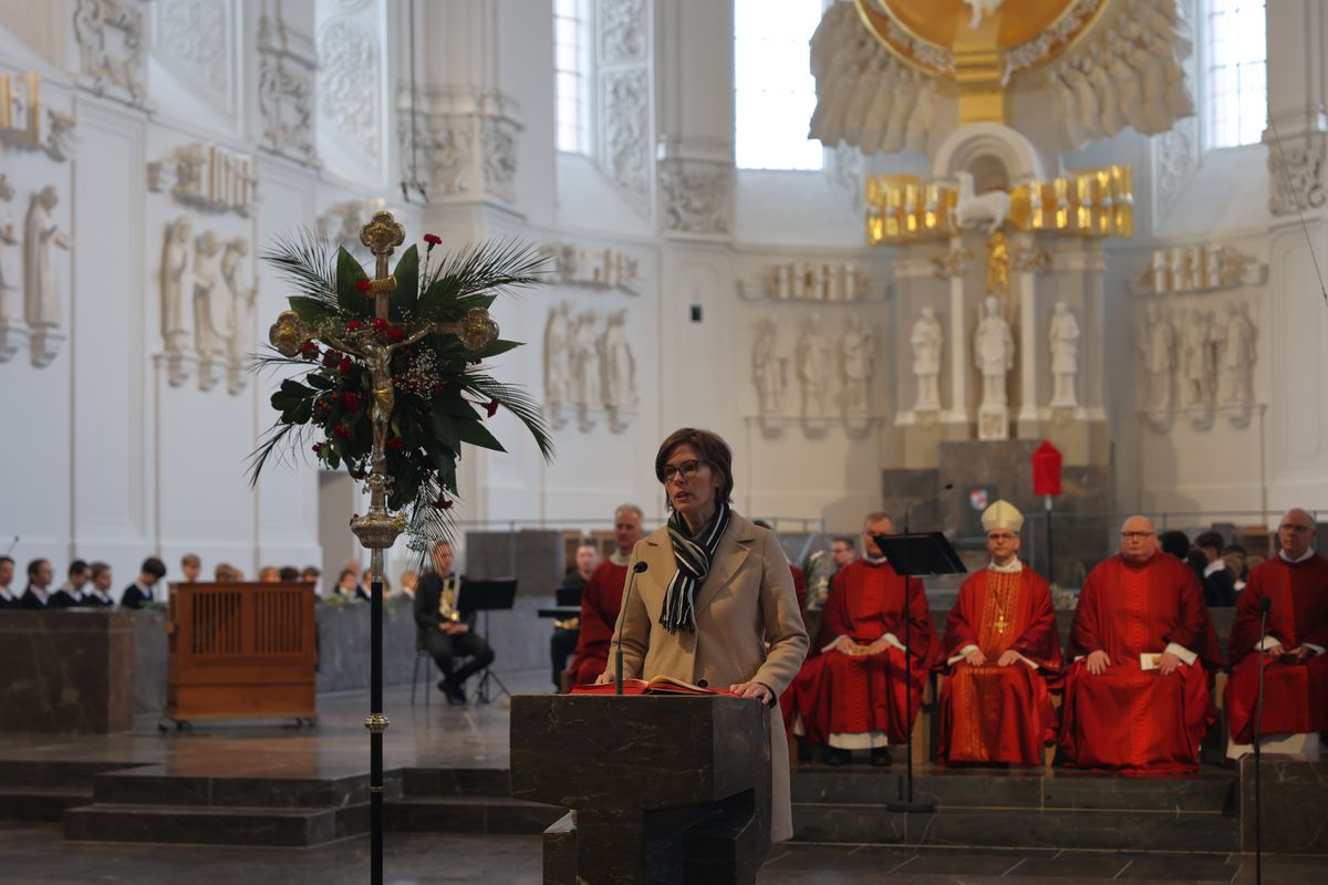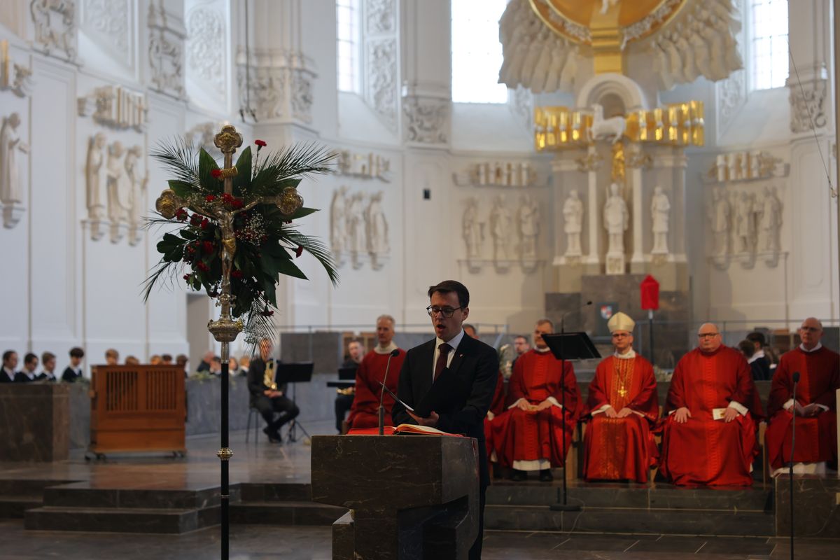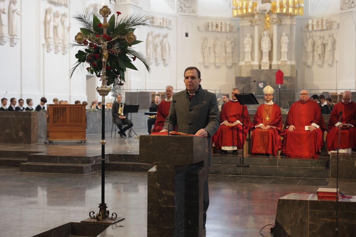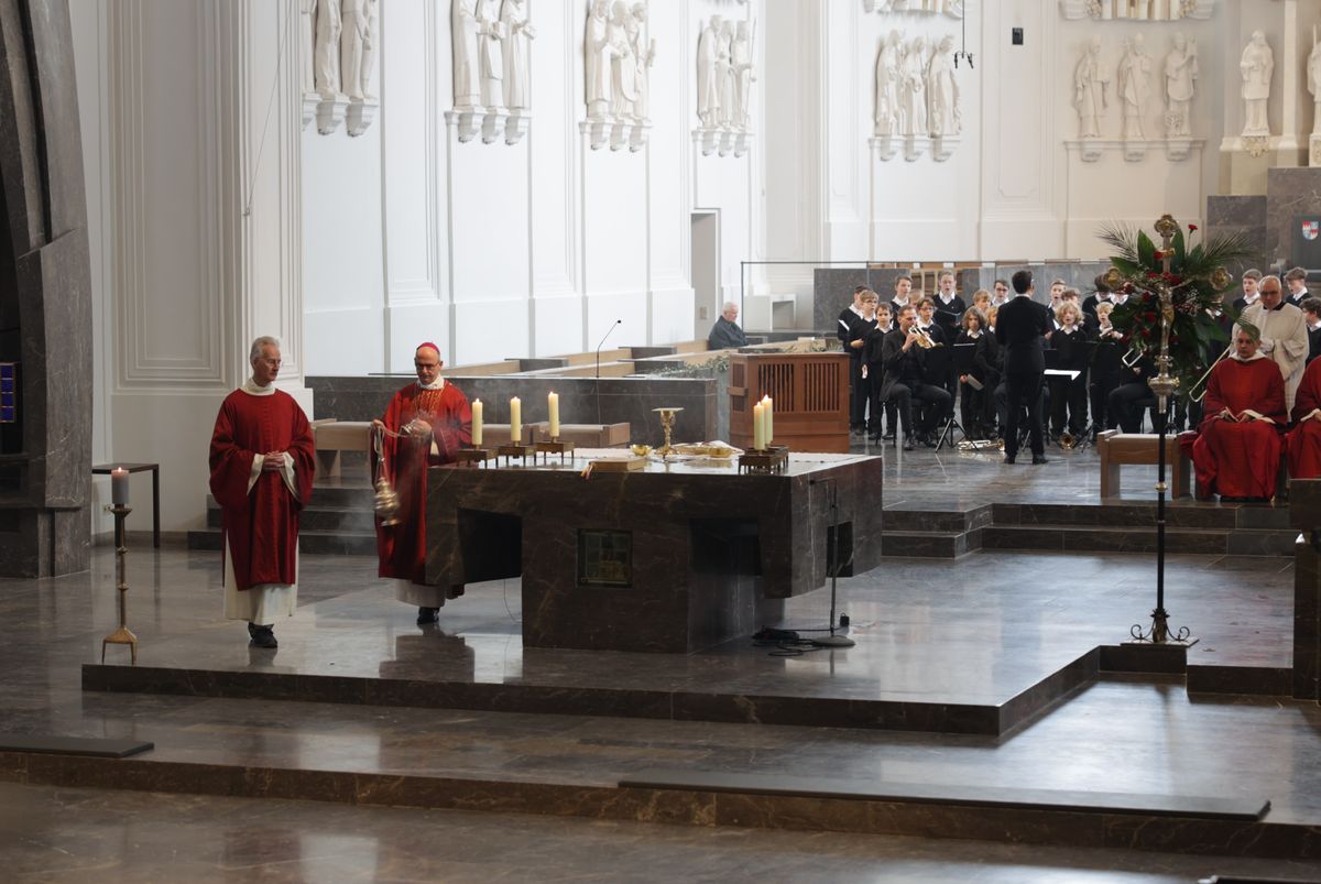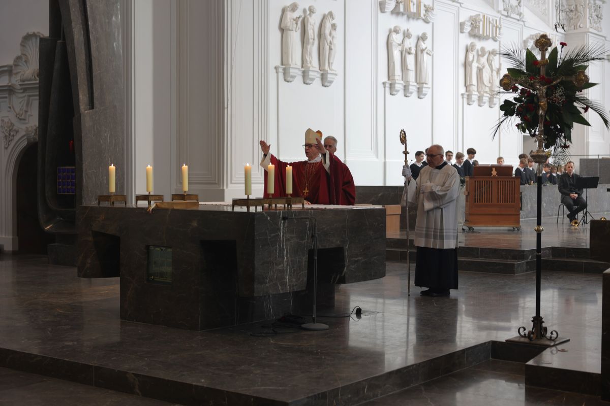Nach der Palmweihe in der Marienkapelle zog der Bischof mit Mitgliedern des Domkapitels und zahlreichen Gläubigen zum Kiliansdom, wo er das Pontifikalamt zelebrierte. Im Gottesdienst wurde die Geschichte vom Leiden und Sterben Jesu nach Lukas verlesen. Der Aufbau- und Konzertchor der Domsingknaben und das Bläserensemble am Dom unter der Leitung von Domkantor Julian Beutmiller gestalteten die Feier mit der „Missa fidem cantemus“ von Christian M. Heiß, „Gesängen zum Palmsonntag“ von Franz Schubert, „Dir nur galten meine Tränen“ von Antonio Caldara. Domorganist Professor Stefan Schmidt spielte die Klais-Orgel. Es erklang unter anderem die „Toccata b-Moll“ von Louis Vierne.