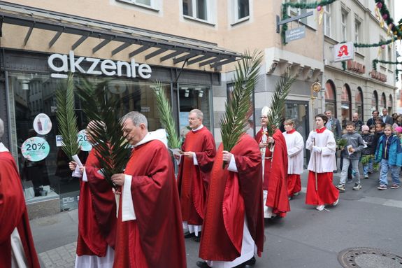 Die Liturgie des Palmsonntags erinnert an den Einzug Jesu auf einem Esel in Jerusalem. Zum Zeichen seines Königtums streute ihm das Volk Palmzweige und jubelte. Da in Mittel- und Nordeuropa keine Palmen wachsen, ersetzte man diese durch Palmkätzchen oder andere Zweige. Mit gesegneten Palmkätzchenzweigen ziehen die Gläubigen zum Gotteshaus und nehmen sie nach der Messe mit nach Hause. Daheim werden sie in den sogenannten Herrgottswinkel gestellt oder am Kruzifix und an Heiligenbildern befestigt. Die Kollekte am Palmsonntag ist für die Unterstützung der Christen im Heiligen Land bestimmt. Sie stand diesmal unter dem Motto „Schritt für Schritt. Aufeinander zugehen“.