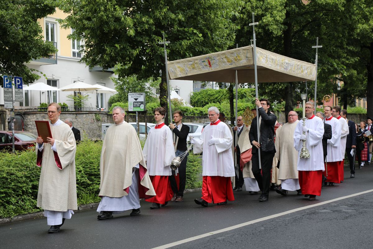 Bischof Dr. Franz Jung feiert am Fronleichnamstag um 8.30 Uhr eine Pontifikalmesse im Würzburger Kiliansdom. Der Domchor unter der Leitung von Domkapellmeister Alexander Rüth gestaltet die heilige Messe musikalisch. Domorganist Professor Stefan Schmidt spielt die Klais-Orgel. Es erklingen die Messe in D (Orgelfassung in Teilen) von Antonín Dvořák, „Lauda Sion“ von Giovanni P. da Palestrina, „Tantum ergo“ von Tomas Luis de Victoria und „Exsultate Deo“ von Alessandro Scarlatti. Bei der Prozession spielt das Blasorchester Kürnach. Gegen 9.30 Uhr beginnt die Prozession durch die Würzburger Innenstadt. Der Prozessionsweg führt vom Dom über die Schönbornstraße, Juliuspromenade und Theaterstraße zum Stationenaltar im Ehrenhof der Residenz. Zum Abschluss der Statio erteilt Bischof Jung den eucharistischen Segen mit der Monstranz. Danach zieht die Prozession weiter über die Balthasar-Neumann-Promenade, Neubaustraße, Schönthal- und Plattnerstraße zur Treppe des Neumünsters. Mit dem Segen auf den Treppen des Neumünsters endet die Prozession. Die Texte für die Prozession hat das Referat Verkündigung und Liturgie des Bistums Würzburg herausgegeben. Das Textheft steht im Internet unter liturgie.bistum-wuerzburg.de/downloads/fronleichnam zum Download bereit. Neben den Gläubigen der Innenstadtpfarreien begleiten die Mitglieder des Domkapitels und Vertreter des öffentlichen Lebens das Allerheiligste durch die Stadt. Ordensleute, Mitglieder der Ritterorden, Verbände, Vereine, Studentenverbindungen und Innungen beteiligen sich ebenfalls an der Prozession.