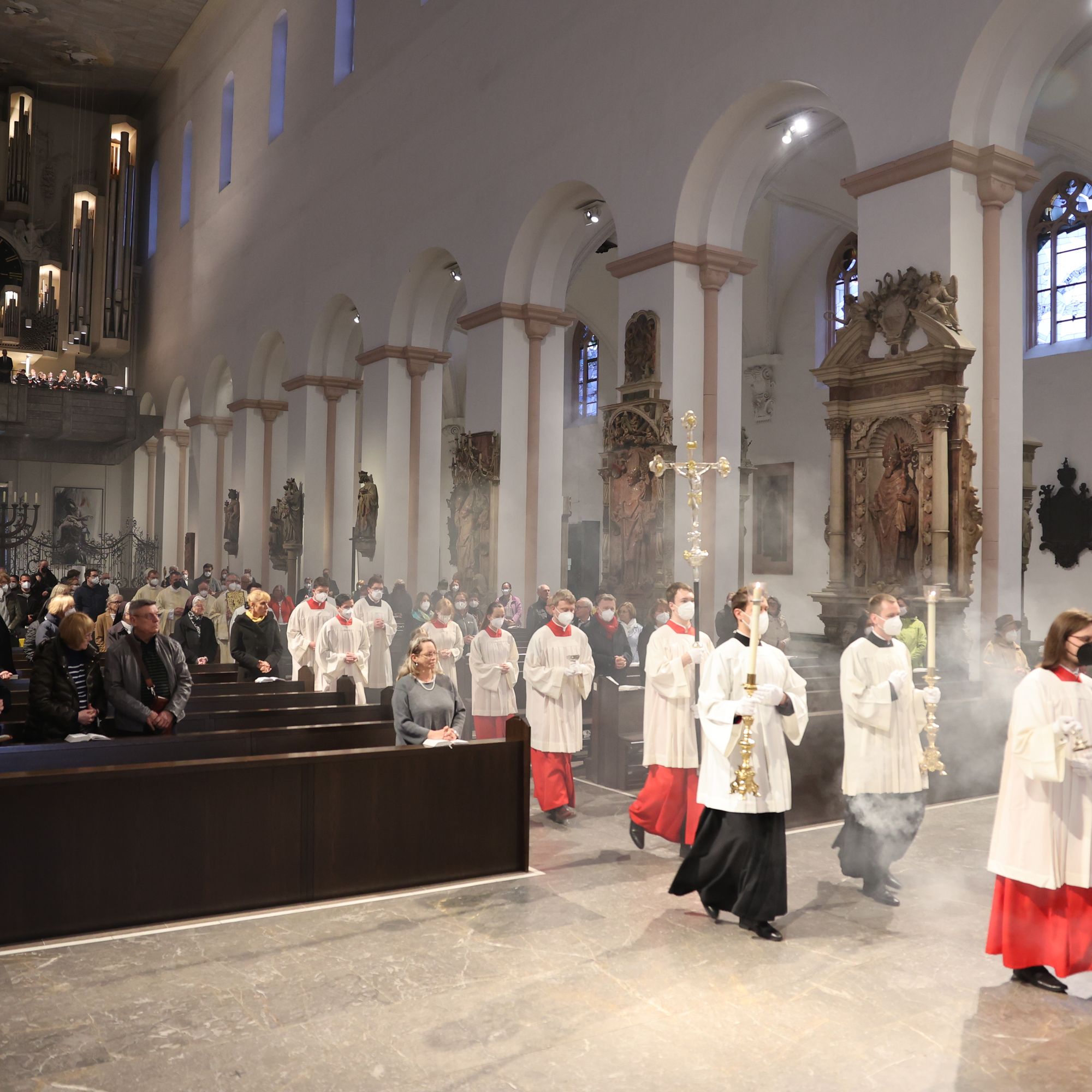 Für die musikalische Gestaltung sorgten Domorganist Professor Stefan Schmidt und der Würzburger Domchor unter der Leitung von Domkapellmeister Professor Christian Schmid mit der „Missa sine nomine“ von Ludovico Grossi da Viadana, „Christus factus est“ von Ludwig Ebner, „Ubi caritas et amor“ von Maurice Duruflé, „Unser Herr Jesus Christus in der Nacht, da er verraten ward“ von Heinrich Schütz und „Pange lingua“ von Anton Bruckner. Nach dem Gloriagesang verstummten Glocken und Orgel. Erst beim Gloria in der Osternacht werden sie wieder erklingen. Am Ende der Messe übertrugen Bischof Jung und Mitglieder des Domkapitels das Allerheiligste in die Sepultur. Schmuck, Kerzen und Decken wurden vom Altar entfernt. Der Tabernakel blieb offen und leer.