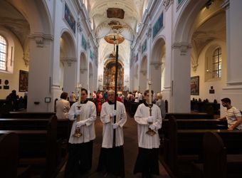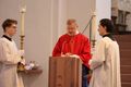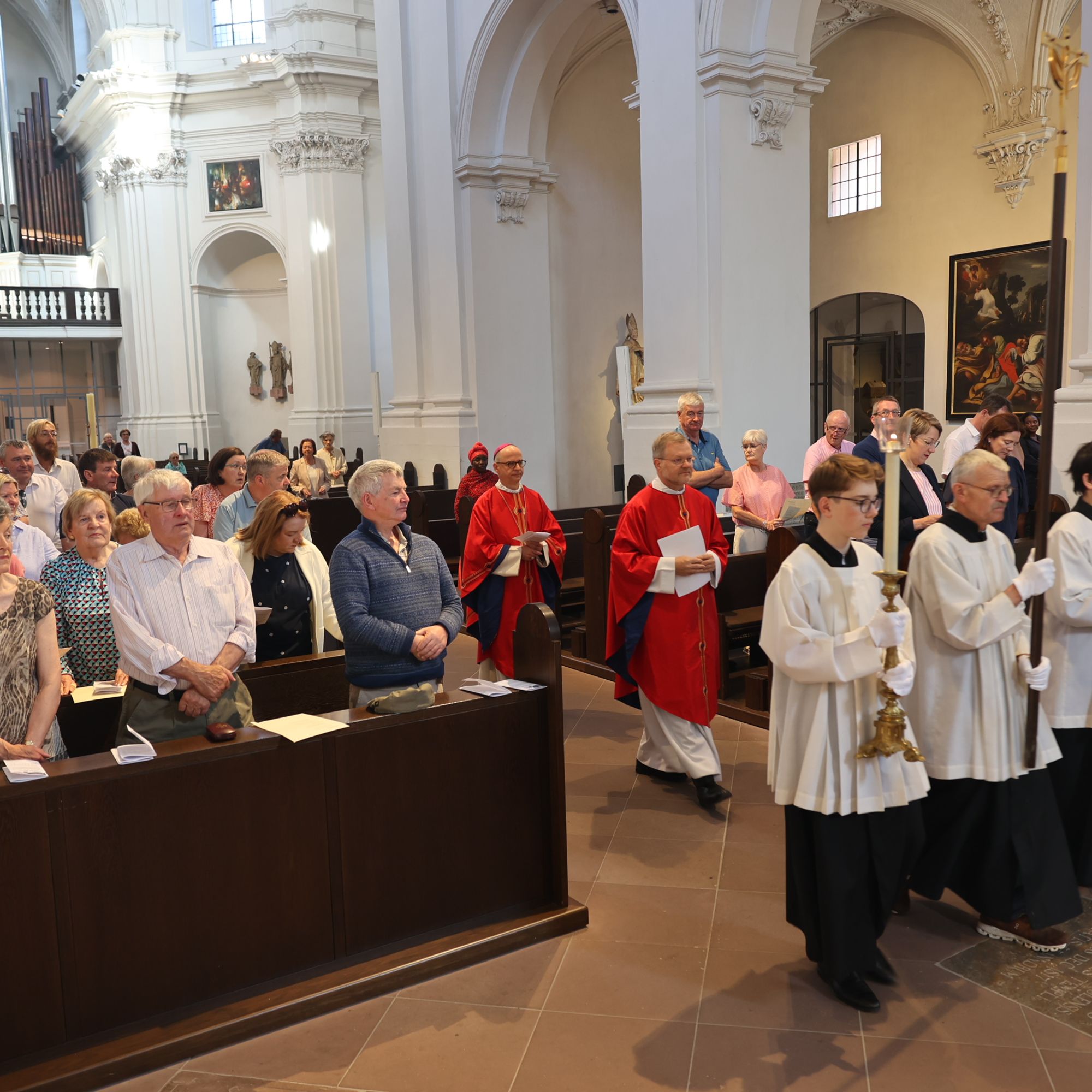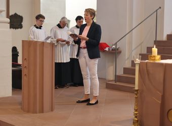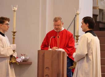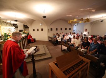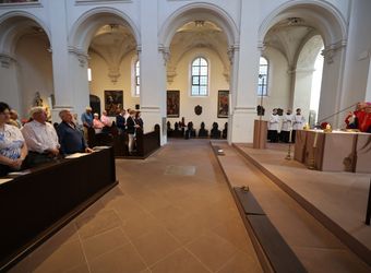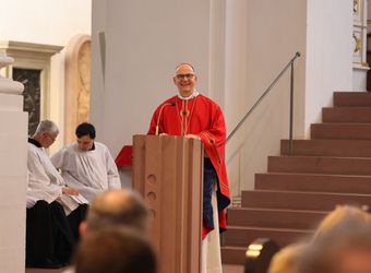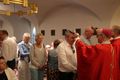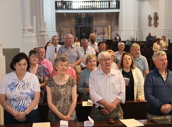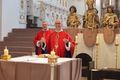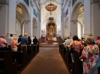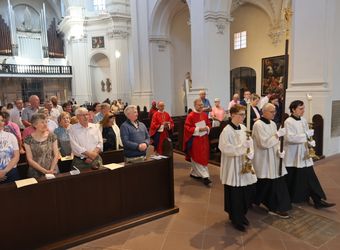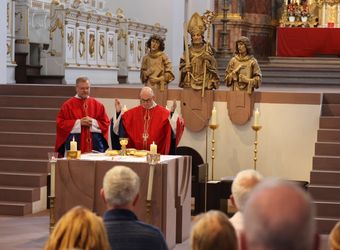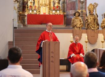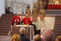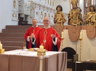 Würzburg (POW) Einen Gottesdienst in englischer Sprache haben Bischof Dr. Franz Jung und Generalvikar Dr. Jürgen Vorndran am Montag, 8. Juli, im Würzburger Neumünster mit der Delegation aus dem irischen Mullagh, Heimatort des heiligen Kilian, gefeiert. Danach besichtigte die Gruppe in der Würzburger Universitätsbibliothek bedeutende Bücher aus der Zeit der Frankenapostel sowie irischer Herkunft (siehe eigener Bericht).