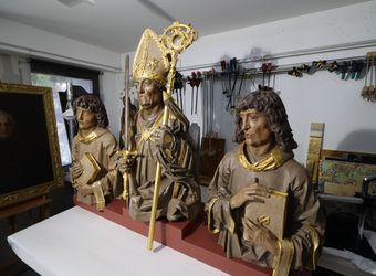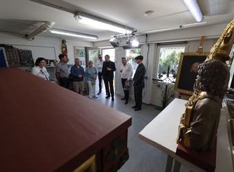 Zum Abschluss der Tour besichtigte die Gruppe in Randersacker bei einem Restaurator den Abguss der Büsten der Frankenapostel aus dem Neumünster und eine Replik des Altars für die Gebeine von Kilian und Gefährten aus der Neumünsterkrypta. Beide werden bei der Wallfahrt des Bistums Würzburg im Oktober in Irland den Gastgebern als Geschenk überreicht. Hergestellt wurden die Kopien von Büsten und Altar zum 1300-Jahr-Jubiläum des Martyriums der Frankenapostel, wo sie auf einem Wagen durch die Innenstadt gefahren wurden. Seither waren die Büsten im Haus des Frankenbunds, die Altarkopie in einer Scheune im Ochsenfurter Gau aufbewahrt.