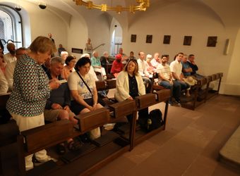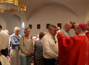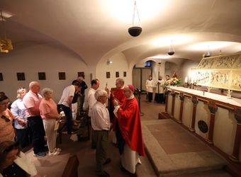 Bis heute stehe die Kirche in Unterfranken auf dem Fundament, das die Frankenapostel gelegt haben, sagte Bischof Jung. „Ahmen wir ihren Glauben nach und erneuern wir ihn in unserer Zeit. Jesus Christus, dessen Stern schon Kilian und seinen Gefährten aufgegangen ist, leuchtet bis heute auch uns“, betonte der Bischof. Am Schrein der Märtyrer in der Krypta des Neumünsters erteilten der Bischof und sein Generalvikar den irischen Pilgern einzeln den Segen mit Reliquiaren der Frankenapostel. Zuvor beteten alle gemeinsam das Gebet der Frankenapostel.
