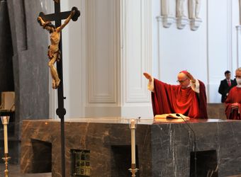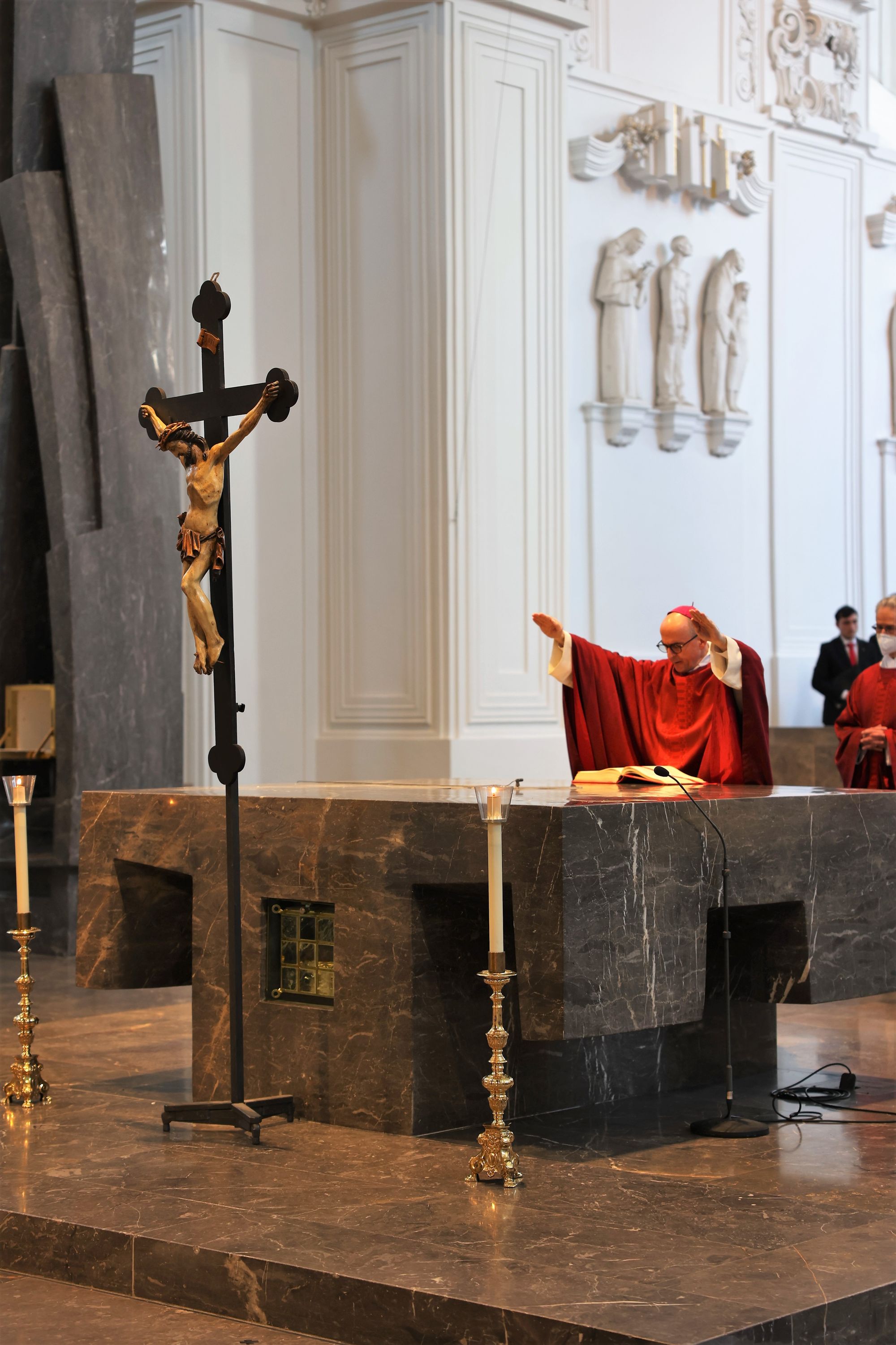 Das Bekenntnis „Im Kreuz ist Heil, im Kreuz ist Leben, im Kreuz ist Hoffnung“ sei gewagt, verweise es doch auf die Demütigung des Menschen Jesus Christus. Zugleich stehe es dafür, dass Jesus sich trotz aller Versuche, ihm die Würde zu rauben, nicht beugen lasse. „Jesus weiß sich gerade im Leiden von der Liebe seines himmlischen Vaters gehalten. Das gibt ihm die Kraft, die zugefügte Schmach zu ertragen. Im großen Tausch der Gefühle tauscht er die erlittene Beschämung nicht in Hass, sondern in Liebe.“ So werde das Kreuz zum Zeichen des Unheils und des Heils zugleich, erklärte der Bischof. „Das enthüllte Kreuz fragt uns auch, ob wir ein mitfühlendes Herz haben, das den Schmerz nachempfinden kann, der dem Herrn zugefügt wurde und in ihm allen leidenden Schwestern und Brüdern weltweit.“