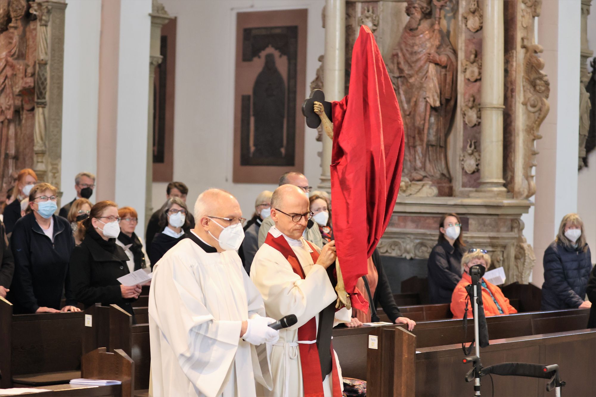 Bei den sogenannten Großen Fürbitten des Karfreitags beteten die Gläubigen für die heilige Kirche, für den Papst, für alle Stände der Kirche, für die Taufbewerber, für die Einheit der Christen, für die Juden, für alle Menschen, die nicht an Christus glauben, für alle Menschen, die nicht an Gott glauben, für die Regierenden und für alle Not leidenden Menschen. Aufgrund des Kriegs in der Ukraine wurde zudem eine zusätzliche Fürbitte eingefügt für alle Menschen in der Ukraine und in allen Kriegsgebieten der Erde, für alle, die vor der Gewalt geflohen sind, wie auch für alle, die mit ihrem Leben für die Abwehr des Feindes und den Schutz der Schwachen und Verfolgten einstehen. Bei der Kreuzverehrung, die vom Bischof und dem Domkapitel angeführt wurde, wurde das Kreuz enthüllt, den Gläubigen gezeigt und in stillem Gebet verehrt. Die Würzburger Domsingknaben unter der Leitung von Domkapellmeister Professor Christian Schmid sangen die „Johannespassion op. 18“ von Alois Maria Müller, „Also hat Gott die Welt geliebt“ von Heinrich Schütz, „Popule meus“ von Tomas Luis de Victoria sowie einen Gregorianischen Choral.
