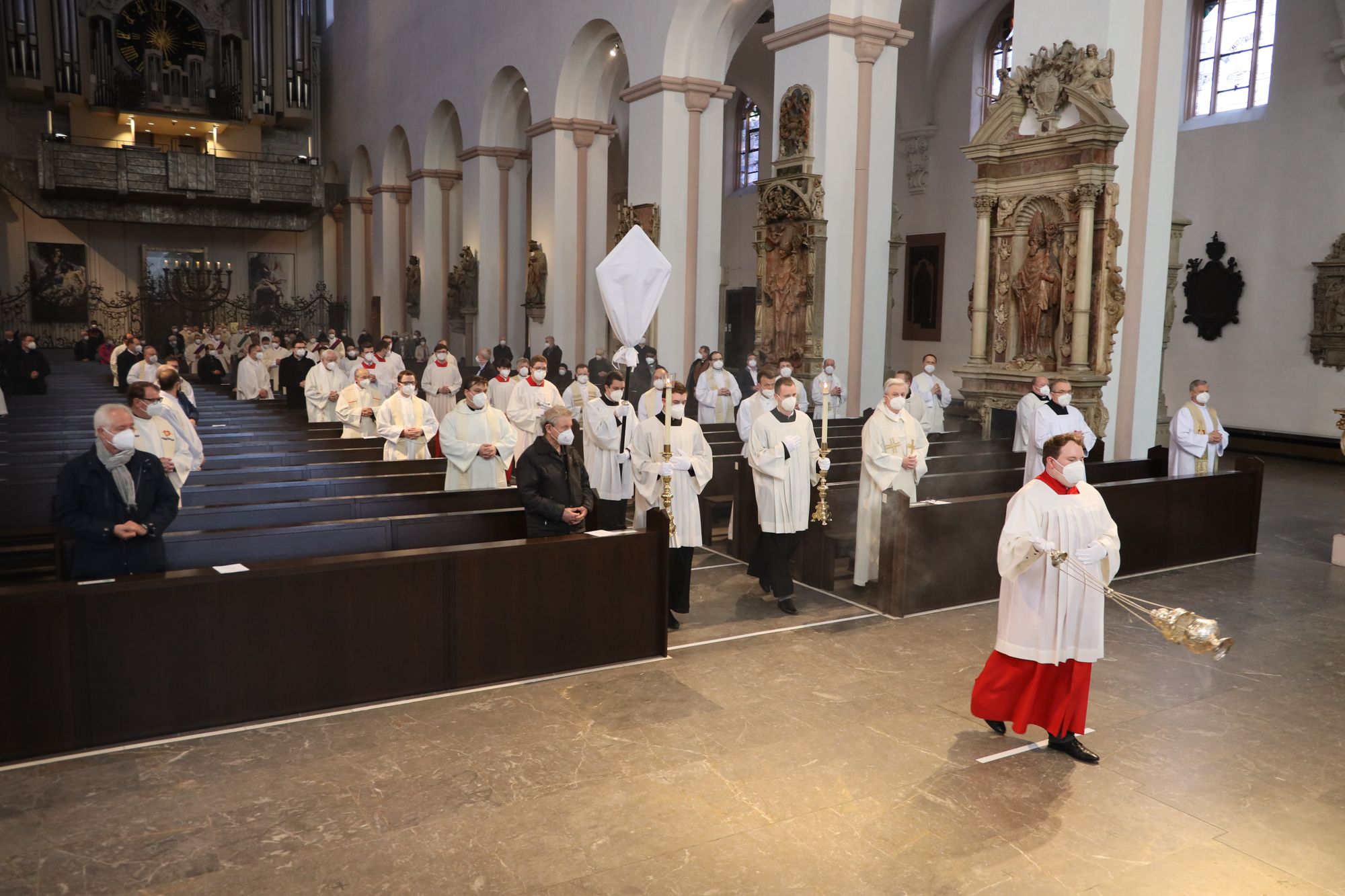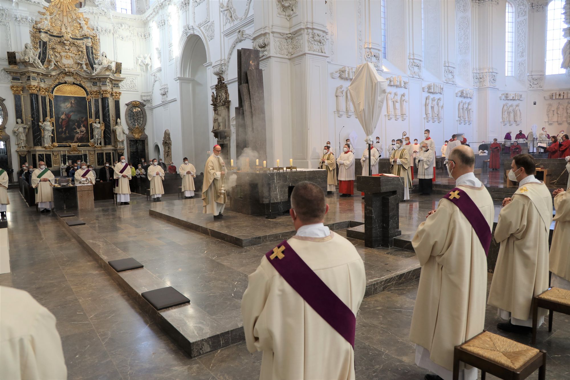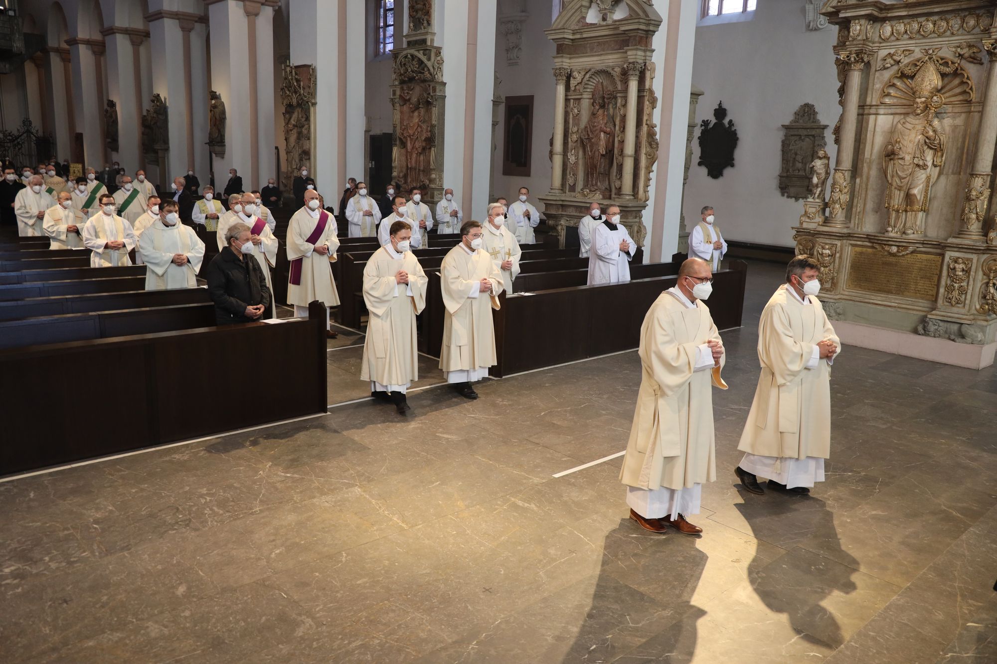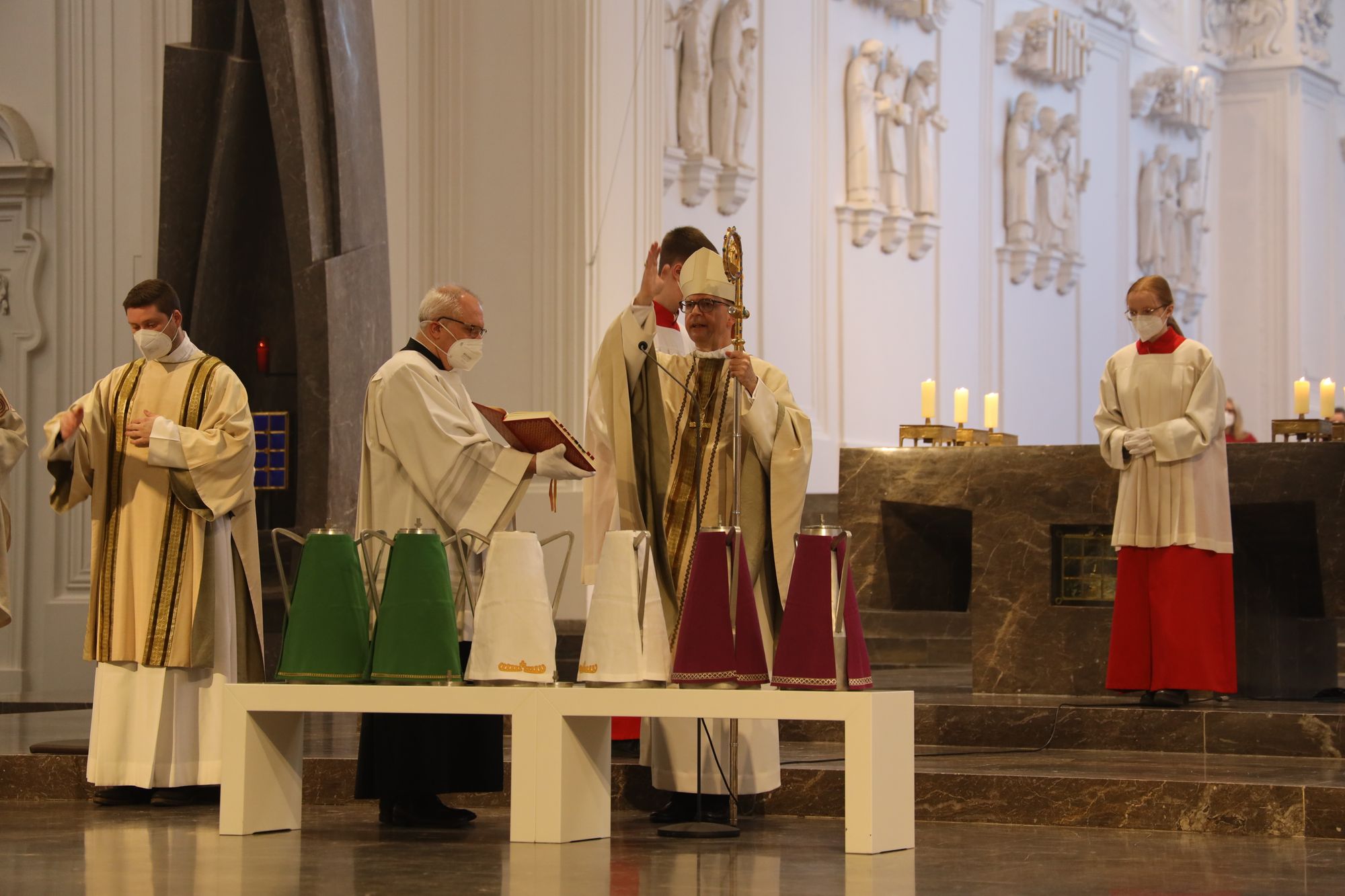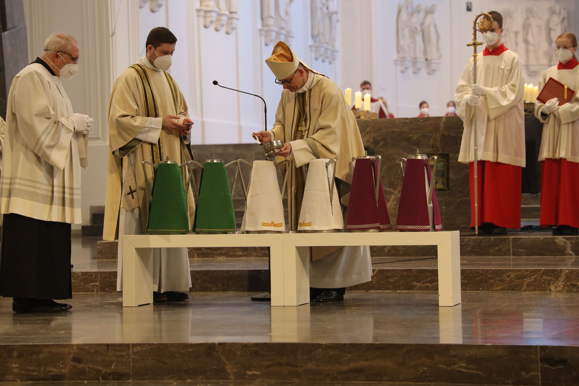 Würzburg (POW) Bischof Dr. Franz Jung hat am Montagnachmittag, 29. März, die Heiligen Öle für alle 156 Pfarreiengemeinschaften und 17 großen Einzelpfarreien im Bistum Würzburg im Würzburger Kiliansdom geweiht: das Katechumenenöl für die Salbung der Taufbewerber, das Chrisamöl für Taufe, Firmung, Priester- und Bischofsweihe sowie für die Weihe von Kirchen und Altären, das Krankenöl für die Krankensalbung. Die Priester und Diakone erneuerten im Gottesdienst ihr Weiheversprechen. Der Gottesdienst fand unter Einhaltung des Corona-Hygienekonzepts statt. Die nur einmal im Jahr stattfindende Chrisammesse feierte Bischof Jung zusammen mit Bischof em. Dr. Friedhelm Hofmann, Generalvikar Dr. Jürgen Vorndran sowie vier Dekanen als Vertretern des Diözesanklerus.