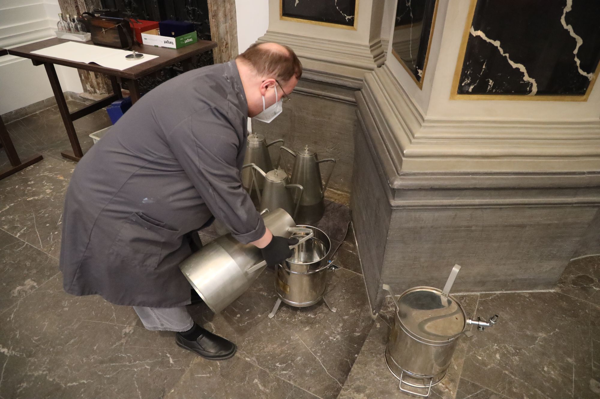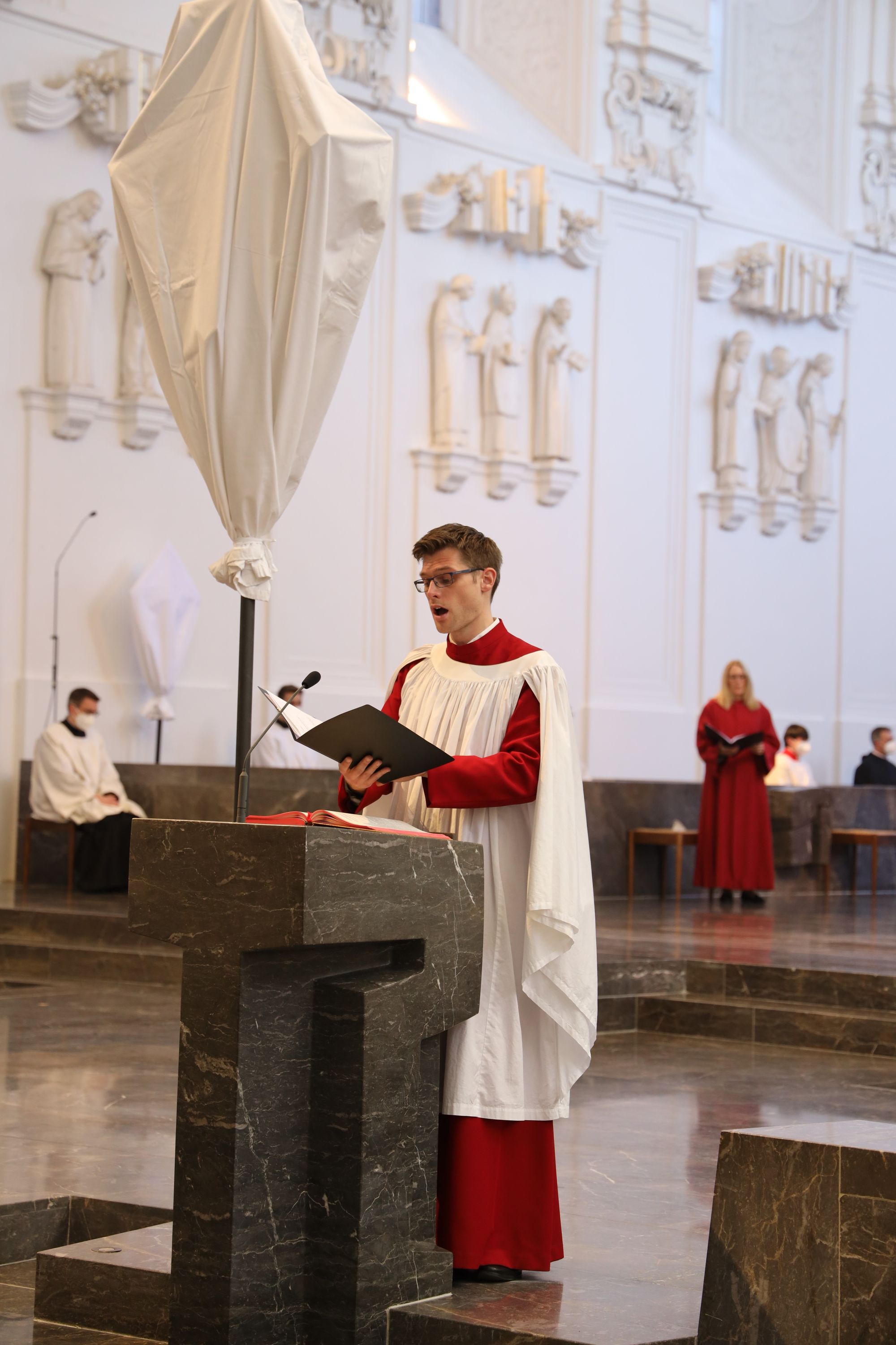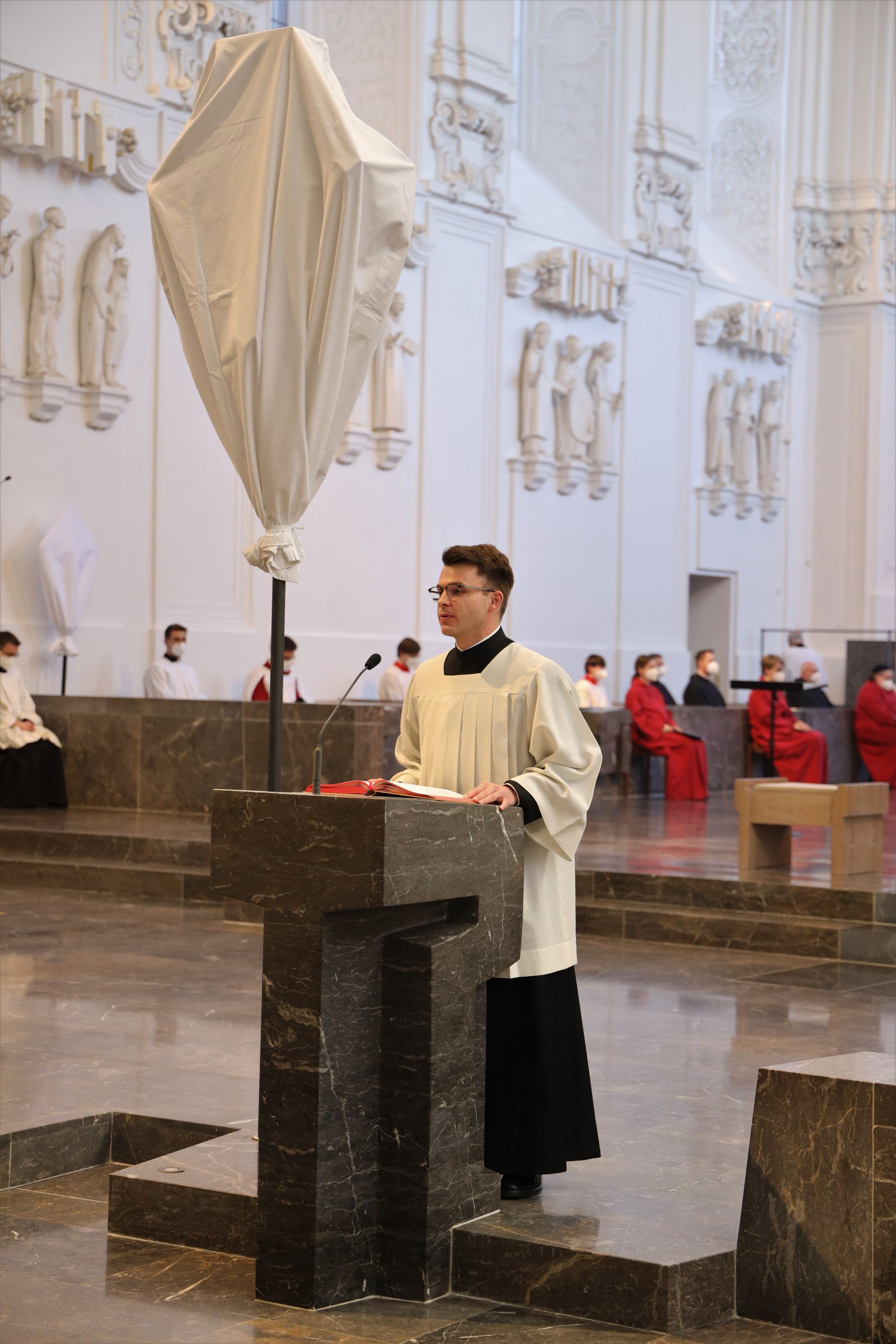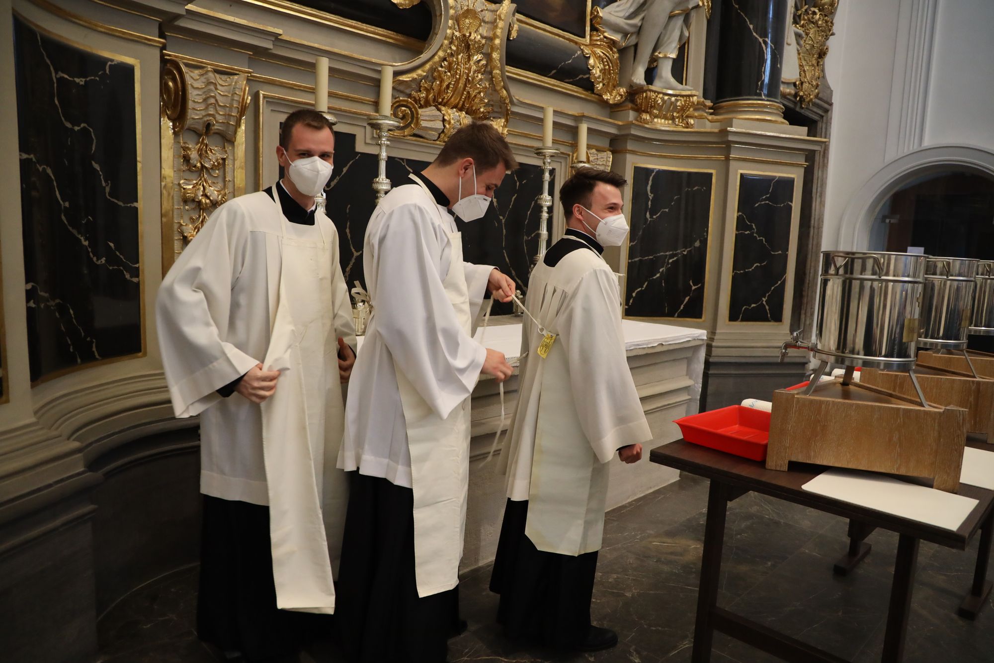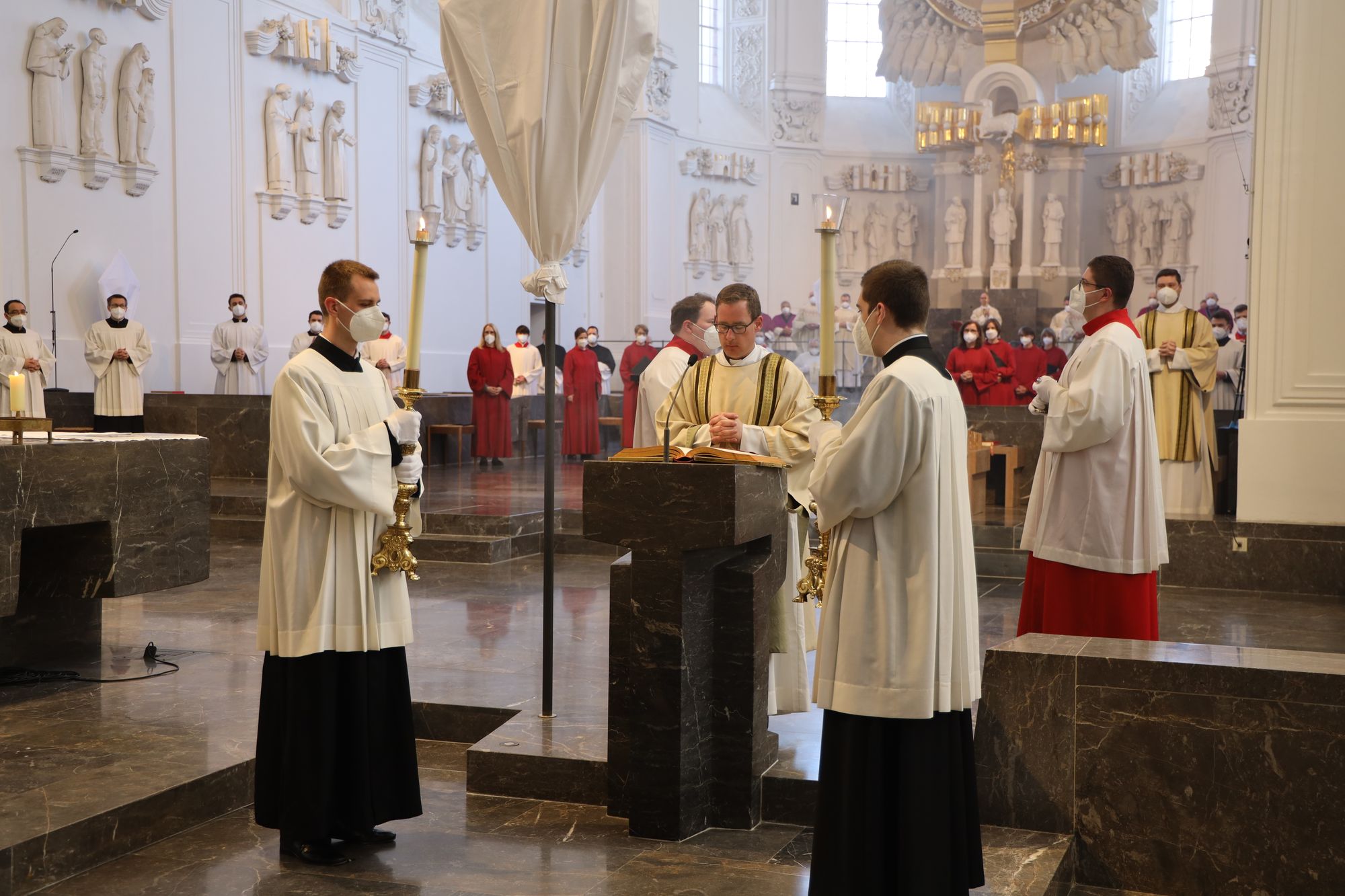 Würzburg (POW) Bischof Dr. Franz Jung hat am Montagnachmittag, 29. März, die Heiligen Öle für alle 156 Pfarreiengemeinschaften und 17 großen Einzelpfarreien im Bistum Würzburg im Würzburger Kiliansdom geweiht: das Katechumenenöl für die Salbung der Taufbewerber, das Chrisamöl für Taufe, Firmung, Priester- und Bischofsweihe sowie für die Weihe von Kirchen und Altären, das Krankenöl für die Krankensalbung. Die Priester und Diakone erneuerten im Gottesdienst ihr Weiheversprechen. Der Gottesdienst fand unter Einhaltung des Corona-Hygienekonzepts statt. Die nur einmal im Jahr stattfindende Chrisammesse feierte Bischof Jung zusammen mit Bischof em. Dr. Friedhelm Hofmann, Generalvikar Dr. Jürgen Vorndran sowie vier Dekanen als Vertretern des Diözesanklerus.