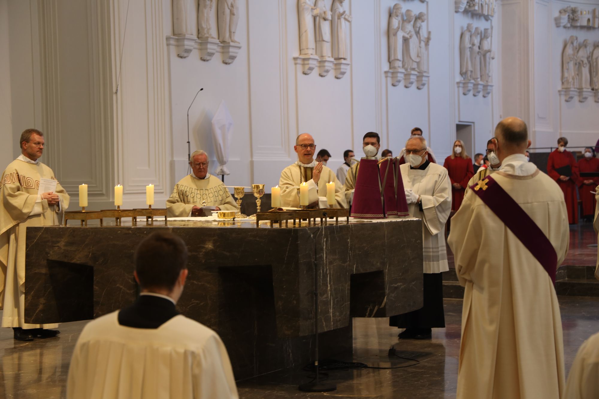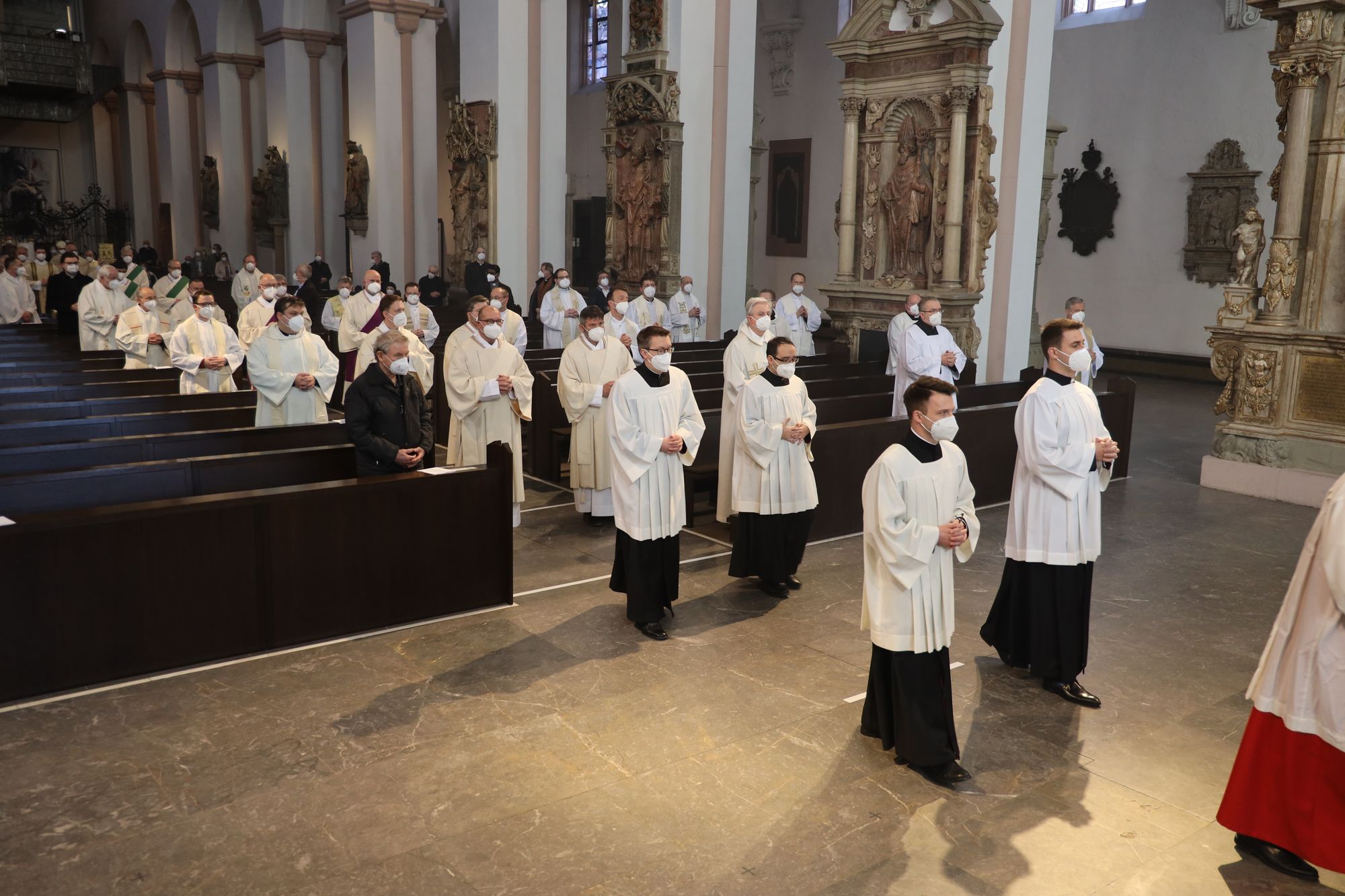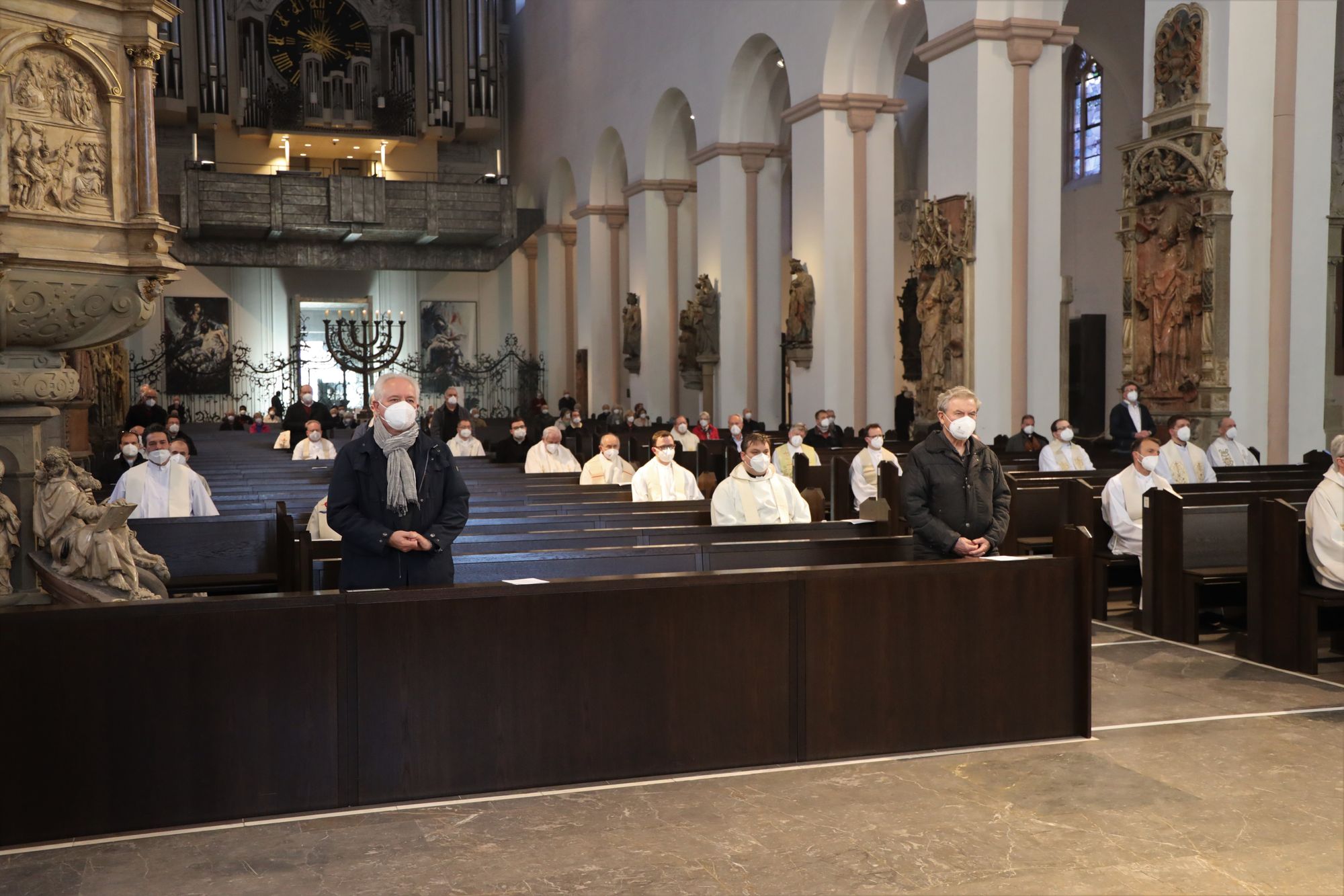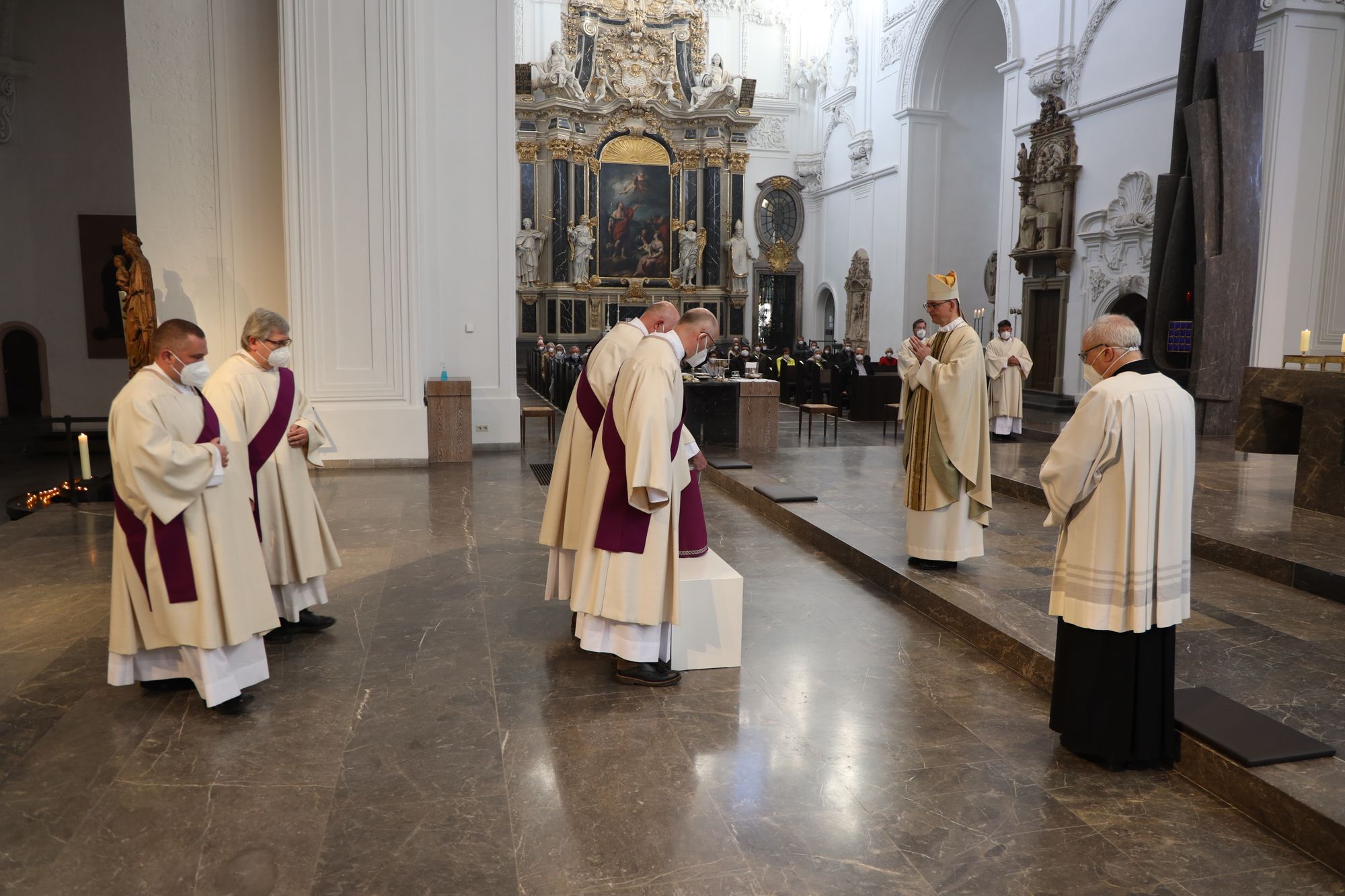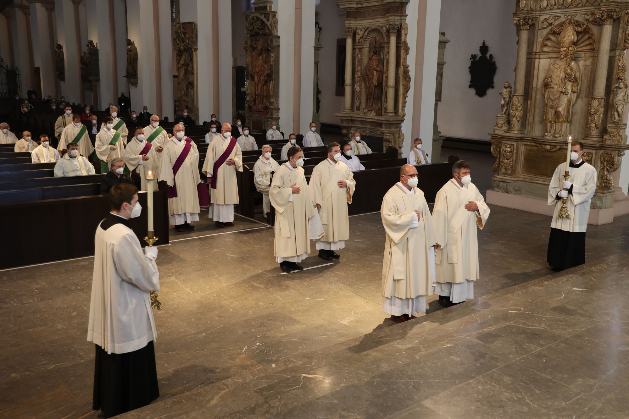 In seiner Predigt blickte Bischof Jung auf das mitbrüderliche Zusammenleben und Zusammenwirken. Jedem werde durch die Leitung „in solidum“ in den Pastoralen Räumen viel abverlangt, wenn diese erfolgreich praktiziert werden solle. „Unsere Einheit gründet in dem Einen, in Jesus Christus, dem wahren und einzigen Hohepriester seiner Kirche, der im Heiligen Geist die irdische Kirche mit dem Leben des dreifaltigen Gottes verbindet“, erklärte der Bischof. Zentral sei, dass jeder auch die Einheit wolle. „Wenn man sie nicht will, wird man 100 Gründe finden, mit denen man sich der Verpflichtung zur Einheit entziehen kann.“ Ihm sei klar, dass angesichts geringer werdenden pastoralen Personals es kaum möglich sein werde, „nur ‚Dream-Teams‘ oder Wohlfühlteams“ in den Pastoralen Räumen zusammenzustellen. Nach den Worten des Bischofs sind die Hauptamtlichen – Priester, Diakone, Pastoral und Gemeindereferentinnen und -referenten – aufgerufen, als Teams das notwendige Bemühen um Einheit selbst vorzuleben. „Hier gilt der Grundsatz des Führens durch Vorbild.“ Gelinge es den Hauptamtlichen nicht, die Einheit zu praktizieren, würden auch die Gemeinden im Pastoralen Raum nicht zusammenwachsen oder überhaupt den Impuls wahrnehmen, enger zu kooperieren, sagte Bischof Jung.