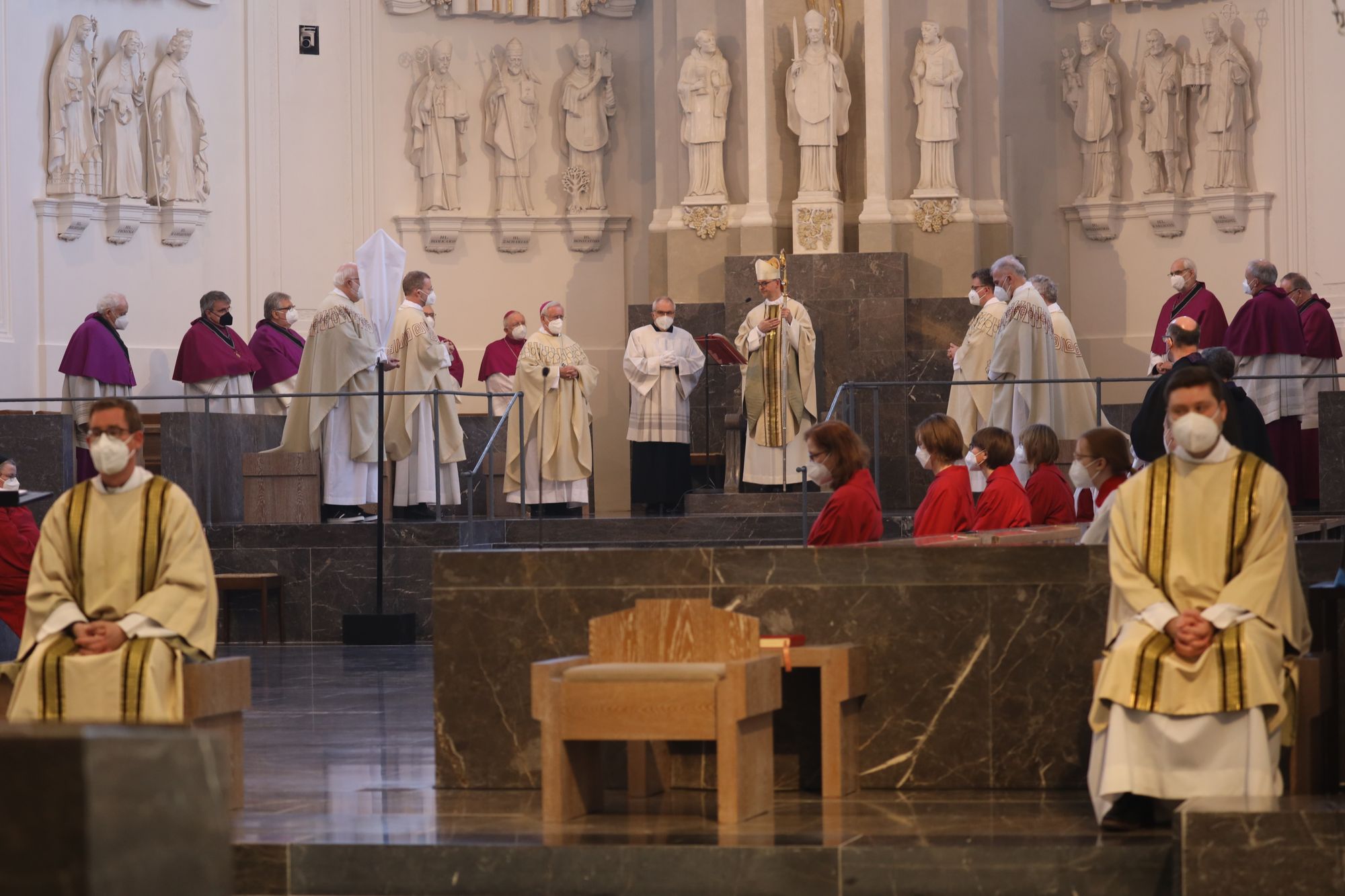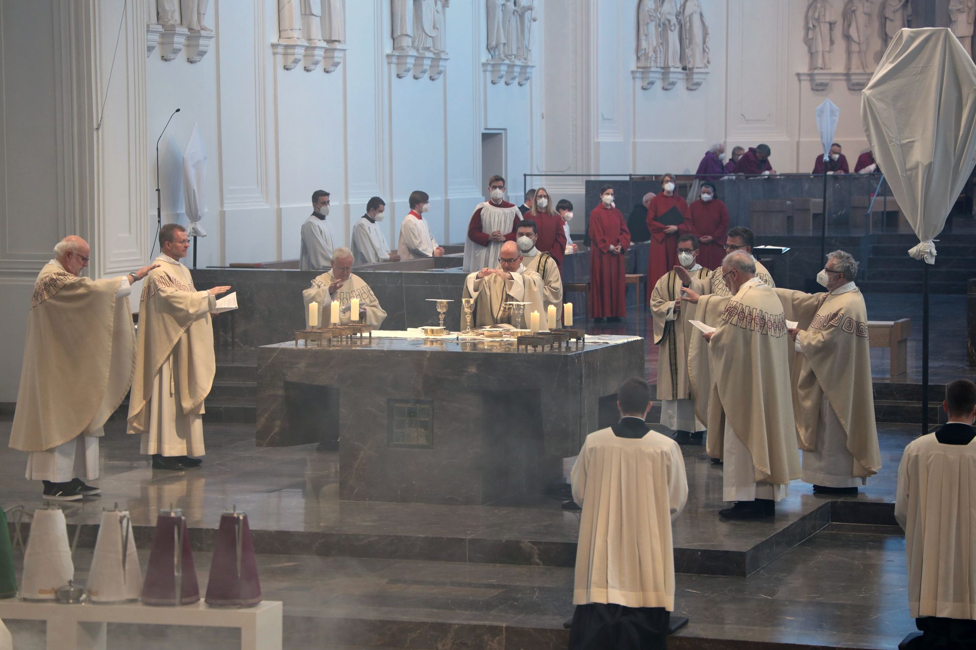 Das Krankenöl schließlich erinnere an Misserfolge, Verletzungen und Belastungen, die jeder mit sich herumtrage und die die Zusammenarbeit mitunter erschwerten oder gar unmöglich machten. „Dazu bedürfe es der Einübung einer Konfliktkultur, auf deren Basis es möglich wird, Probleme, Fehler und Konflikte offen anzusprechen und nach Wegen zu suchen, die Störungen im Miteinander zu beheben. „Die Mitbrüderlichkeit muss zur Geschwisterlichkeit werden“, forderte der Bischof. Die geweihten Amtsträger müssten sich als „Motoren der Einheit“ verstehen und den Raum eröffnen, „dass sich alle anderen einbringen und mitgestalten können“. „Wo Einheit überzeugend gelebt und vorgelebt wird, da wirkt sie anziehend.“