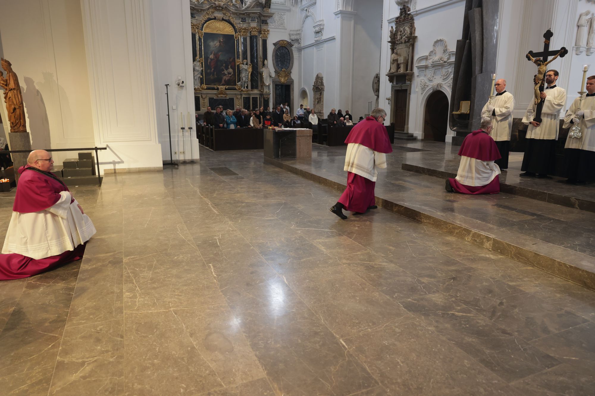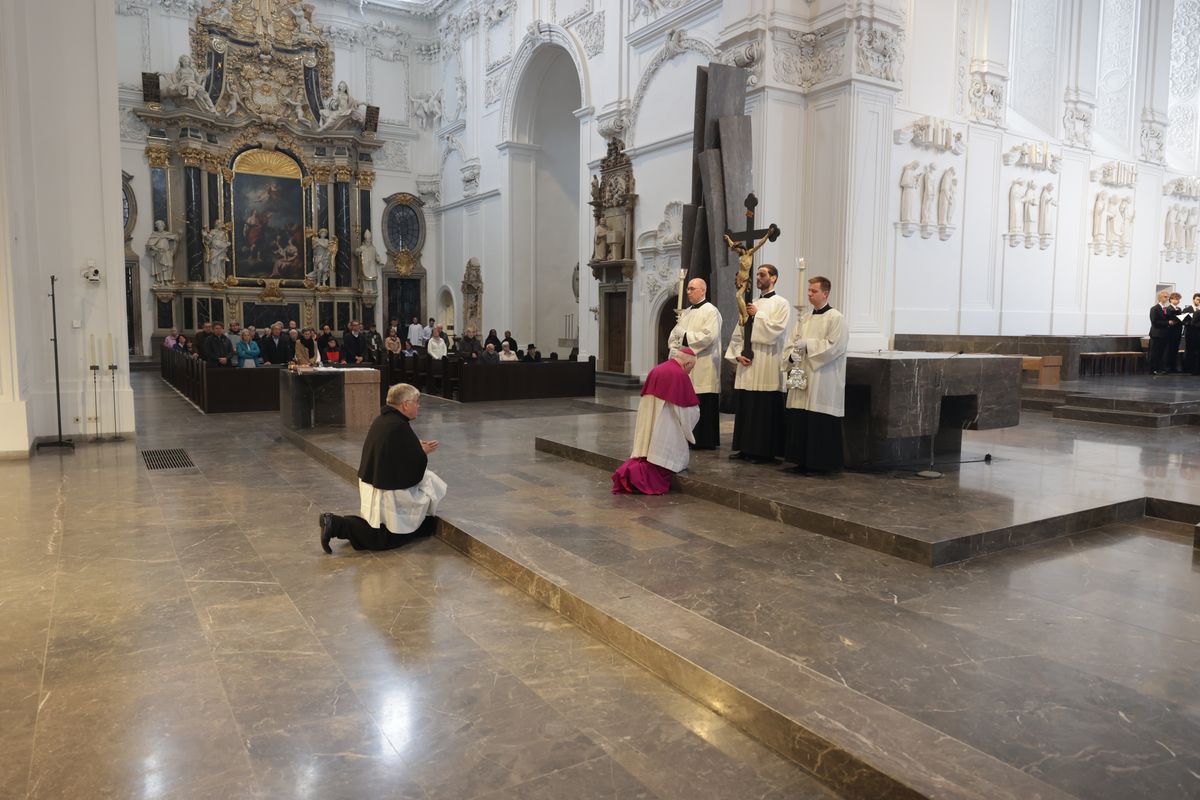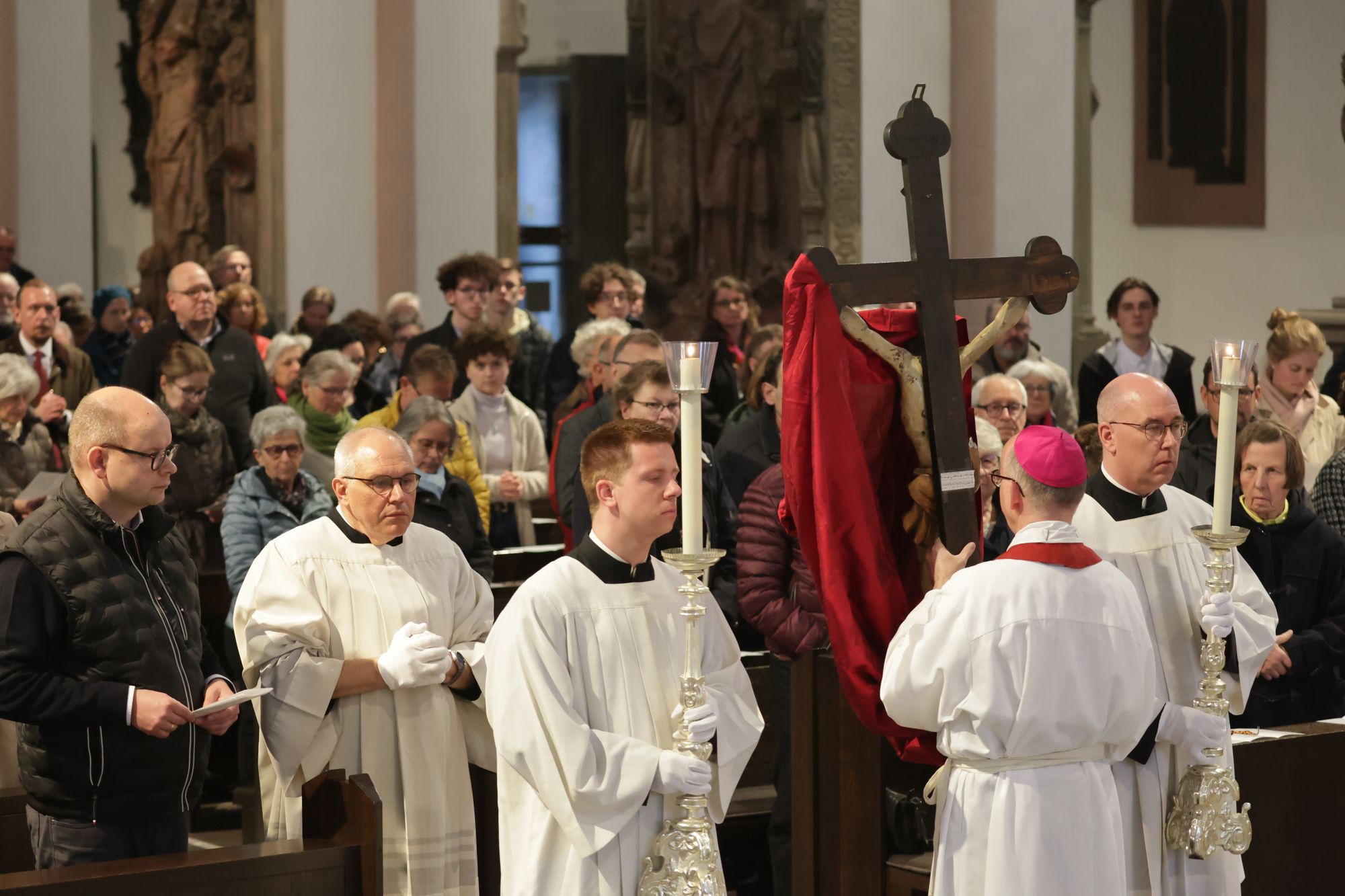 Bei den sogenannten Großen Fürbitten des Karfreitags beteten die Gläubigen für die heilige Kirche, für den Papst, für alle Stände der Kirche, für die Taufbewerber, für die Einheit der Christen, für die Juden, für alle Menschen, die nicht an Christus glauben, für alle Menschen, die nicht an Gott glauben, für die Regierenden und für alle Not leidenden Menschen. Zusätzlich wurde in diesem Jahr im Bistum Würzburg auch für die an Leib und Seele Missbrauchten gebetet. Bei der Kreuzverehrung wurde das Kreuz enthüllt, den Gläubigen gezeigt und in stillem Gebet verehrt. Die Würzburger Domsingknaben unter der Leitung von Domkantor Julian Beutmiller sangen die „Johannespassion, op. 18“ von Alois Maria Müller, „Eli, Eli!“ von Georgius Bárdos, „O crux ave“ von Rihards Dubra, „Popule meus“ von Tomás Luis de Victoria und „Also hat Gott die Welt geliebt“ von Heinrich Schütz.