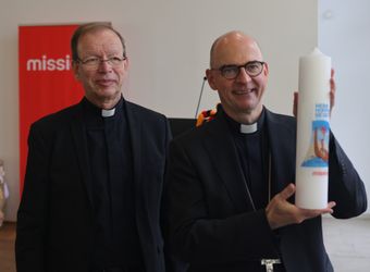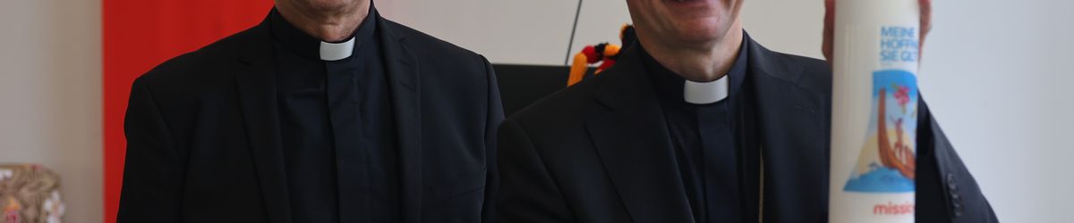 Monsignore Wolfgang Huber von "missio" überreichte dem Gastgeber Bischof Dr. Franz Jung (rechts) zum Dank eine Kerze.