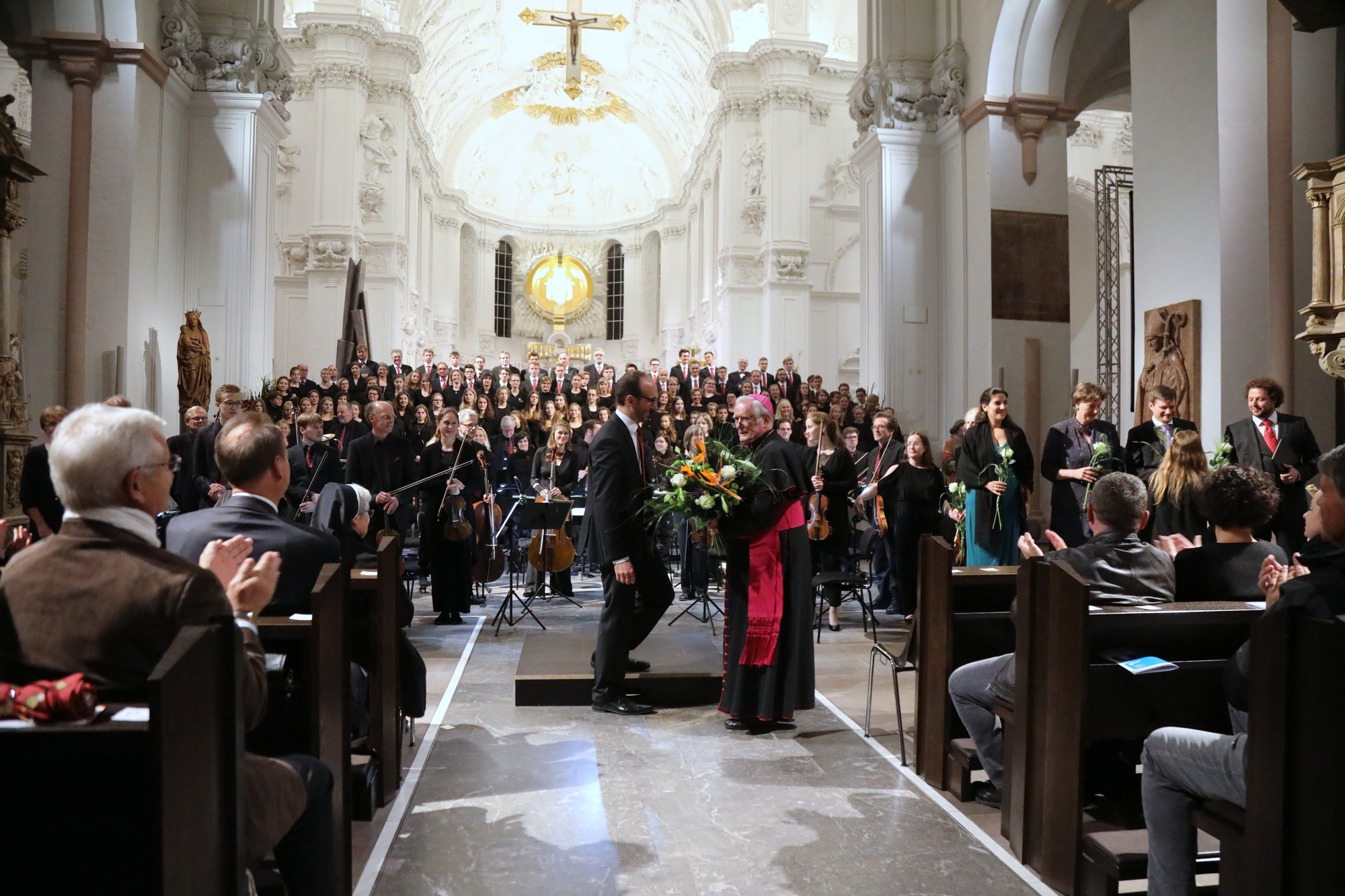 Würzburg (POW) Lang anhaltenden stehenden Applaus haben am Samstagabend, 16. September, die Besucher des Jubiläumskonzerts anlässlich des 25. Jubiläums der Bischofsweihe von Bischof Dr. Friedhelm Hofmann im Würzburger Dom gespendet. Unter der Leitung von Domkapellmeister Christian Schmid musizierten der Würzburger Domchor, die Mädchenkantorei am Würzburger Dom sowie der Herrenchor der Würzburger Domsingknaben und das Orchester La Banda auf historischen Instrumenten.