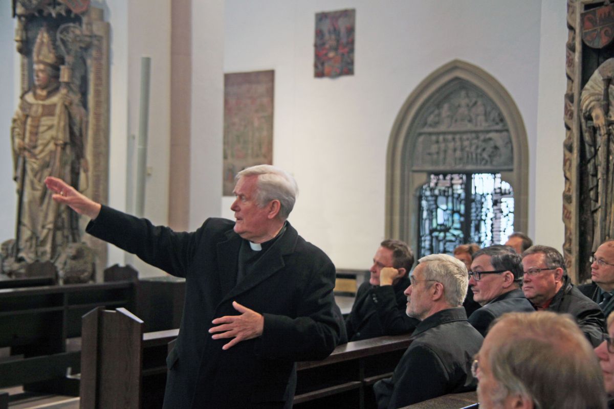 Würzburg (POW) Auf die Bedeutung des katholischen Religionsunterrichts als ordentliches Unterrichtsfach hat Bischof Dr. Friedhelm Hofmann hingewiesen. Erstmals traf er sich am Donnerstag, 21. November, mit rund 50 Oberstudiendirektorinnen und -direktoren der unterfränkischen Gymnasien sowie mit der Ministerialbeauftragten für Gymnasien, Oberstudiendirektorin Monika Zeyer-Müller, zum Gespräch über die Weiterentwicklung des Gymnasiums. Nach einer Führung durch den Kiliansdom diskutierten die Schulleiter mit dem Bischof und mit Schulreferent Domdekan Prälat Günter Putz vor allem über die Situation des G8, über die Ganztagsschule und den Religionsunterricht als Wertefach.