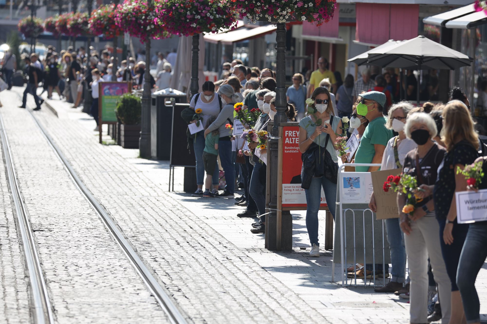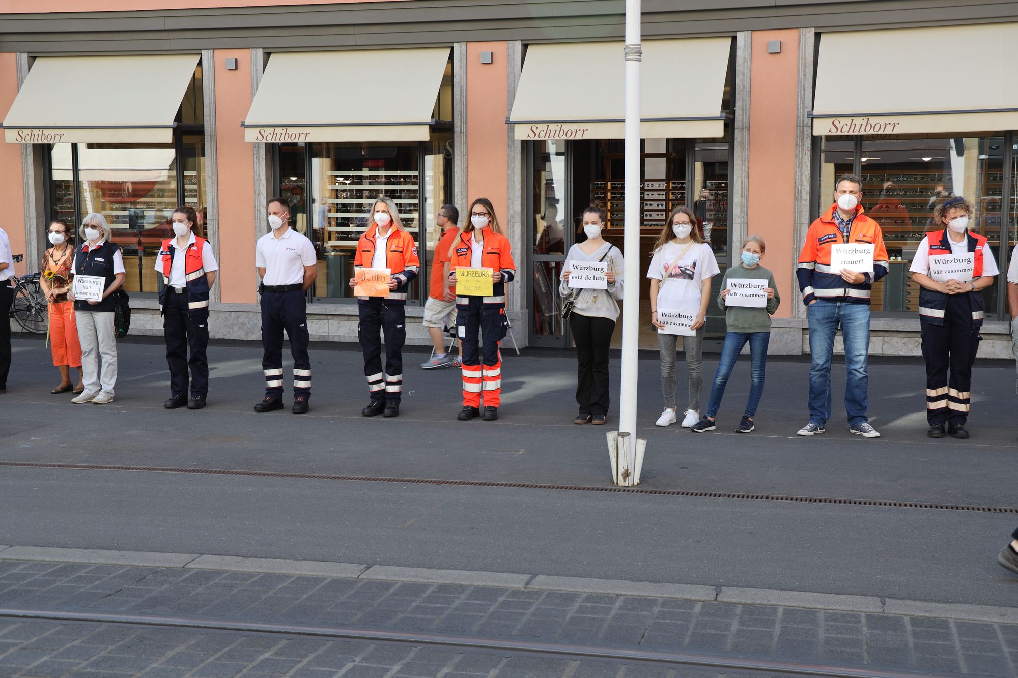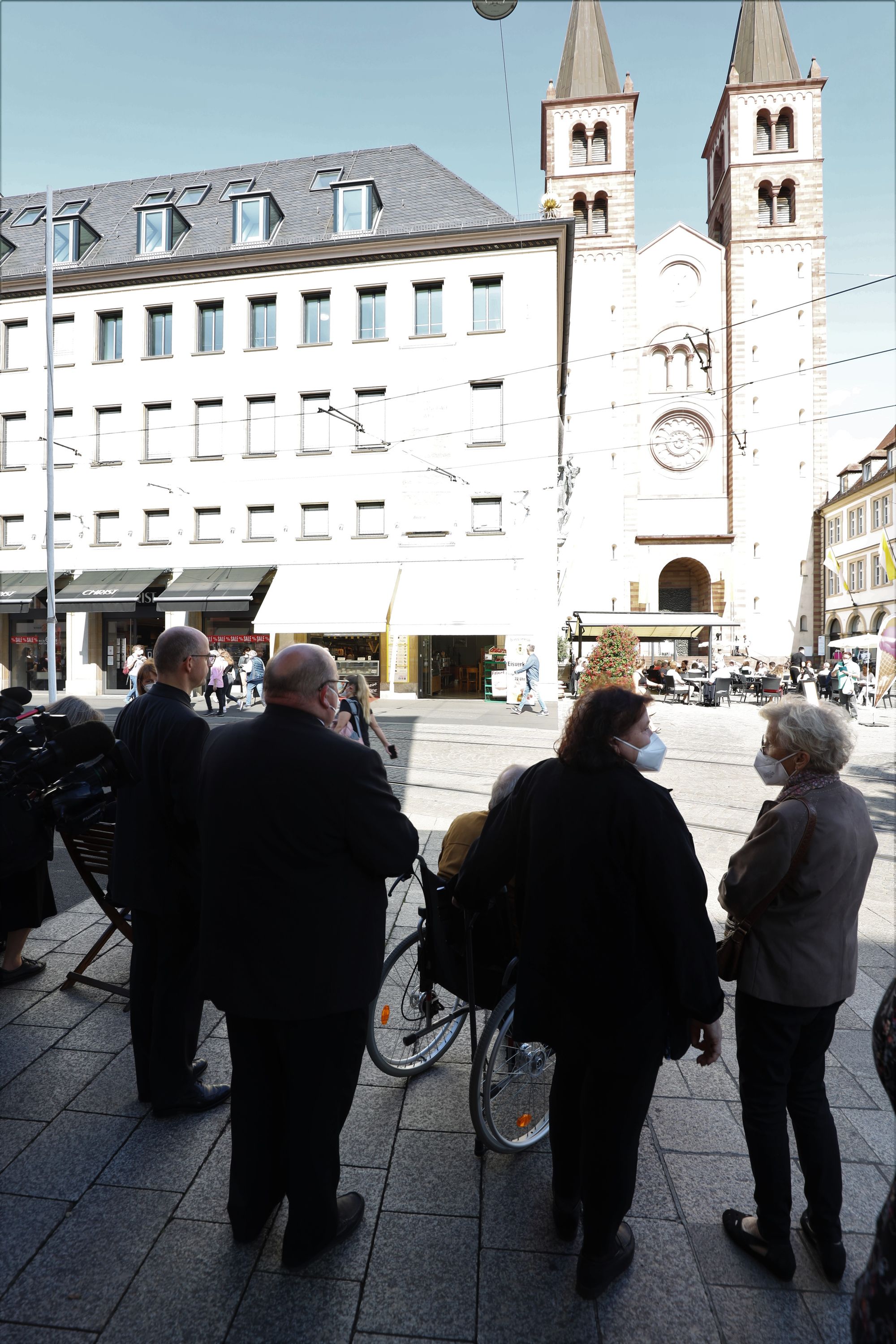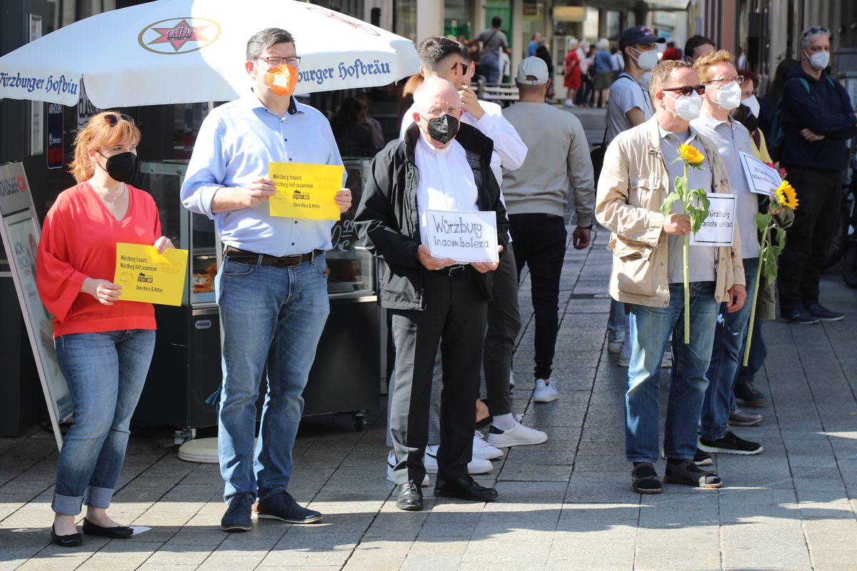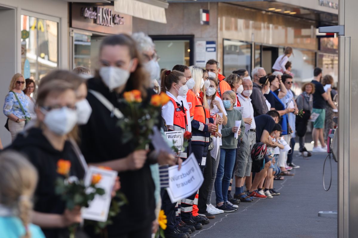 Eine Woche nach der Messerattacke, bei der drei Personen ums Leben kamen, waren die Menschen eingeladen, nach der Gedenkfeier im Dom vom Sonntag noch einmal im öffentlichen, nicht-religiösen Raum zusammenzukommen. Viele Teilnehmer trugen Schilder, auf denen auf Deutsch oder in Fremdsprachen „Würzburg trauert“ und „Würzburg hält zusammen“ stand. Um 17 Uhr läutete die Salvatorglocke des Doms zehn Minuten lang als Aufruf zum Gebet.