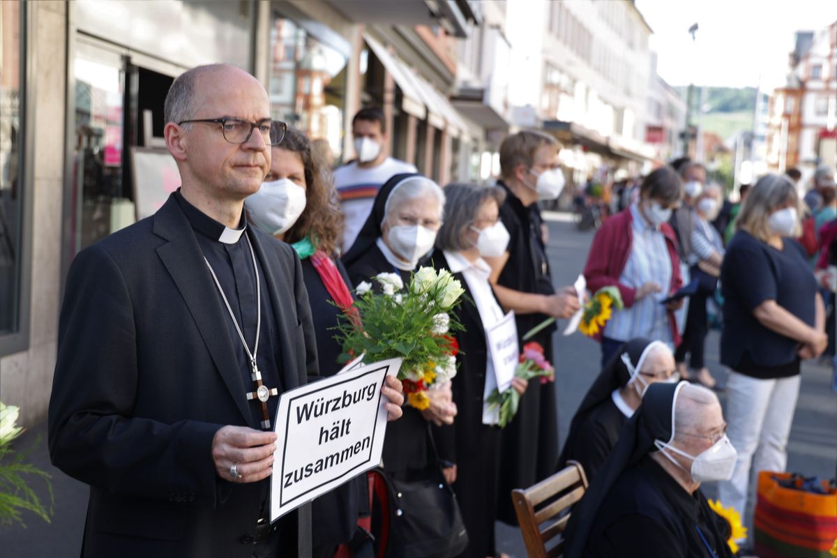Würzburg (POW) In eine Menschenkette vom Barbarossaplatz zum Rathaus hat sich am Freitagabend, 2. Juli, Bischof Dr. Franz Jung eingereiht. Die Veranstaltung mit dem Titel „Würzburg trauert“ fand auf Einladung des Würzburger Bündnisses für Demokratie und Zivilcourage und des Würzburger Ombudsrats statt.