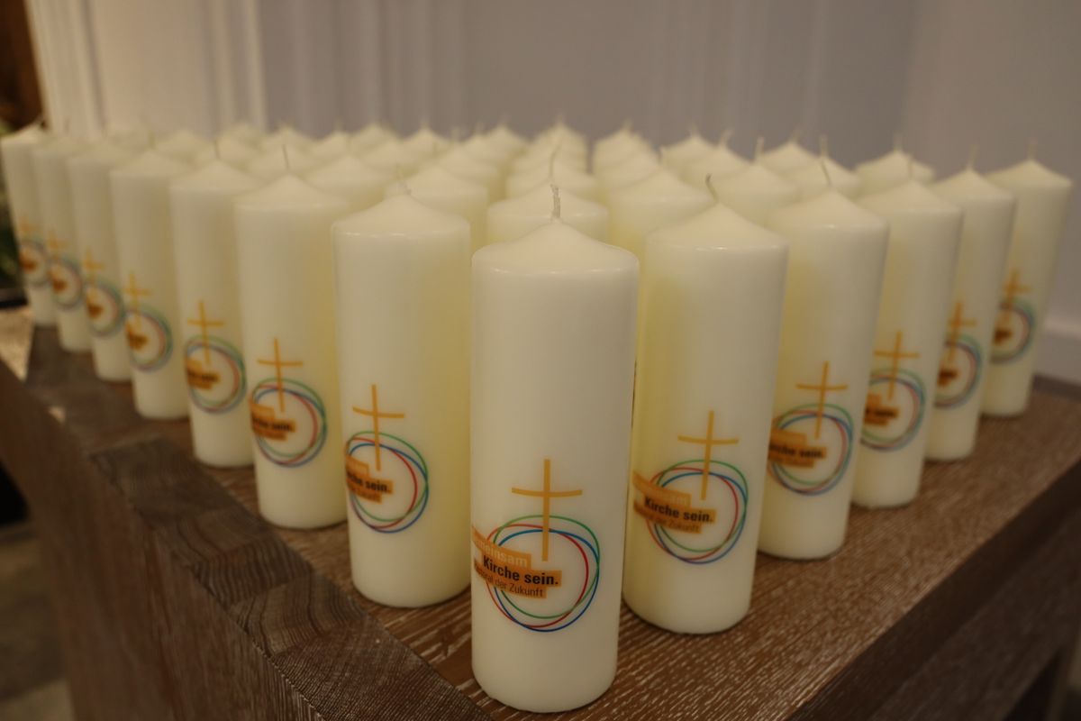 Generalvikar Vorndran erläuterte vor der Übergabe an die Vertreter der Steuerungsgruppen das Motiv auf den Kerzen. Dieses zeigt ein Kreuz, umgeben von drei Kreisen. Diese stehen für die diözesanen Schwerpunkte „kontemplativ leben“, „sprachfähig werden im Glauben“ und „solidarisch handeln“.