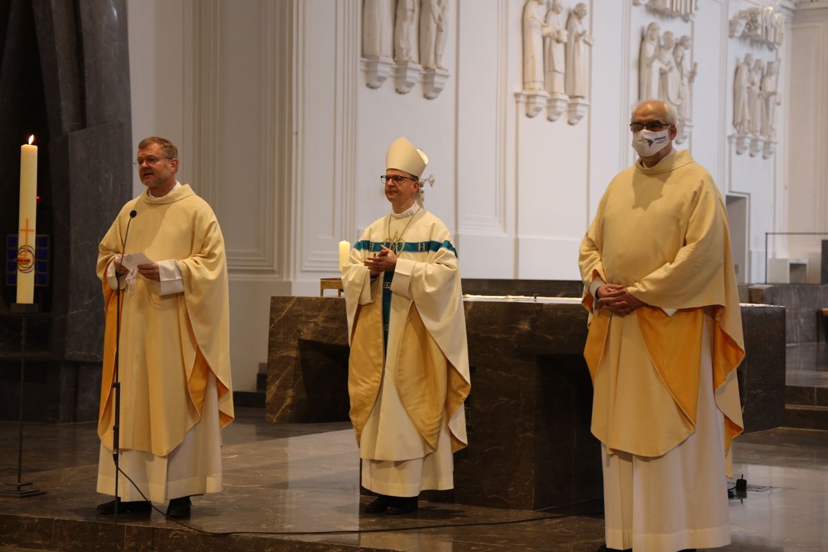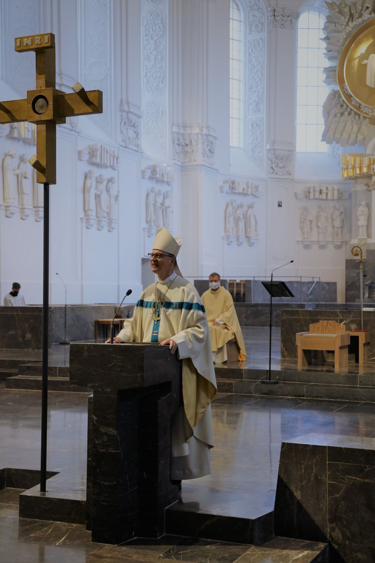 Sich an der Gottesmutter als Vorbild zu orientieren, bedeute auch zu fragen: „Wo verkünden wir den Menschen die Frohe Botschaft vom nahen Gott? Wo helfen wir durch den Dienst am Nächsten, dass das neue Jerusalem sichtbare Kontur gewinnt als Ort gelebter Gottes- und Nächstenliebe?“ Ausdrücklich warnte der Bischof davor, in das alte Lied zurückzufallen und darauf zu schauen, was nicht gehe. „Die Freude erwächst aus dem Glauben an die Größe des Herrn, der unserer Schwachheit aufhilft.“ Gegen allen Kleinmut und alle Erfahrungen von Scheitern und Ohnmacht helfe der Blick auf Maria. „Weil Gott an das Gute im Menschen glaubt und ihm Großes zutraut, deshalb dürfen wir unverzagt ans Werk gehen.“