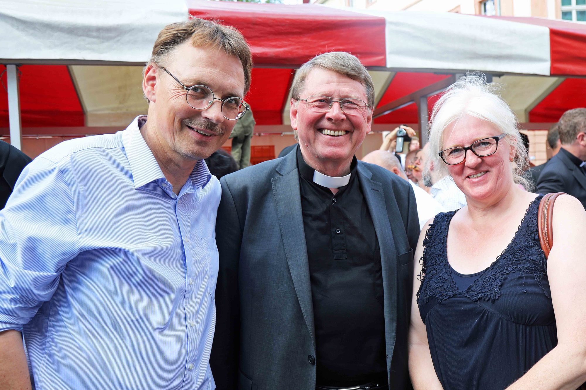 Pastoralreferent Michael Hanft, Krankenhausseelsorger an der Missionsärztlichen Klinik in Würzburg und im Würzburger König-Ludwig-Haus, und Monika Bandorf-Hanft (Güntersleben): „Der Gottesdienst war sehr ansprechend“, sagt Monika Bandorf-Hanft. Sie sei auch bei der Amtseinführung von Bischof Dr. Friedhelm Hofmann im Jahr 2004 gewesen und findet, dass die Feier „volksnäher“ geworden sei. „Es hat mich beeindruckt, dass alle Altersstufen da waren. Das ist doch ein ermutigendes Zeichen.“ Für Michael Hanft war einer der „ergreifendsten Momente“, als das Kilianslied vor der Kiliansgruft gesungen wurde. Sehr gut gefällt ihm auch die Atmosphäre auf dem Kiliansplatz, die „sehr fröhlich und voller Vorfreude“ sei. „Es ist wunderschön, dass eine solche Begegnung hier möglich ist“, ergänzt Dompropst Reinhold Pfafferodt (Magdeburg). „Ich habe mich hier sehr wohl gefühlt. Der neue Bischof strahlt viel Hoffnung aus, das finde ich wichtig.“